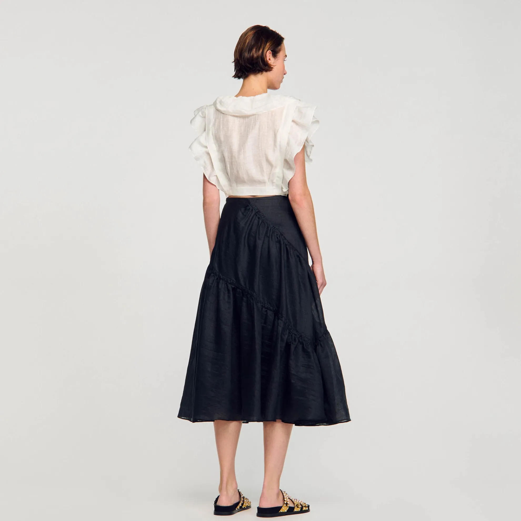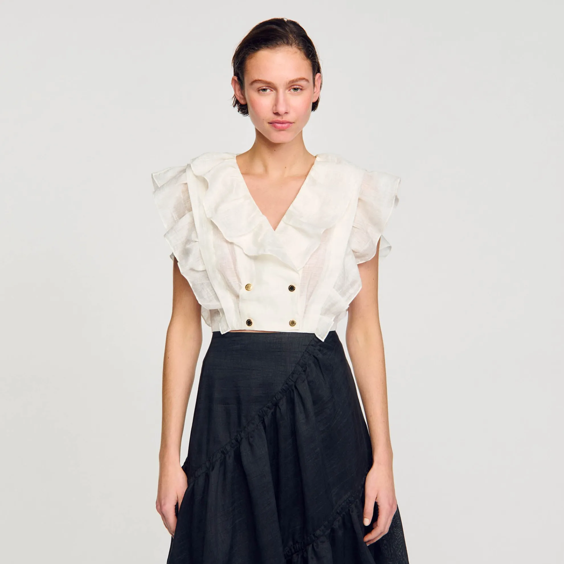 Korte, mouwloze top met brede volants, een gekruiste V-hals en drukknopen.