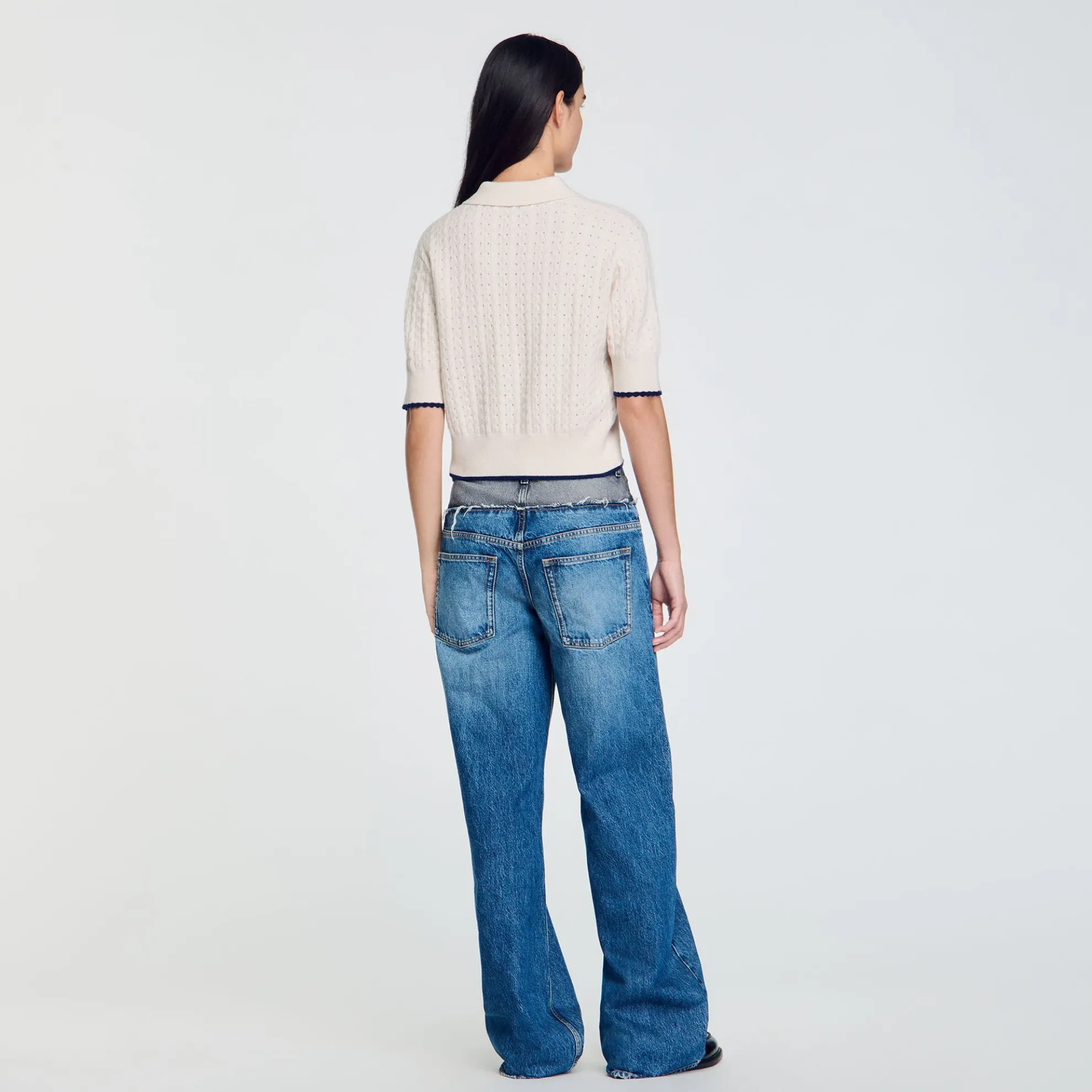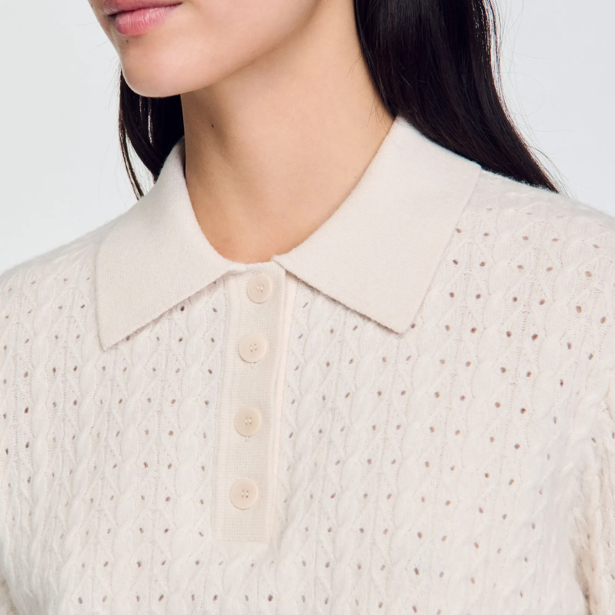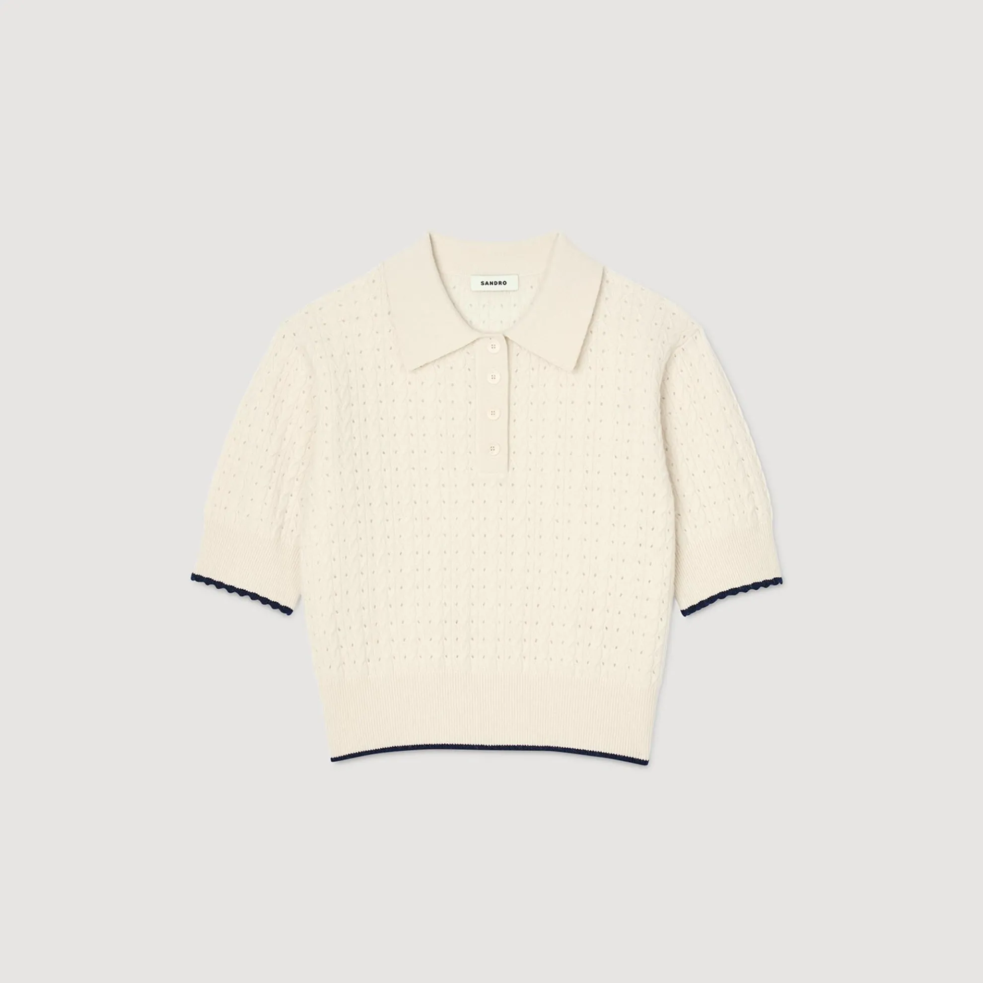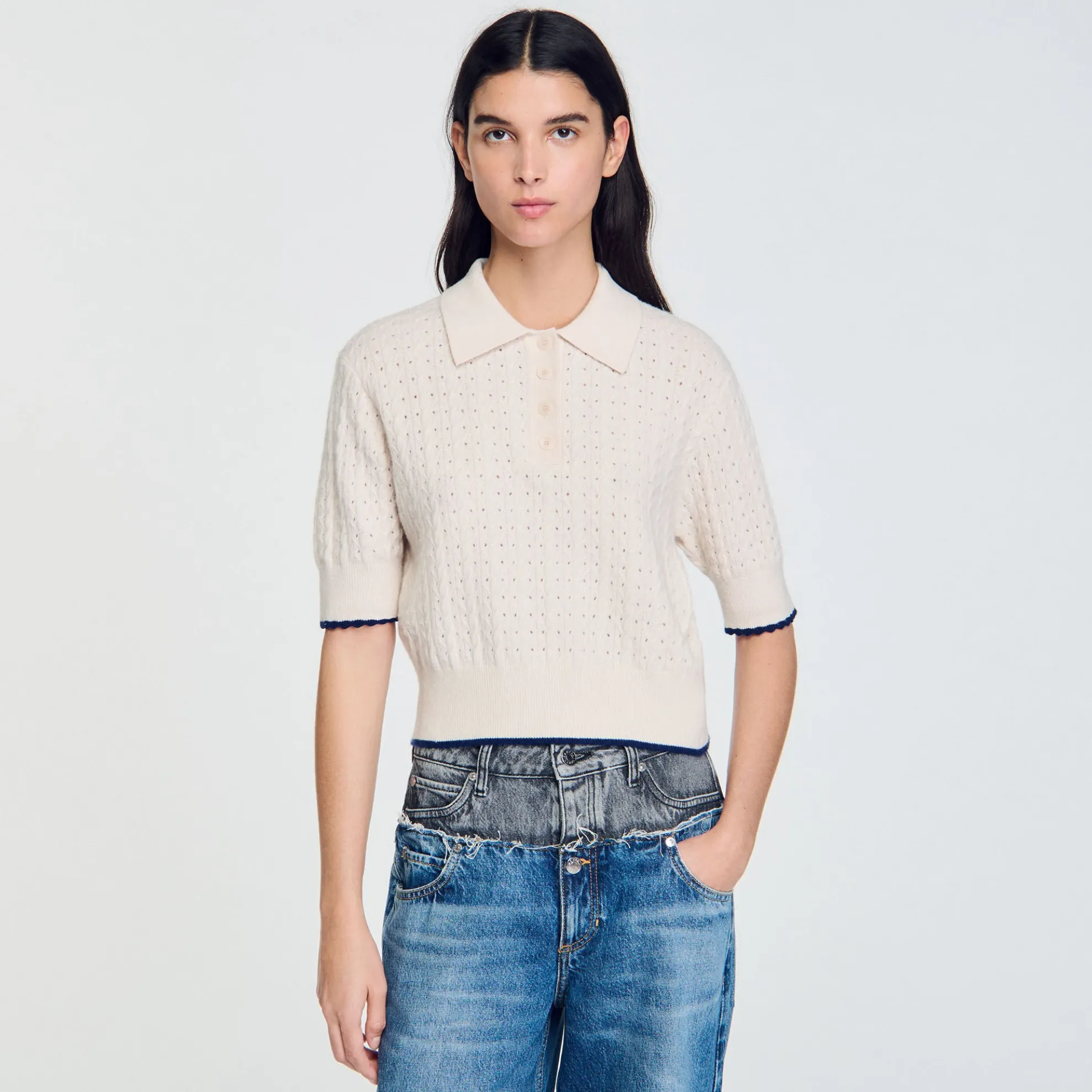 Korte trui met pointellesteek van wol en kasjmier, voorzien van een polokraag, korte mouwen en een contrasterende bies.