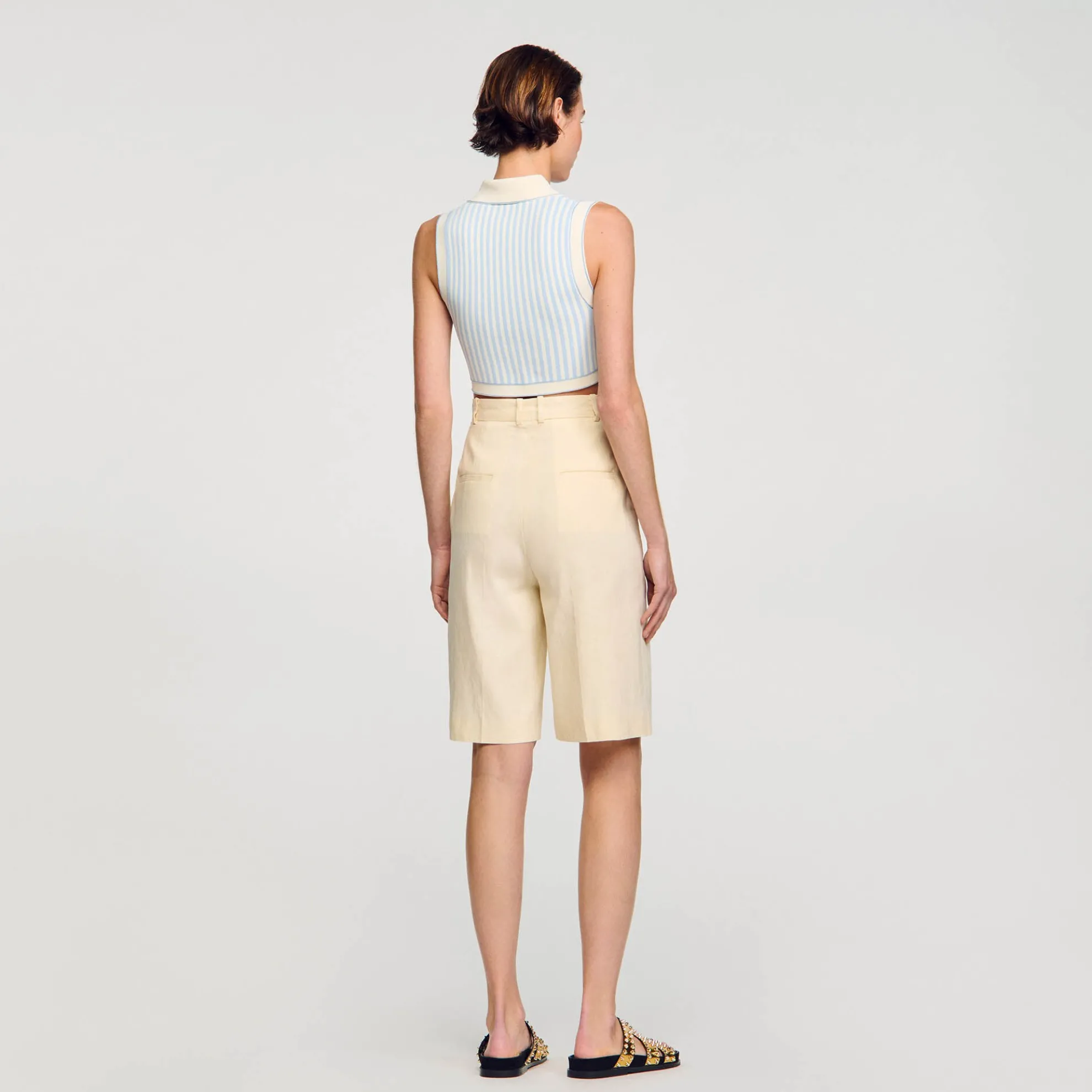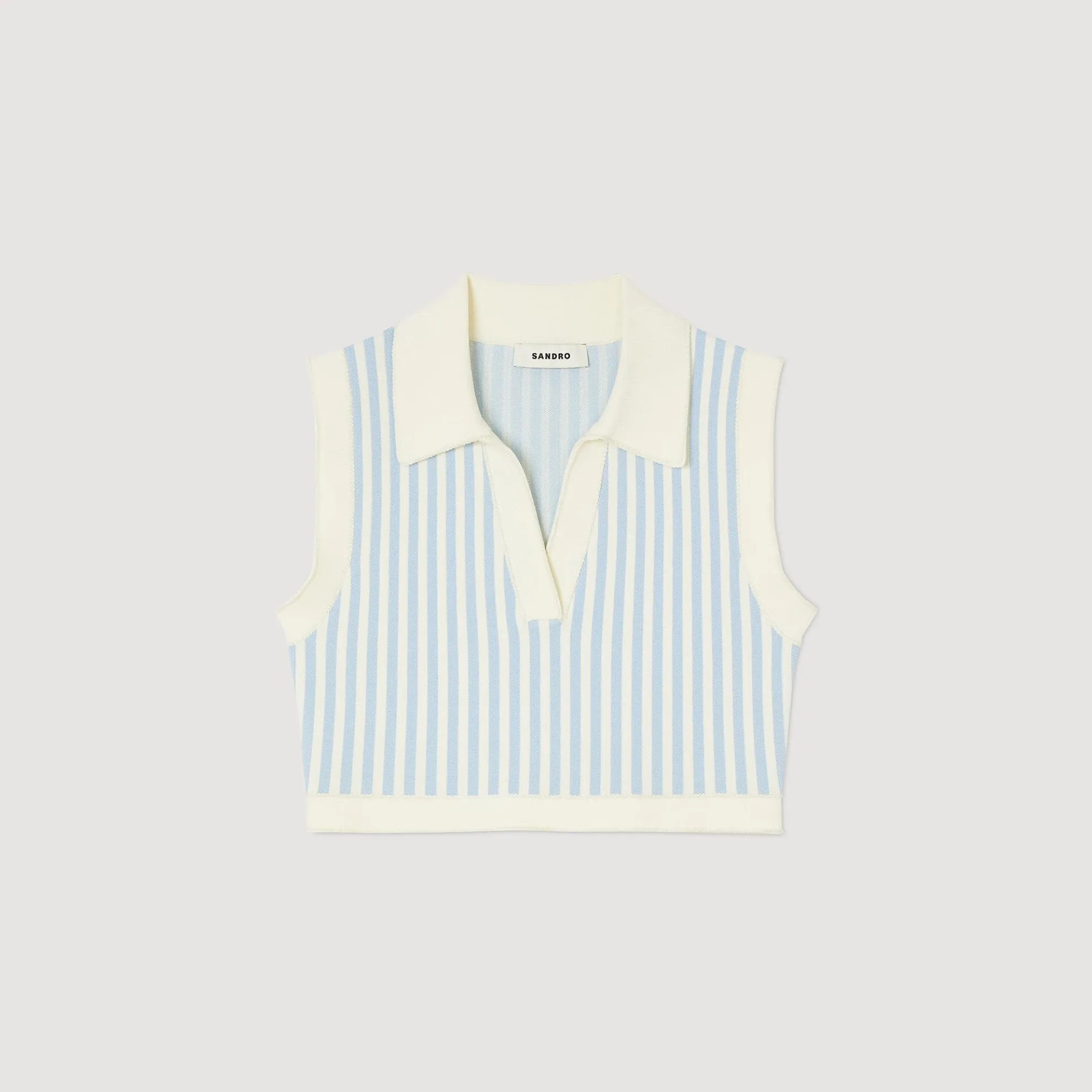 Korte mouwloze trui met strepen, open polokraag en contrasterende randen.