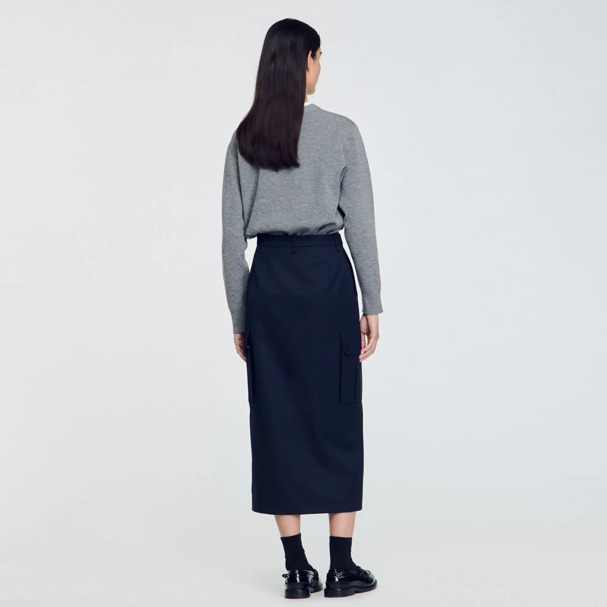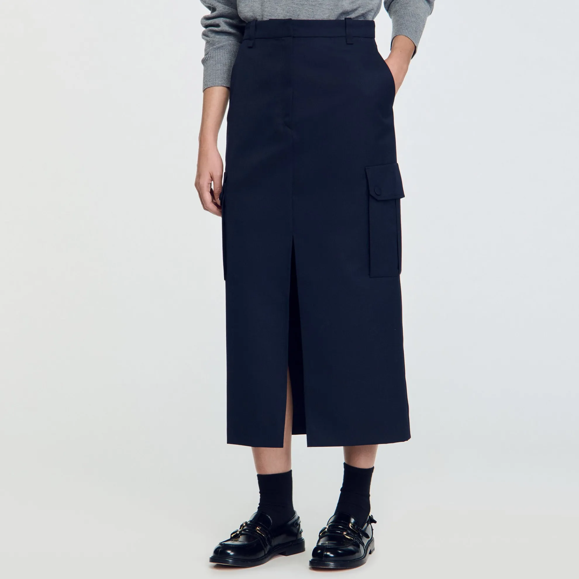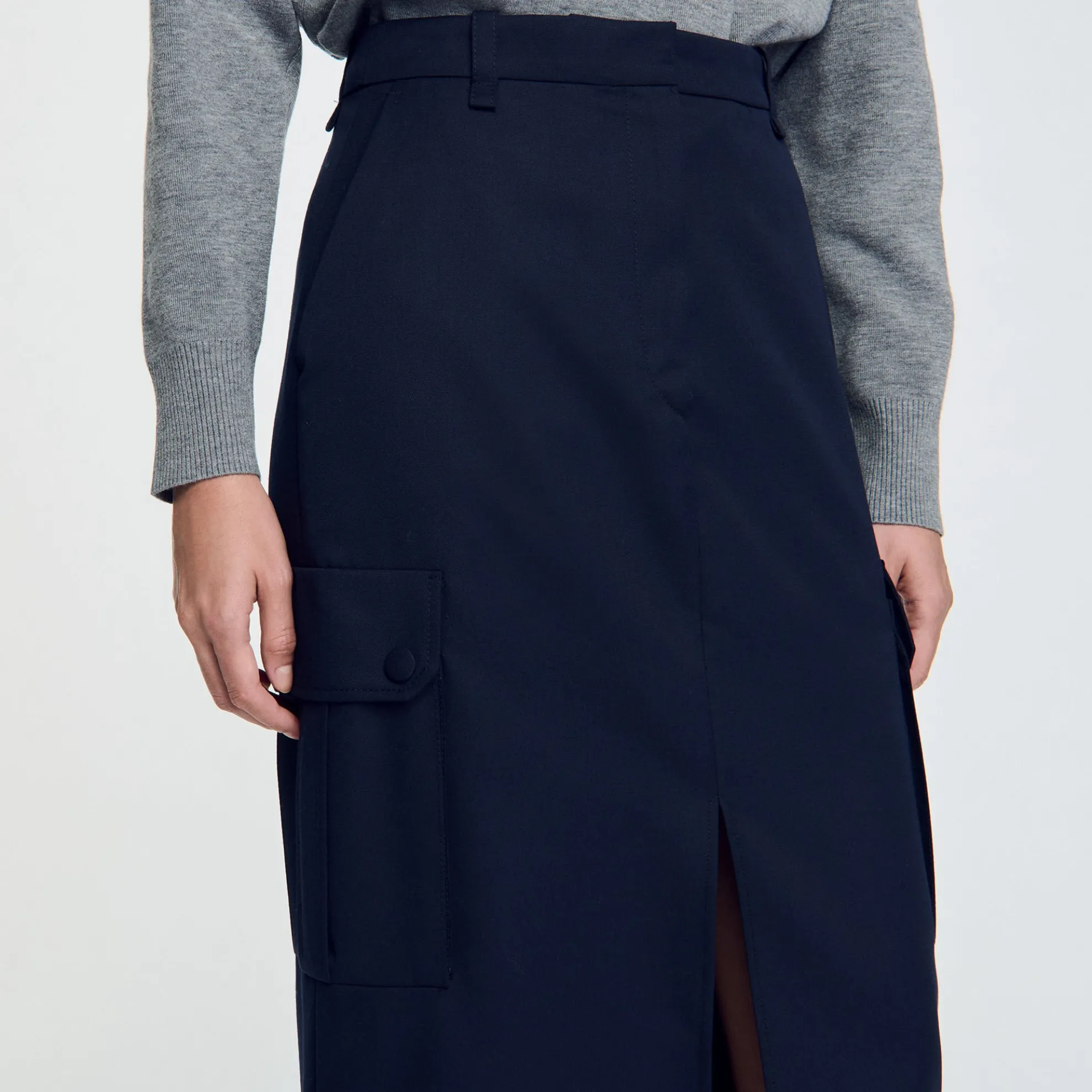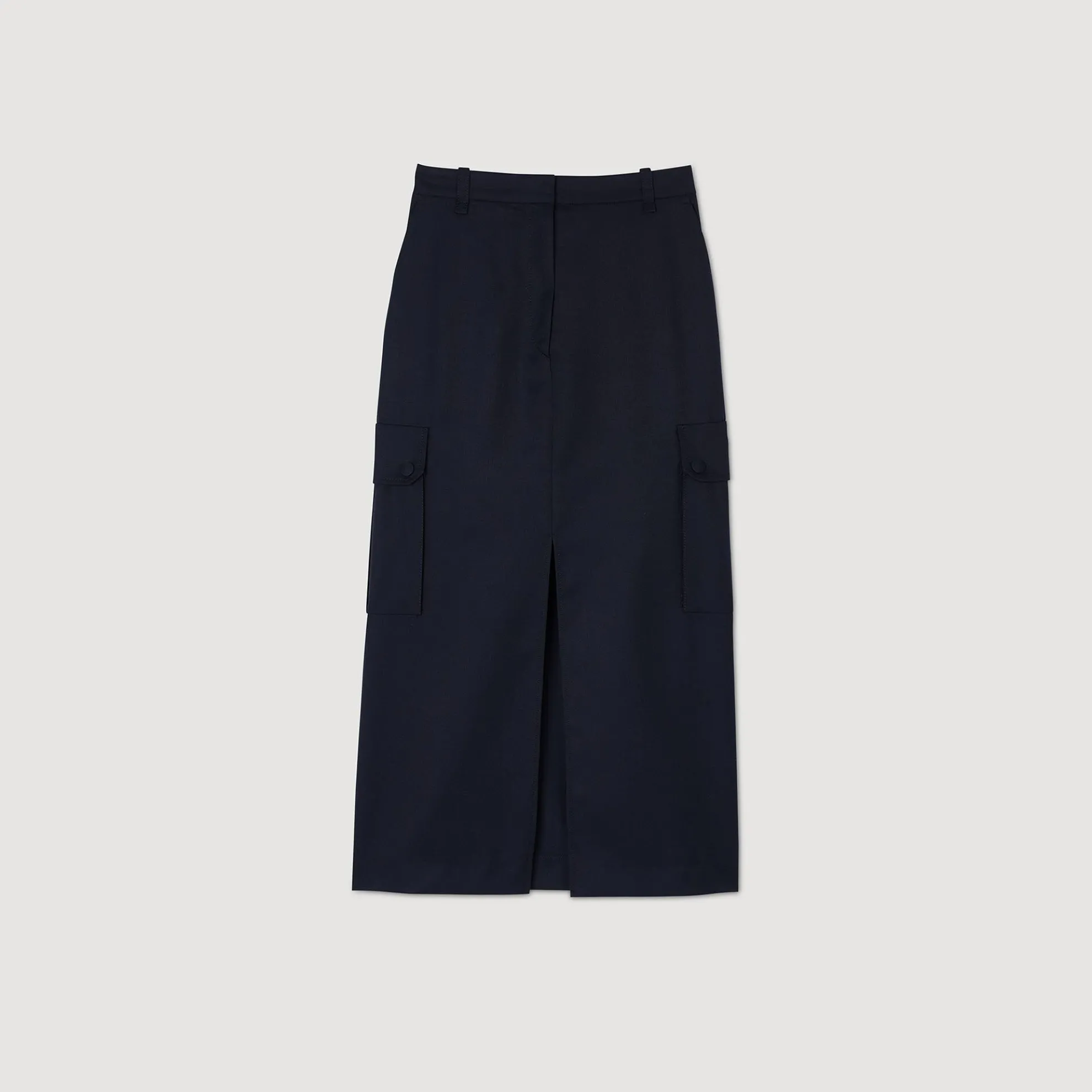 Lange rok in cargostijl met grote zijzakken met drukknopen en split aan de voorkant.