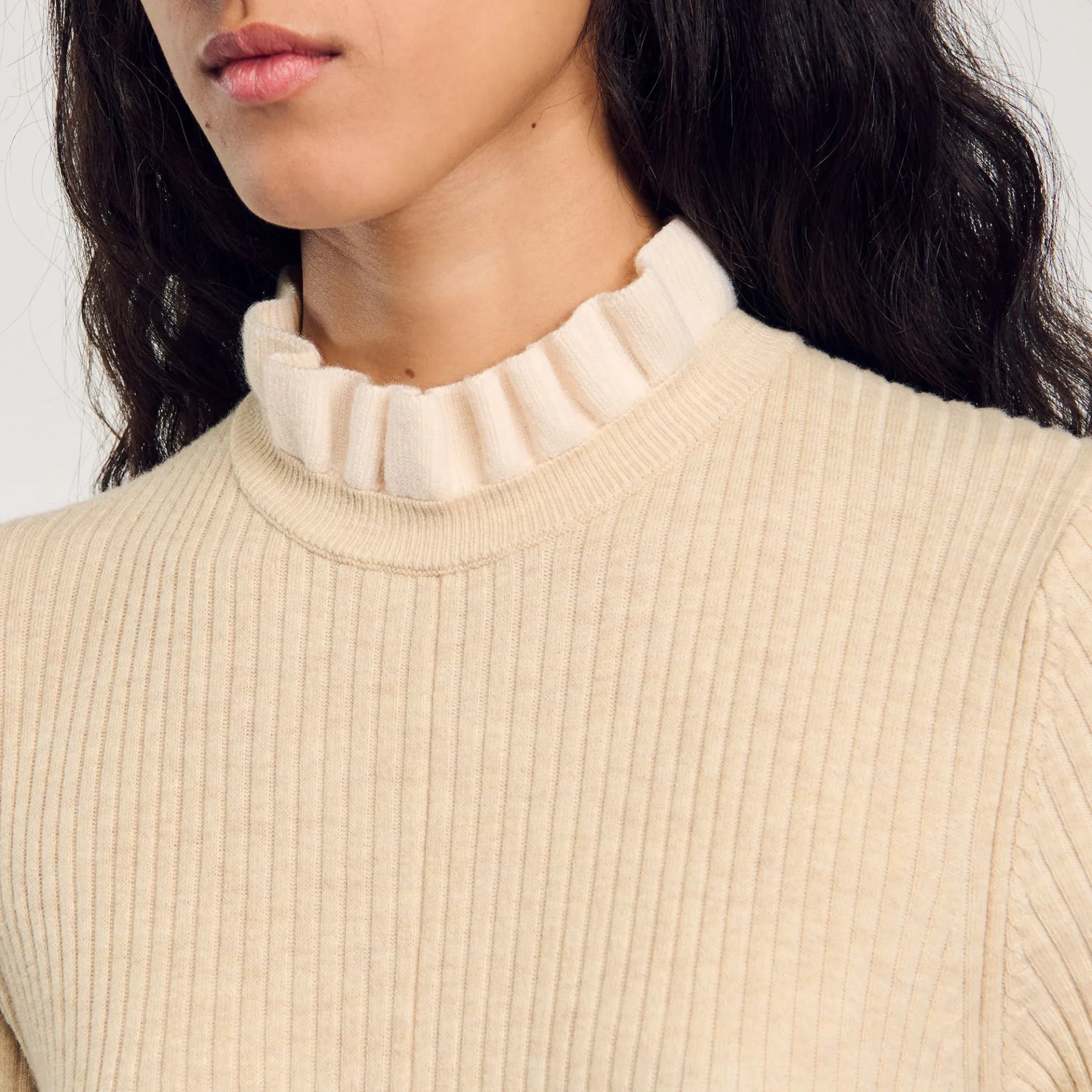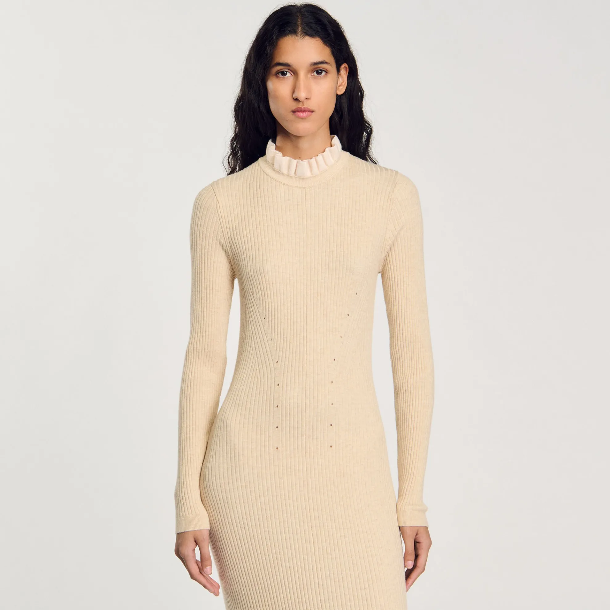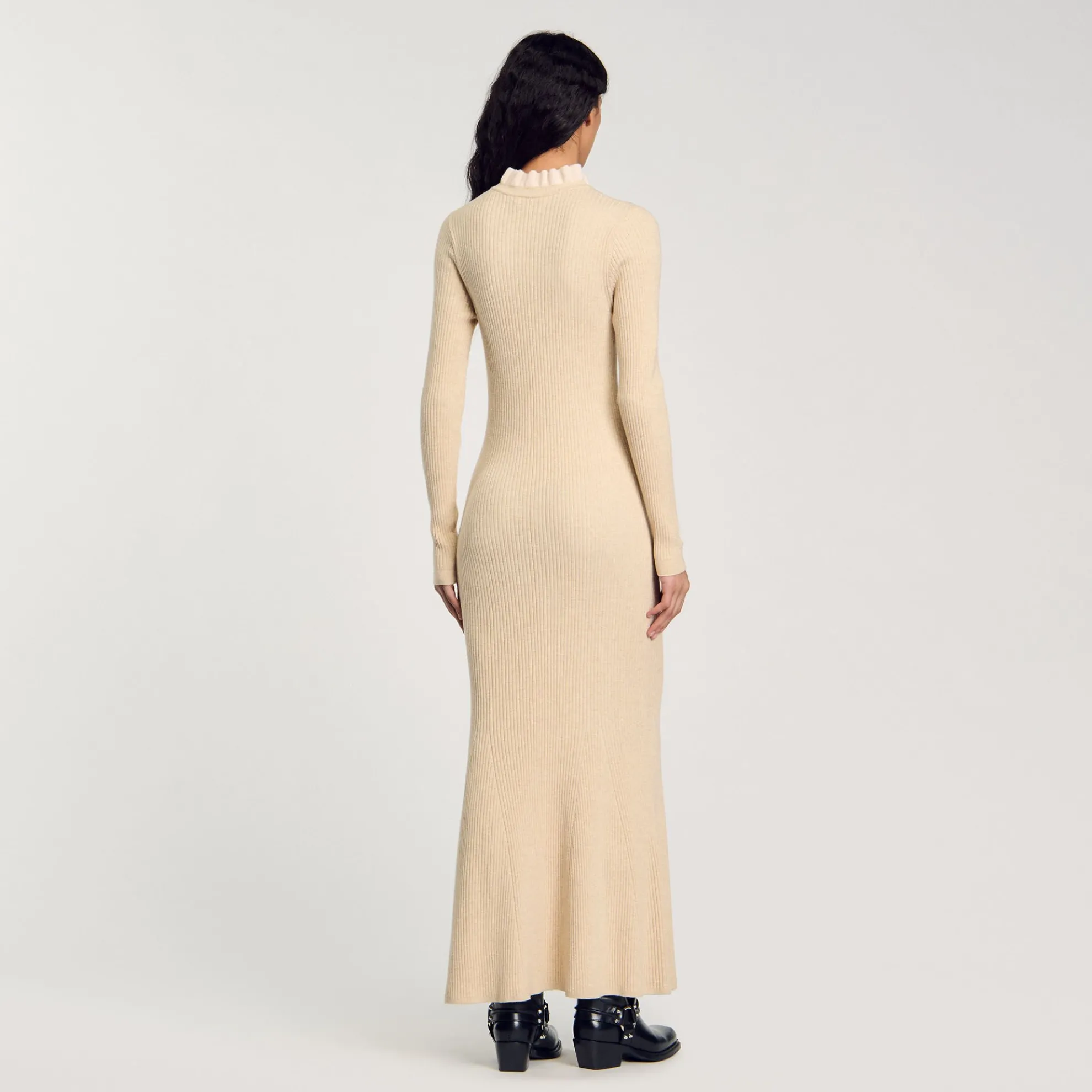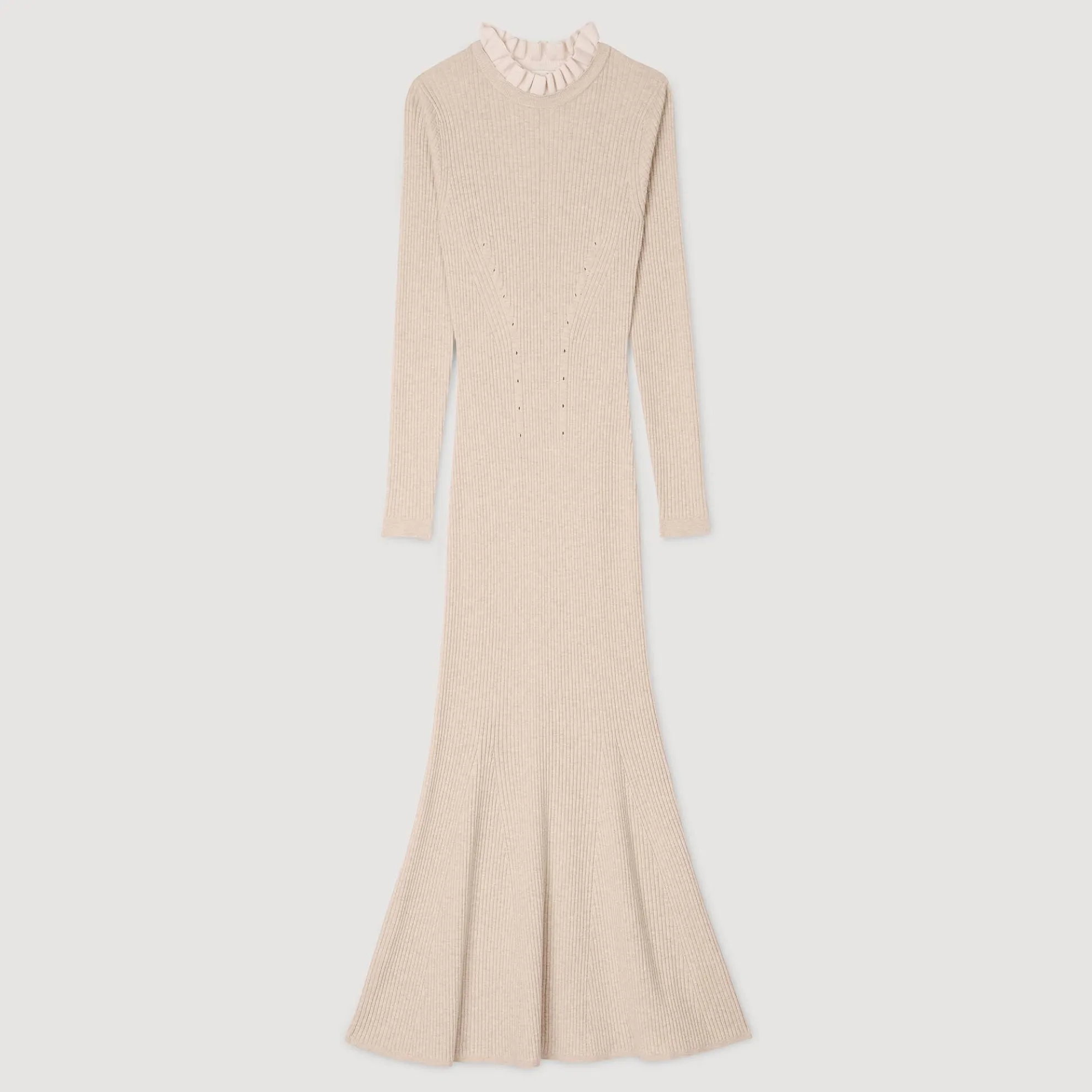 Lange jurk van ribtricot met een contrasterende kraag met ruches, lange mouwen, en een uitlopende rok.