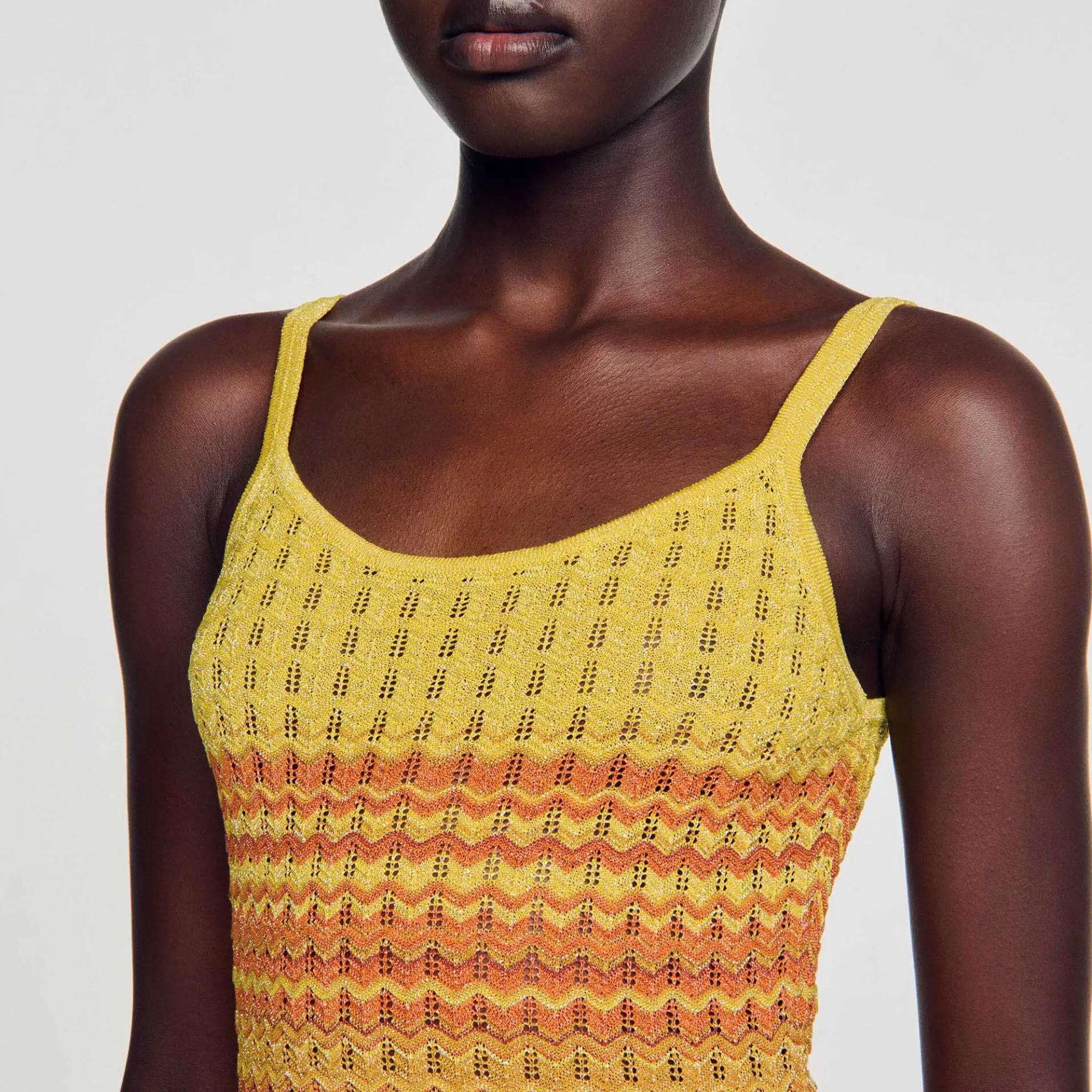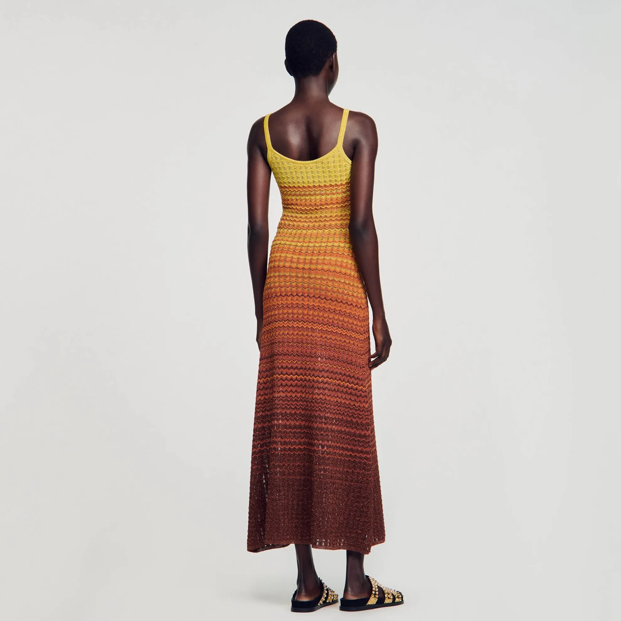 Lange jurk pointillé gebreid met kleurverloop en zigzagmotief, dunne bandjes en een ronde halslijn.