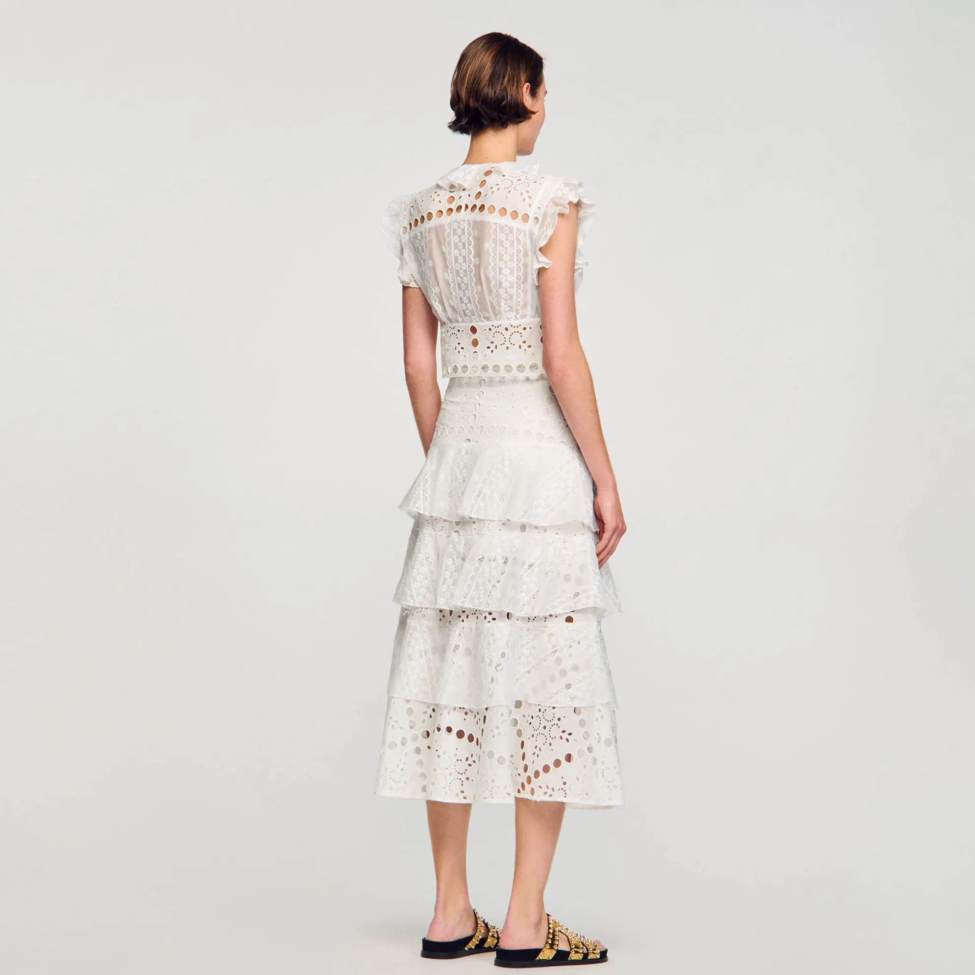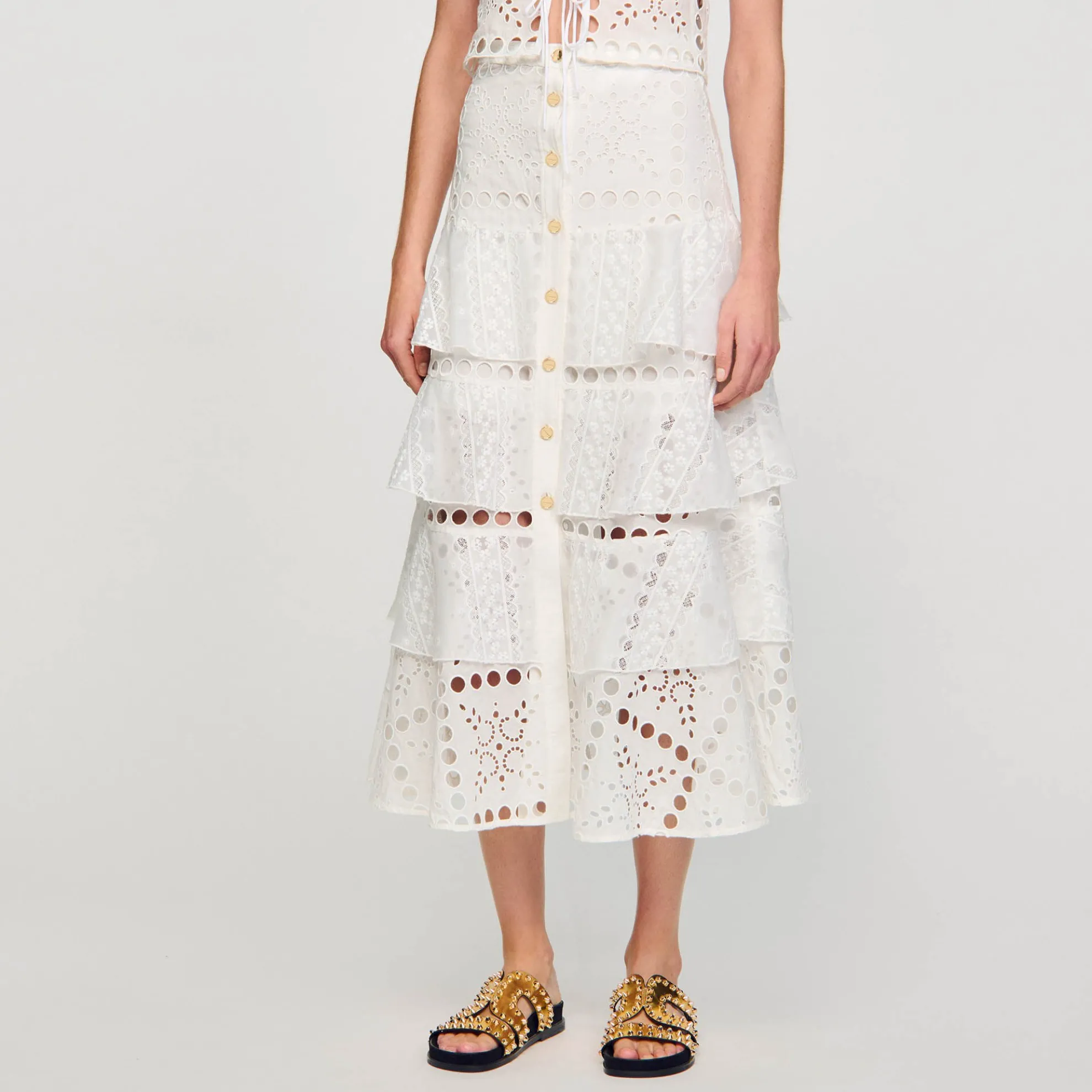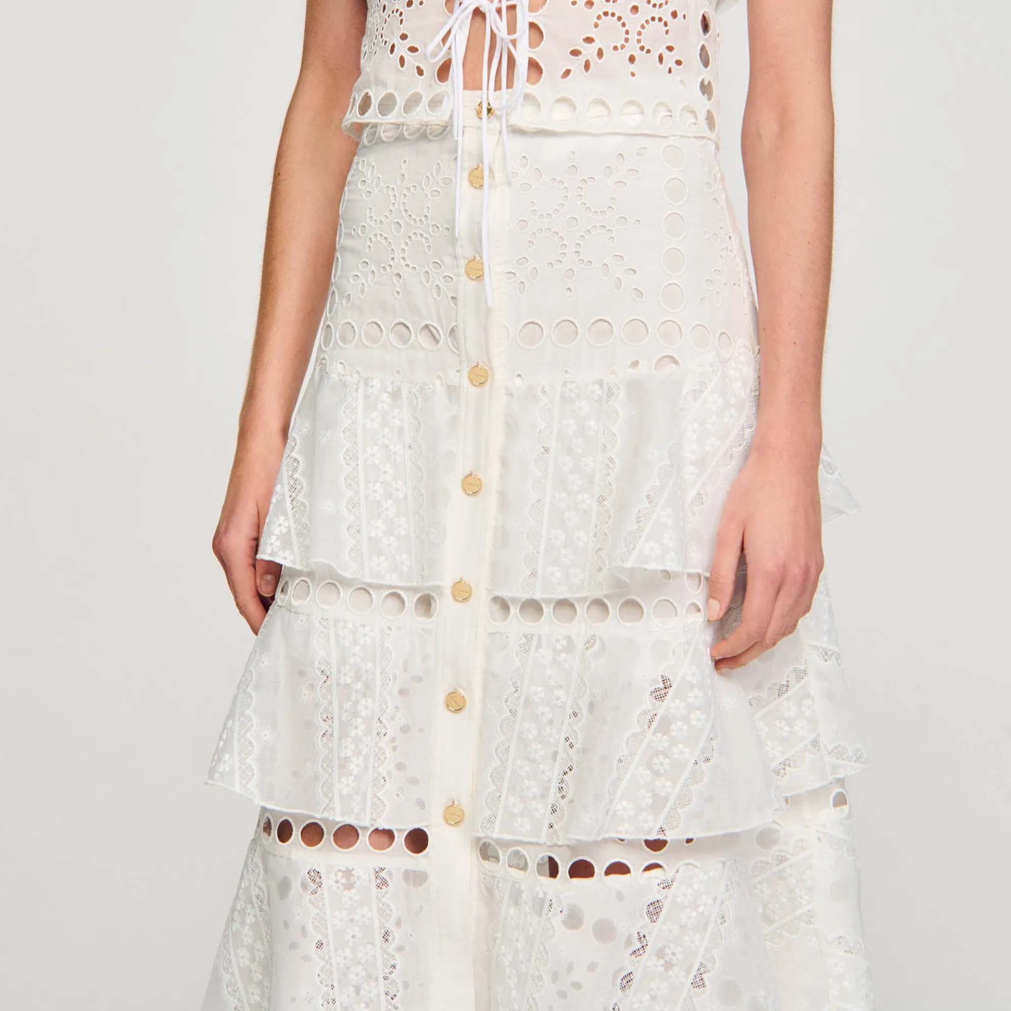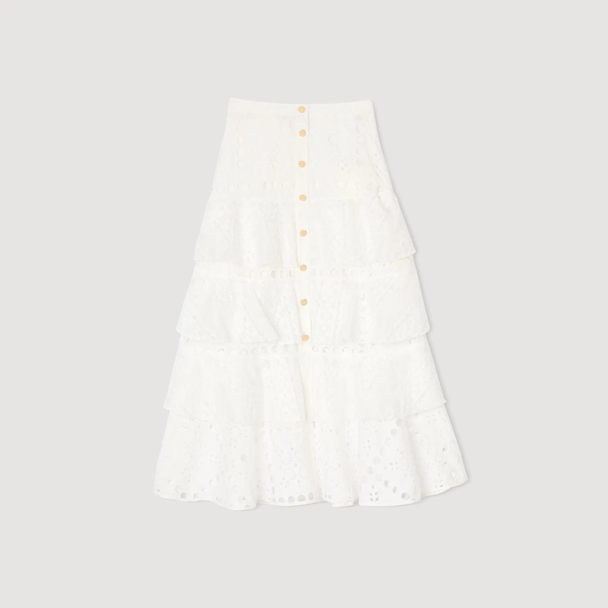 Lange rok met volants versierd met opengewerkt Engels borduurwerk en kanten strepen, knoopsluiting en split aan de voorkant.