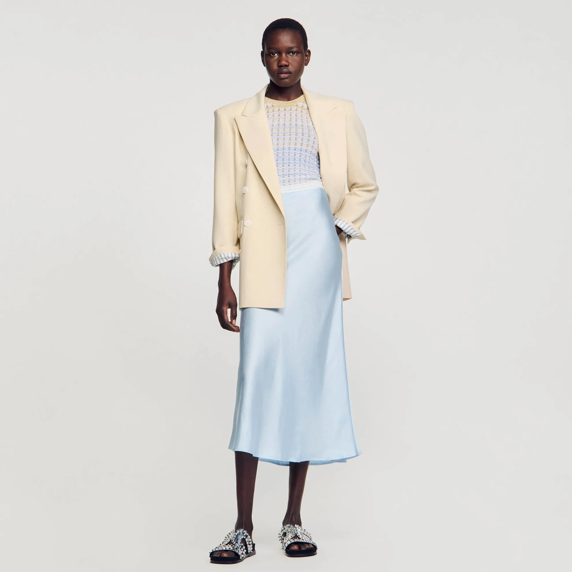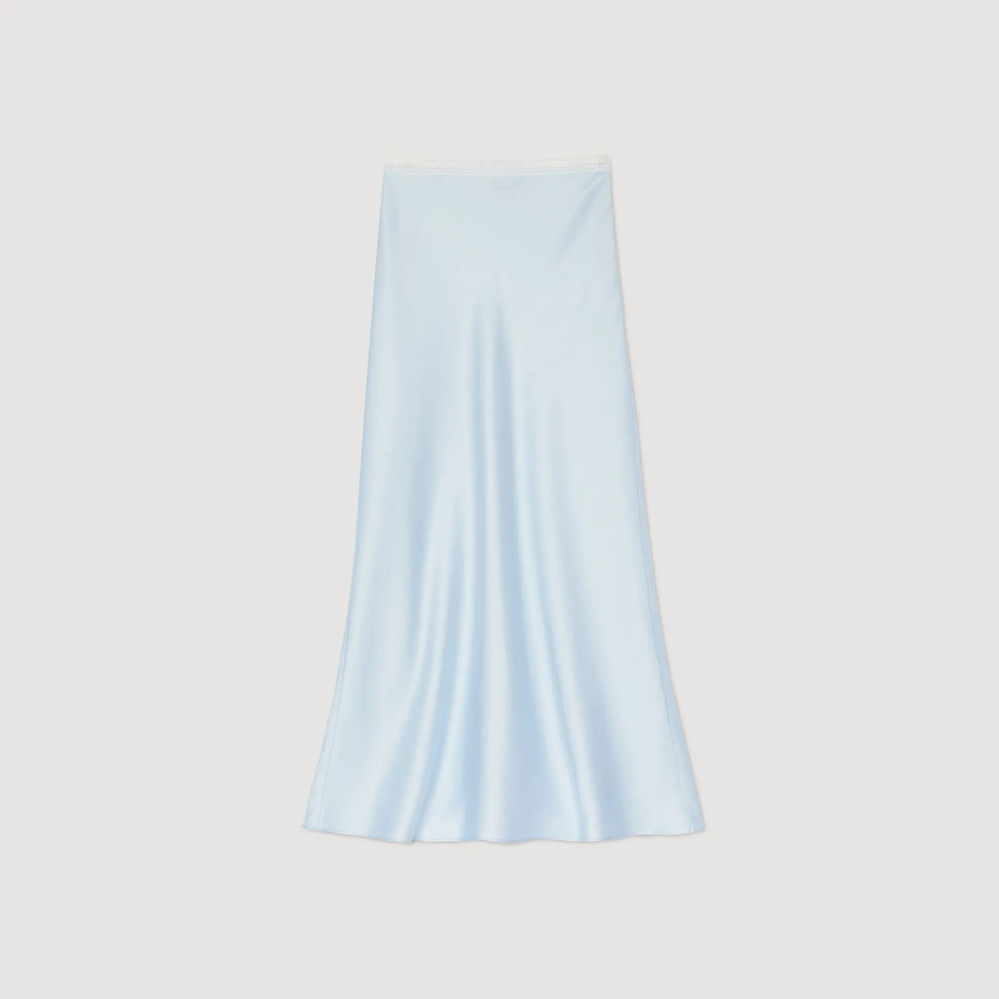 Rechte soepelvallende rok van mix van satijn en linnen met een kanten SANDRO ceintuur in de taille.