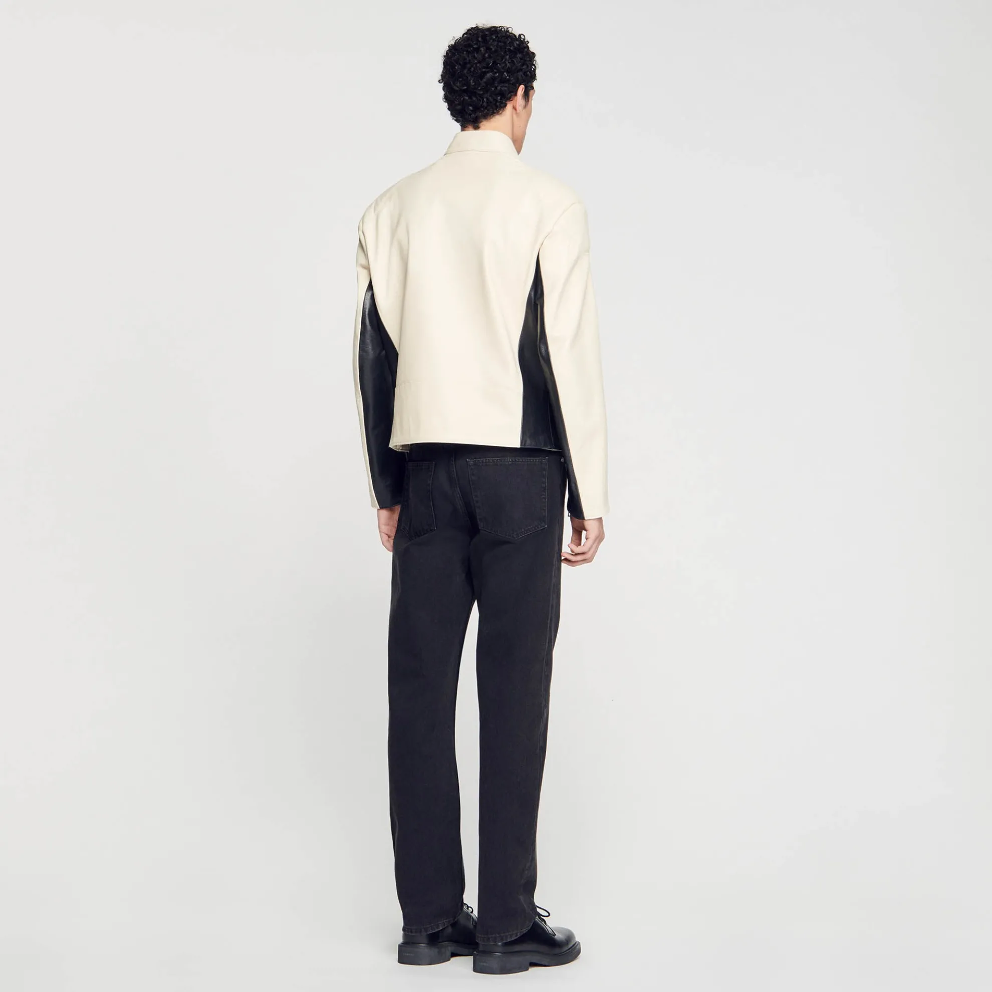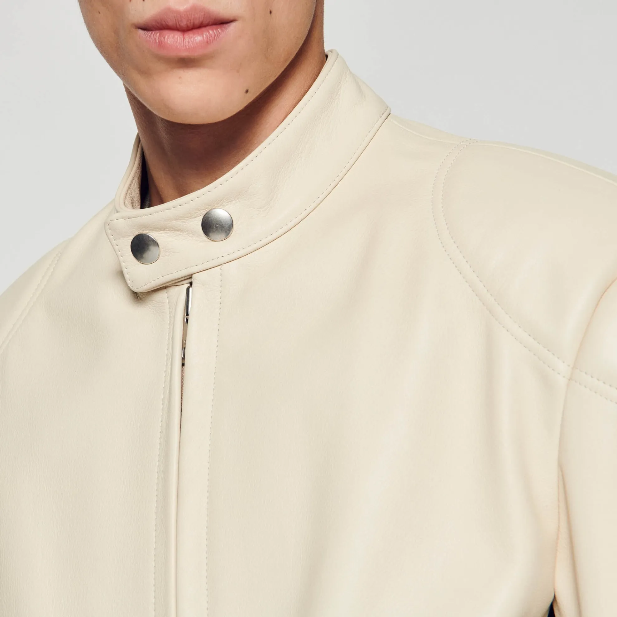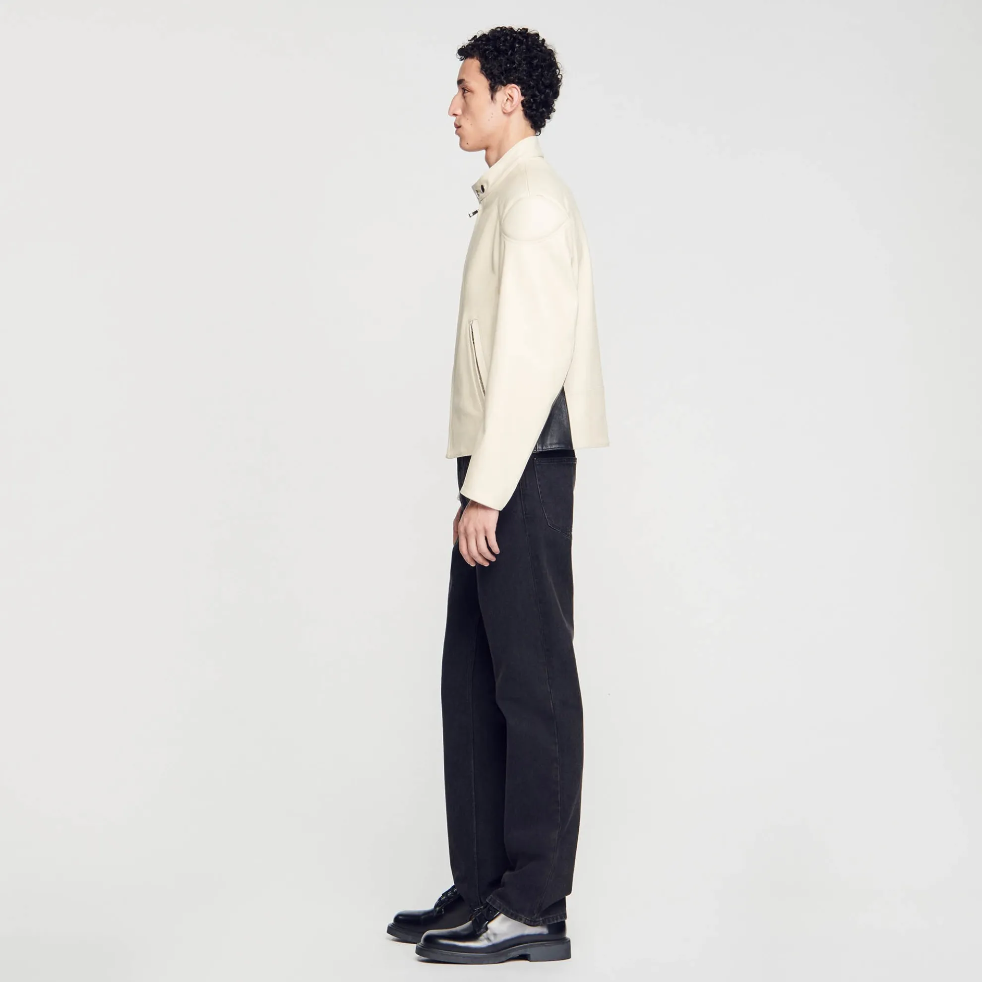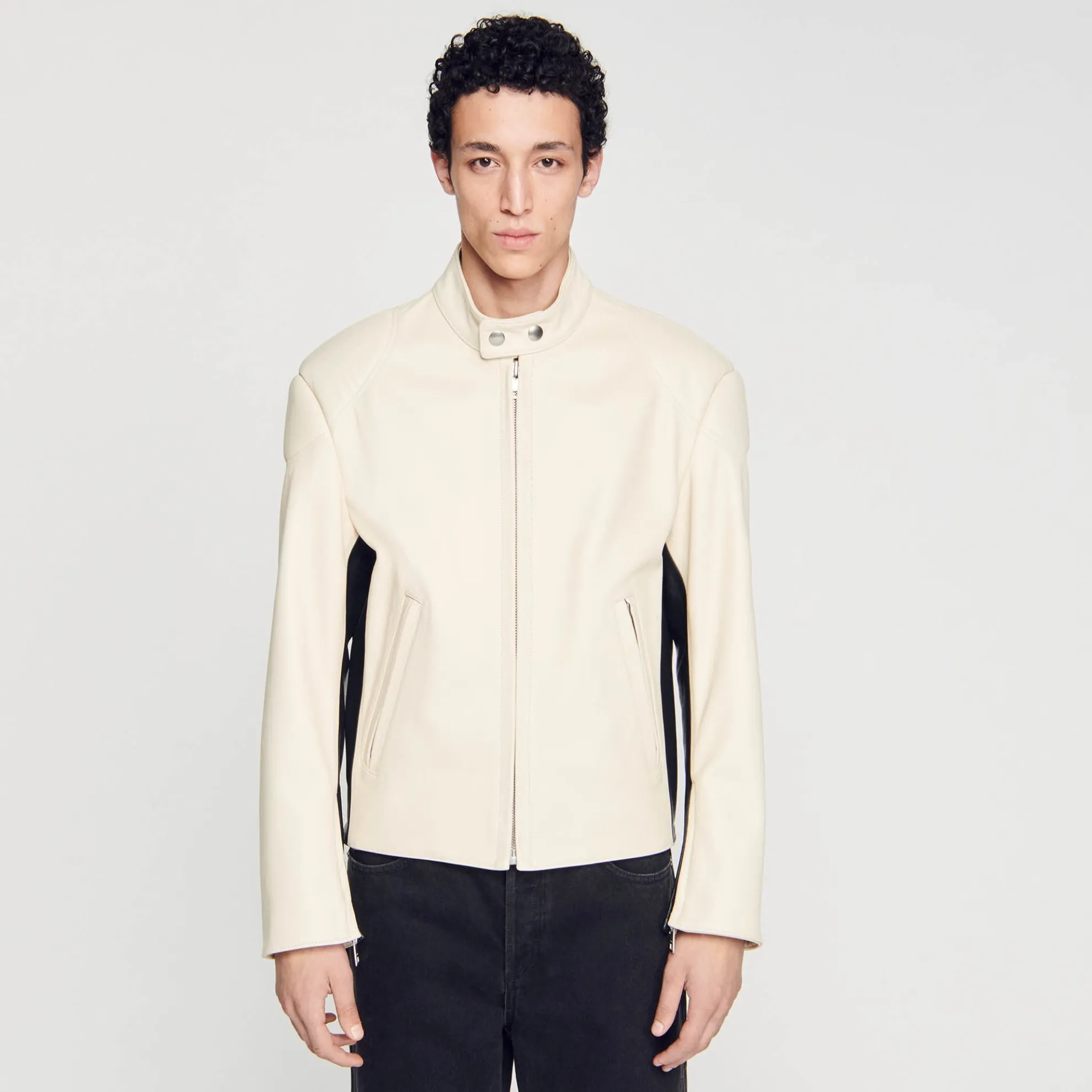 Leren bikerjack met contrasterende inzetstukken, ritssluiting, opstaande kraag met drukknoop, lange mouwen met manchetten met ritssluiting en zakken aan de voorkant.