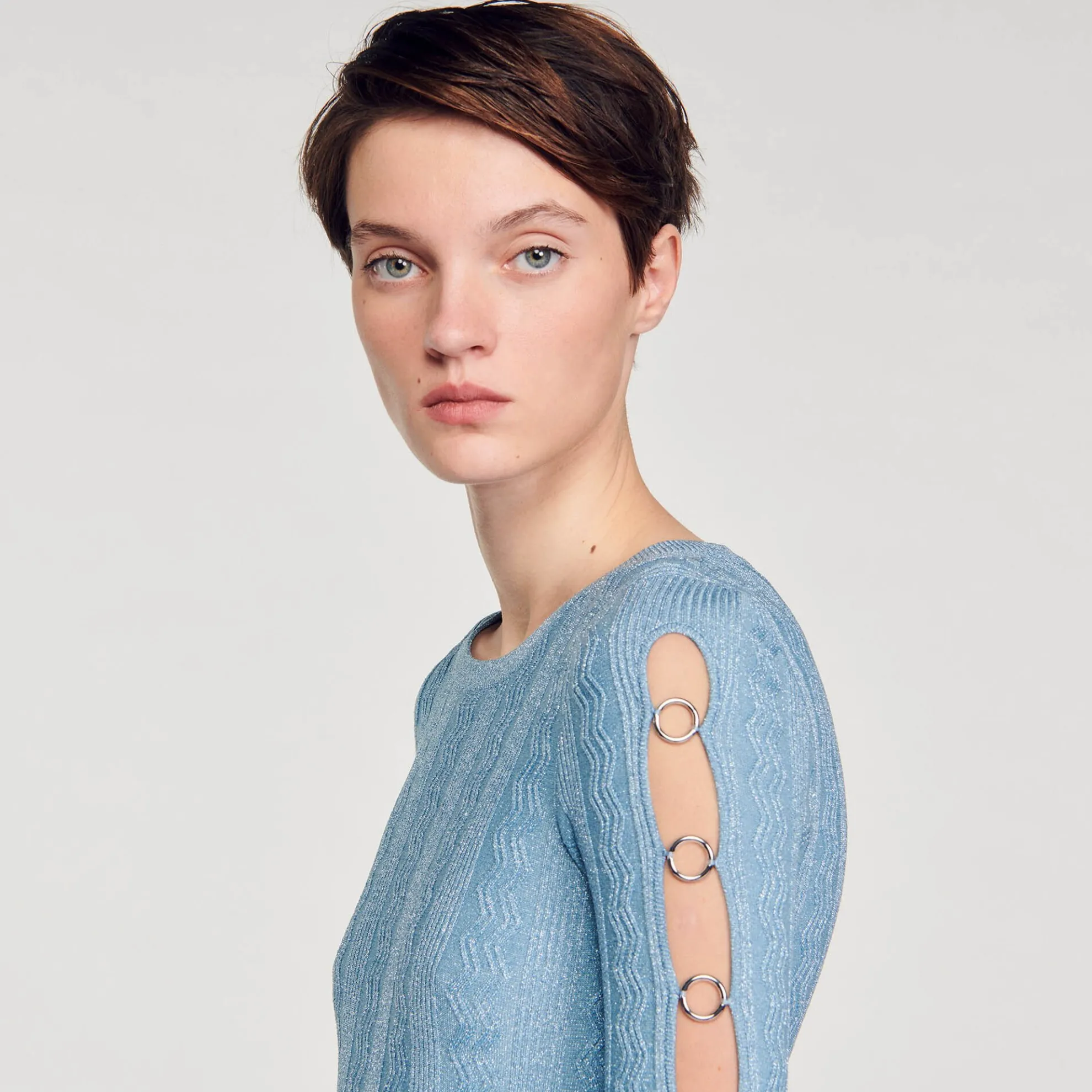 Kabelgebreide midi jurk iriserend met ronde hals en lange mouwen versierd met metalen ringen op de mouwen.