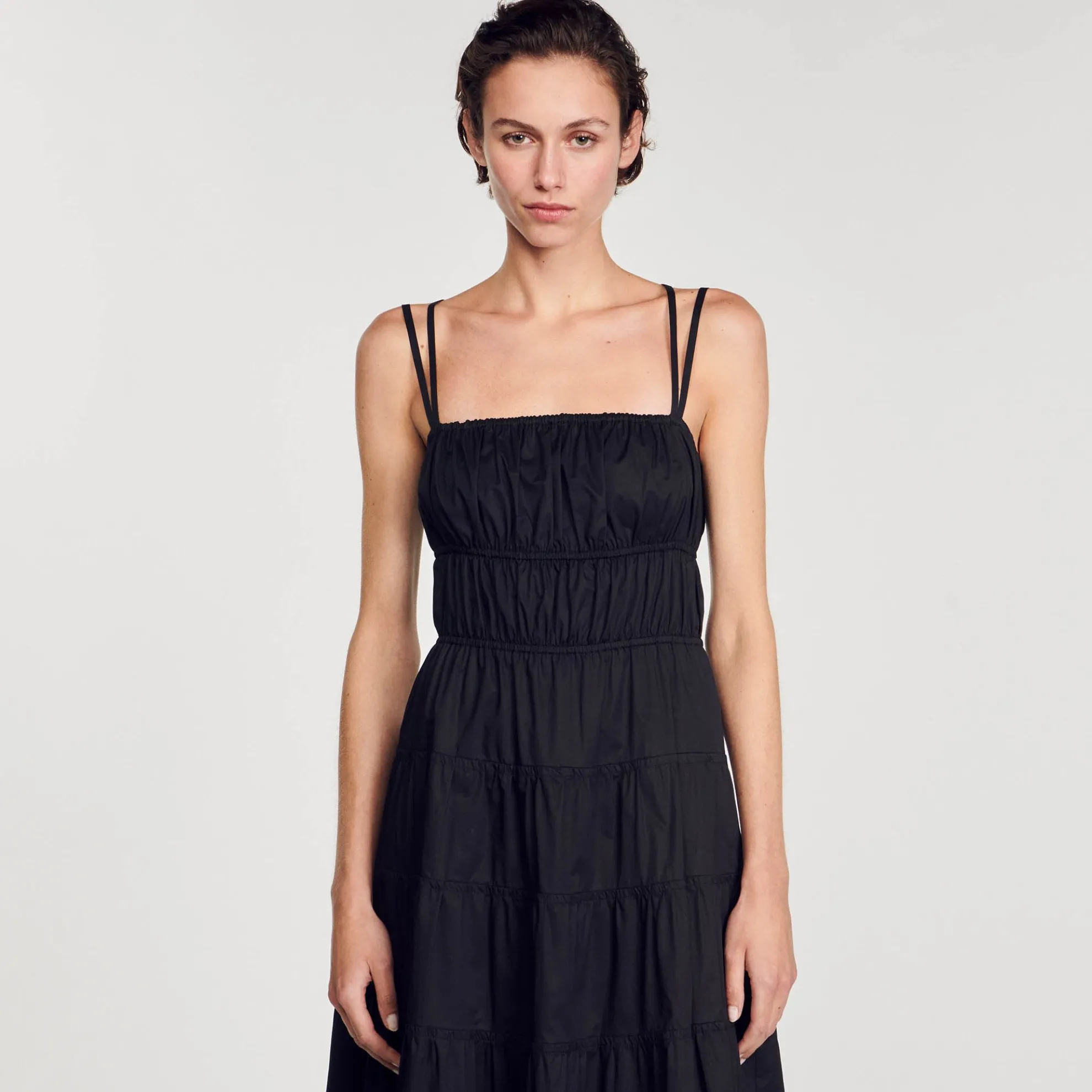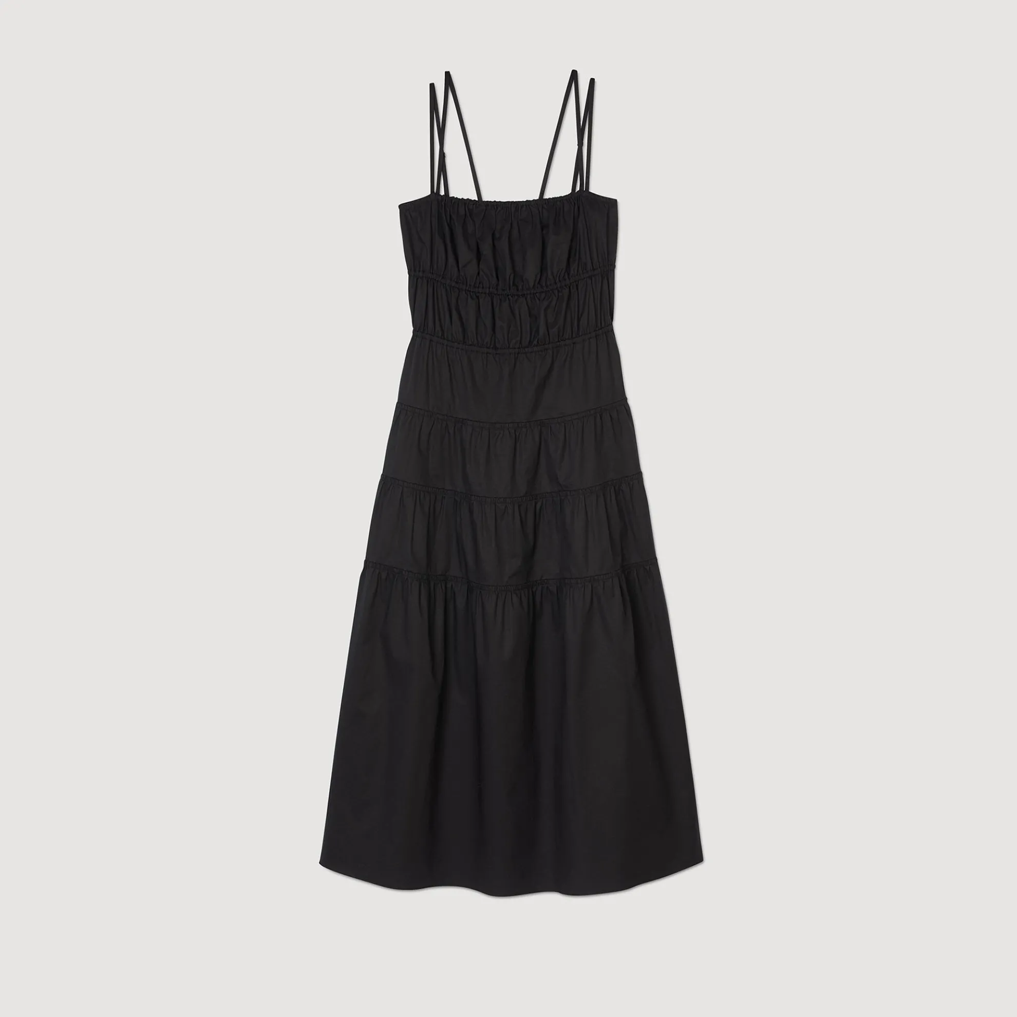 Katoenen midi jurk met gerimpelde elastische banden, dubbele schouderbandjes, een recht decolleté en uitlopend rokgedeelte.