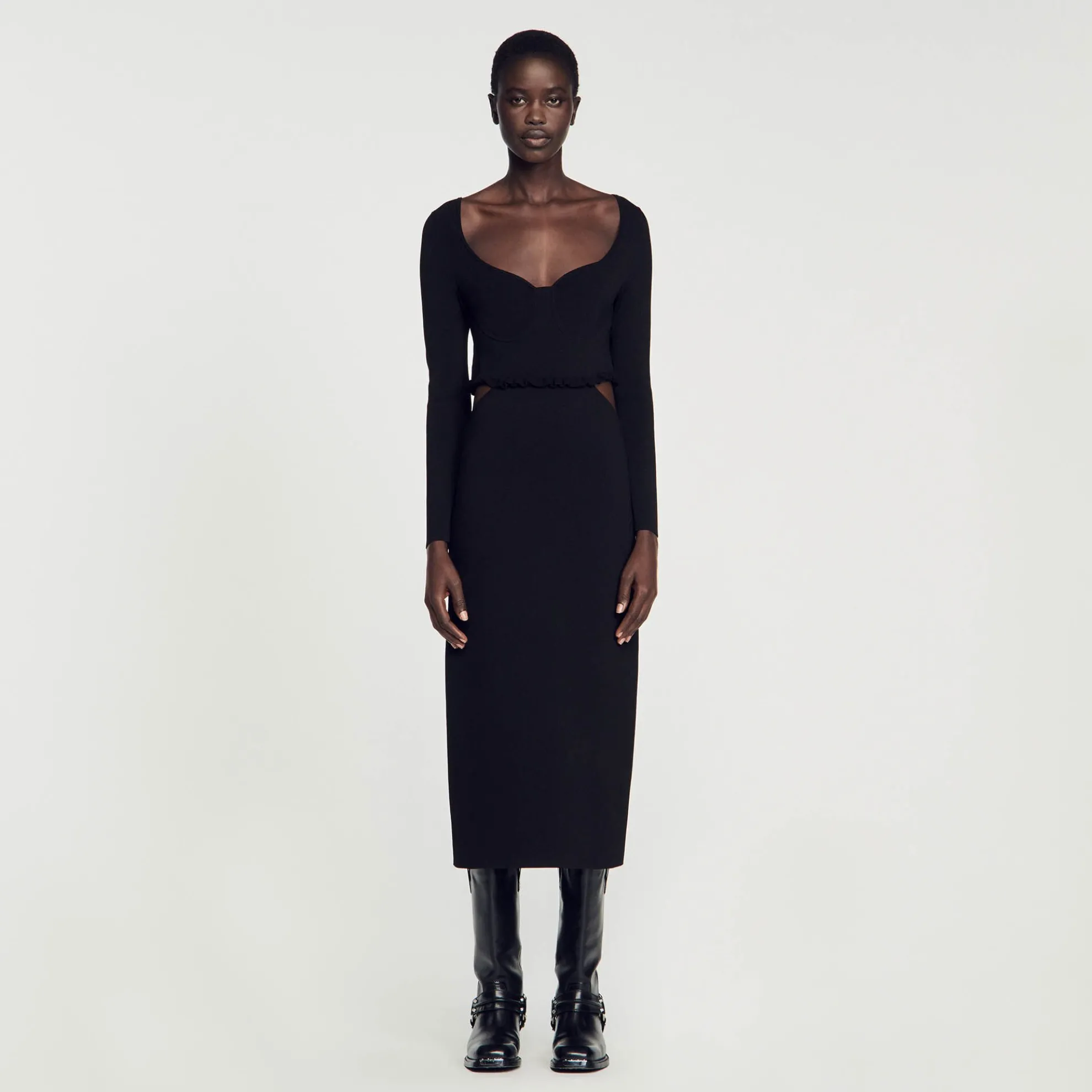 Ribgebreide midi-jurk met een hartvormige sweetheart halslijn, strapless bovenkant met volants, lange mouwen en uitgesnijdingen aan de zijkanten.