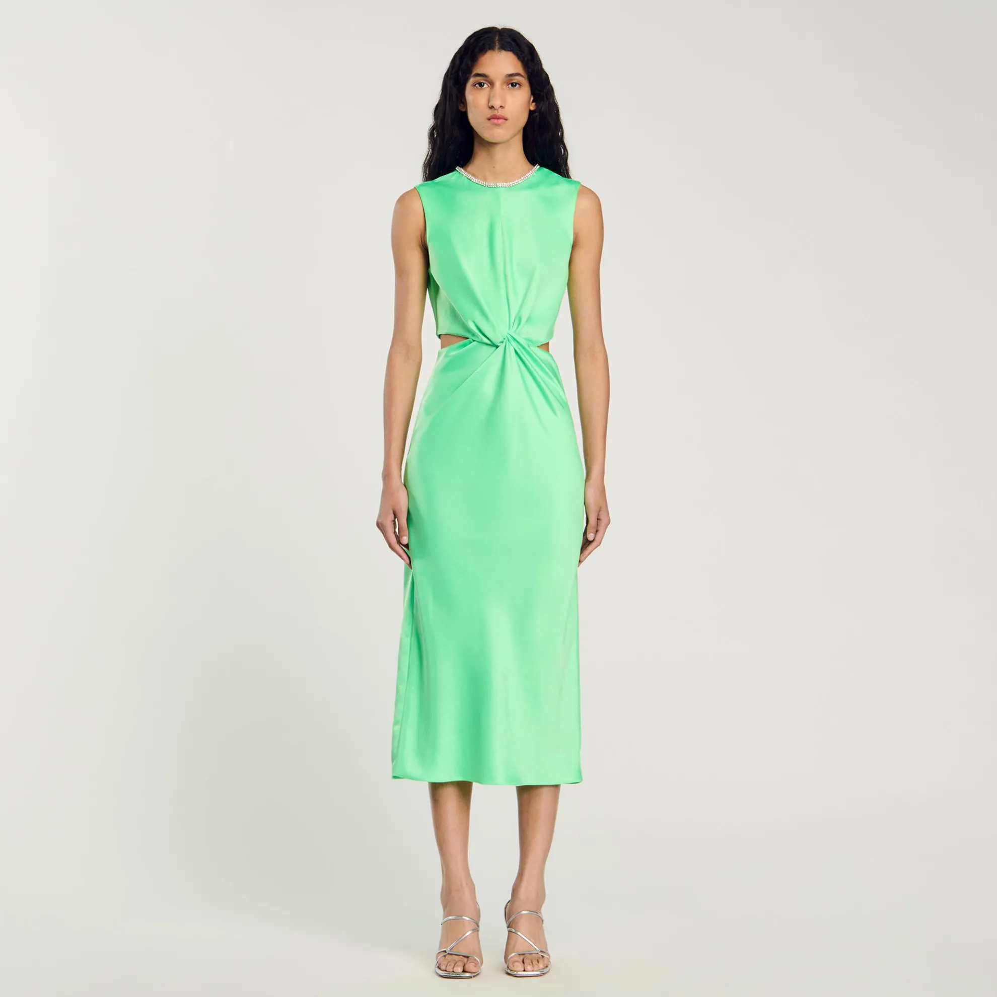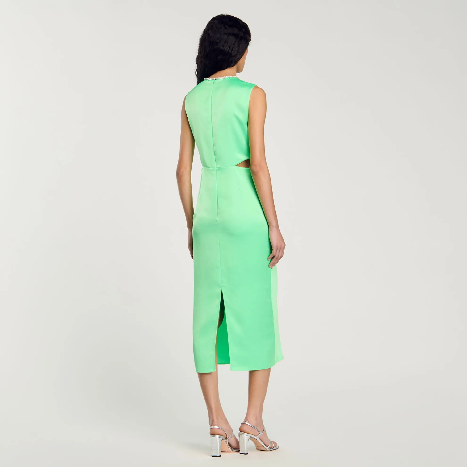 Mouwloze, rechte midi jurk met een ronde hals met stras, cut-outs aan de zij- en achterkant en wikkelplooien in de taille.