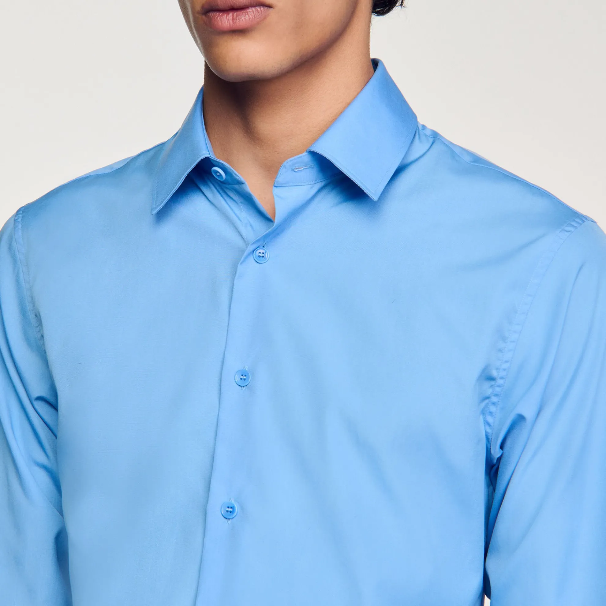 Overhemd met klassieke kraag, lange mouwen met knoopmanchetten, een knoopsluiting en een lange afgeronde onderkant.