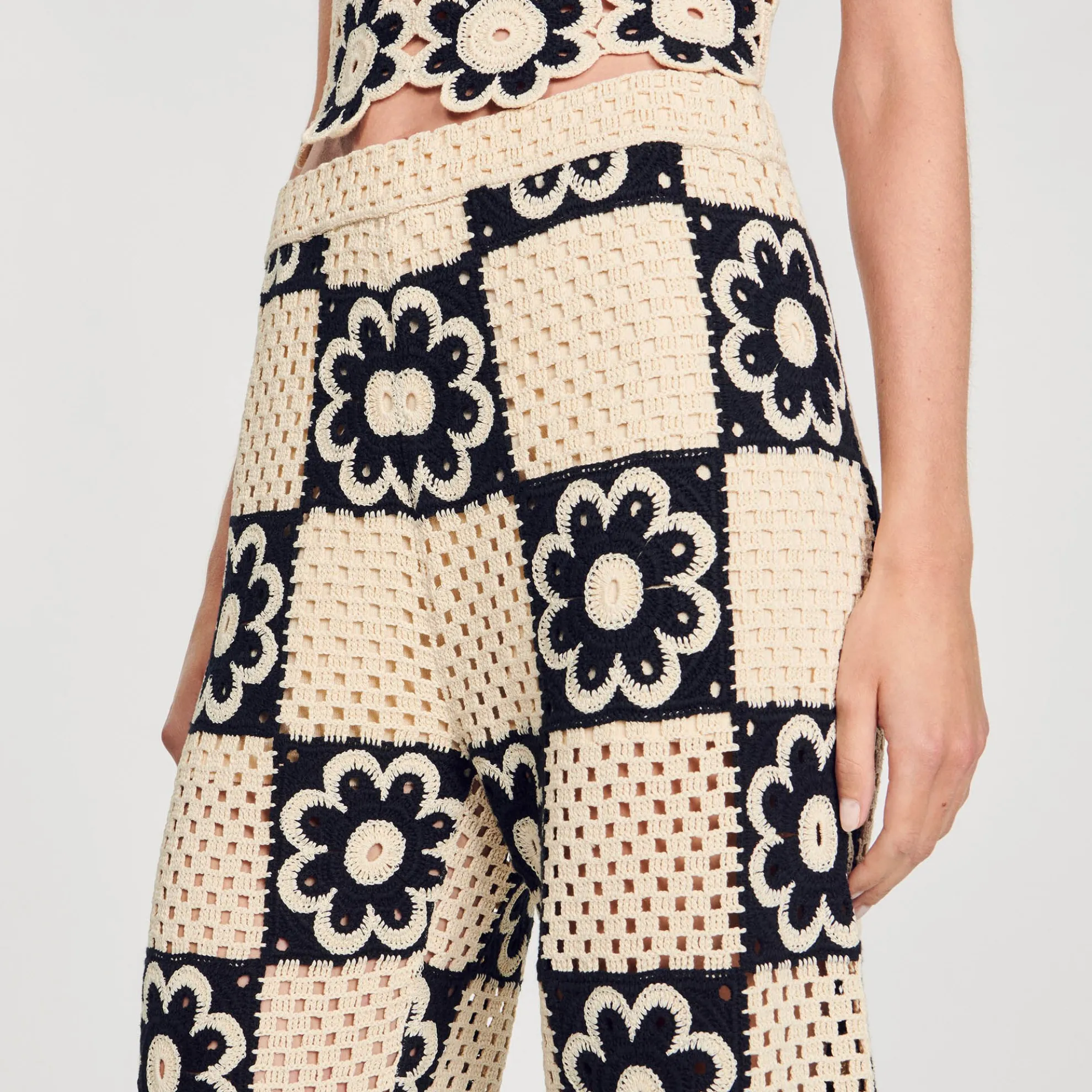 Pantalon van gehaakt breisel met contrasterend bloempatroon, elastische tailleband en een short als voering.