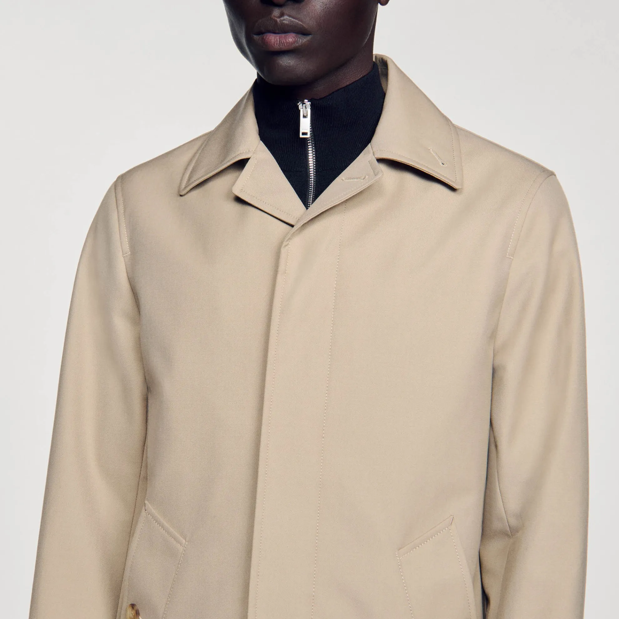 Halflange regenjas met lange mouwen, een overhemdkraag en een knoopsluiting.