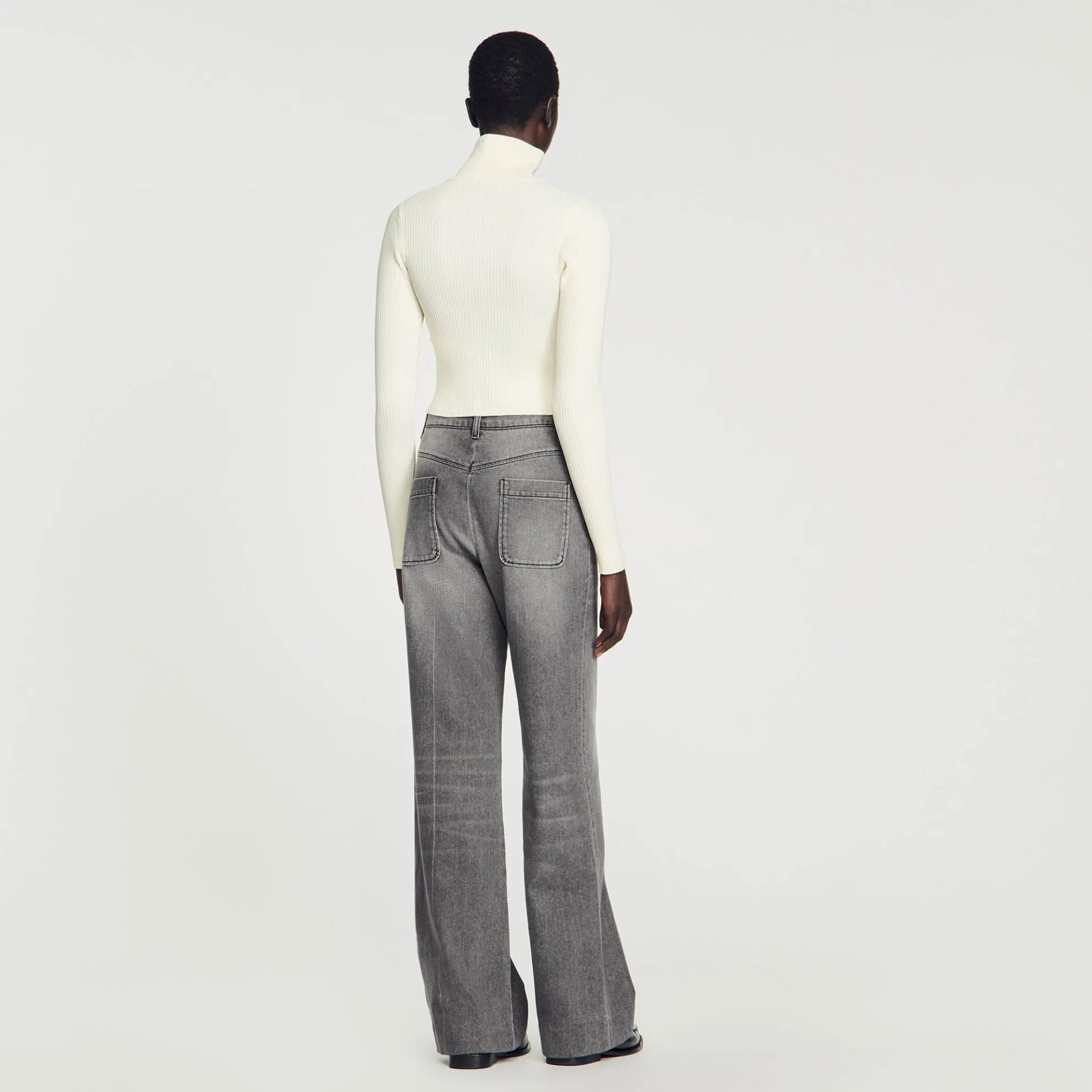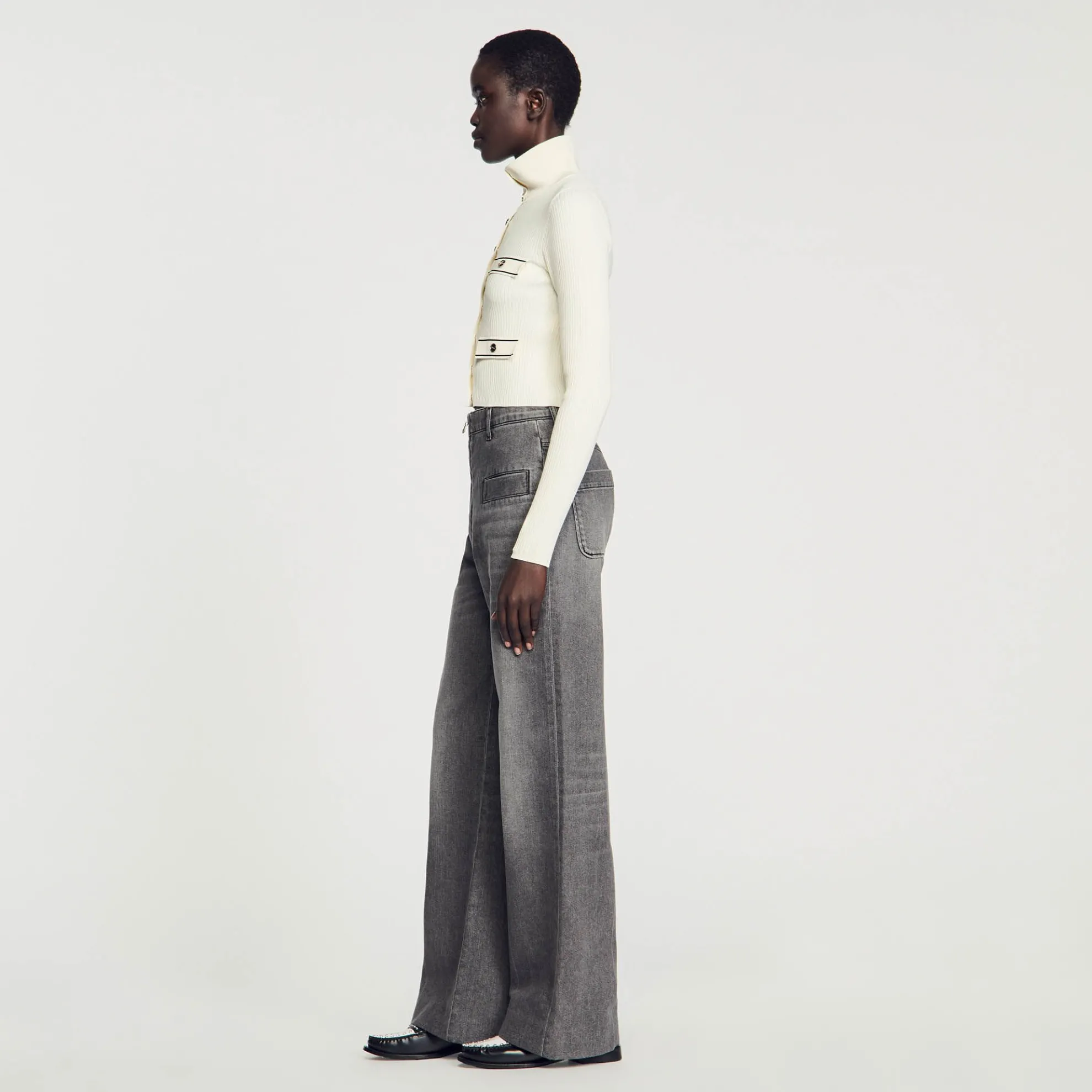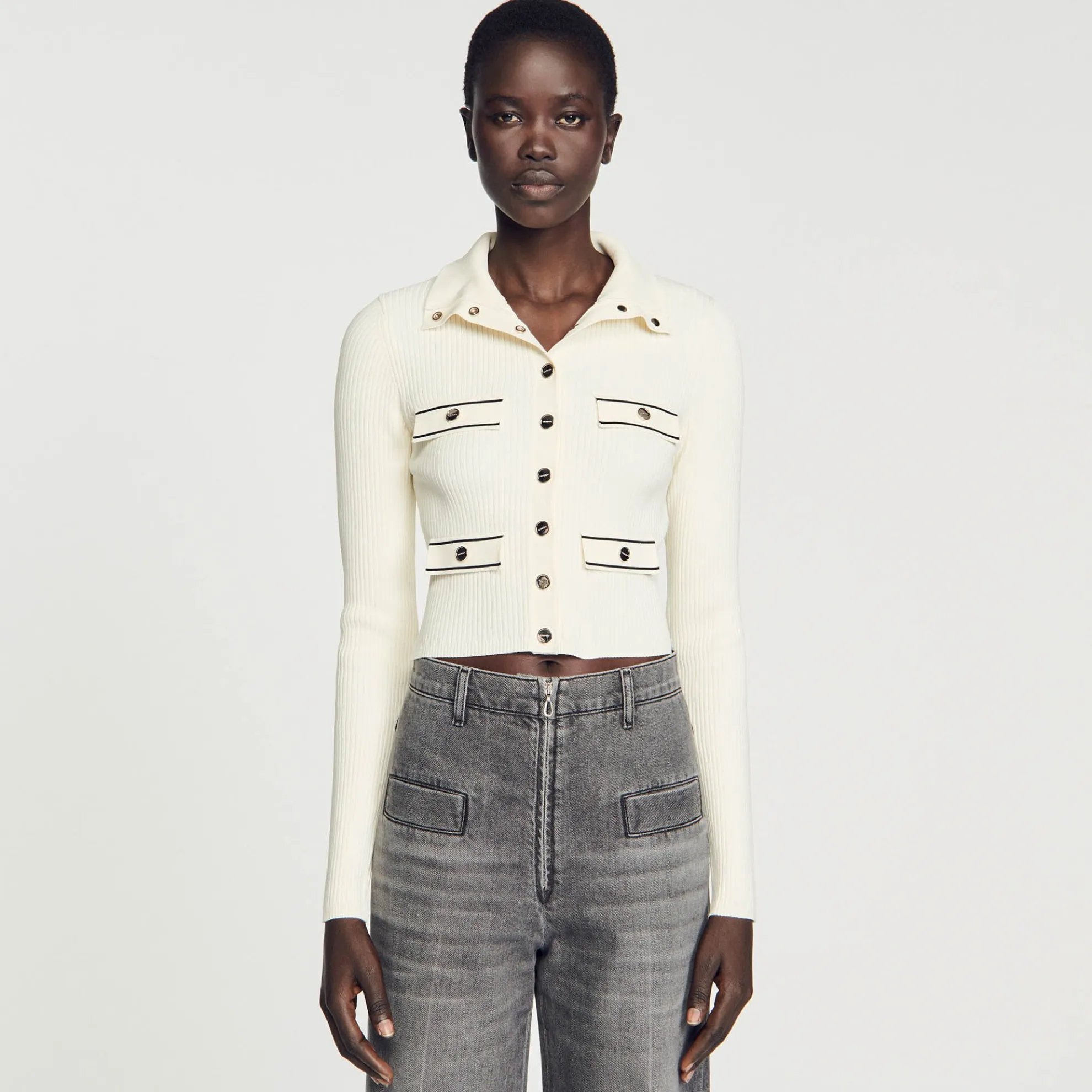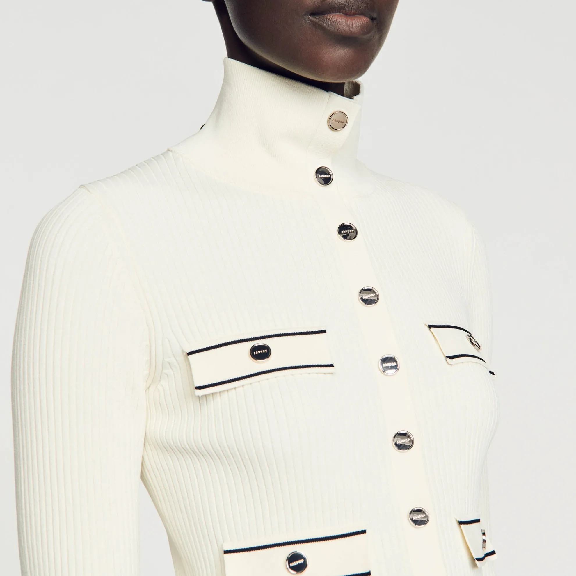 Ribgebreid cardigan vest met opstaande schipperskraag, lange mouwen, drukknoopsluiting en zakken met contrasterende biezen.