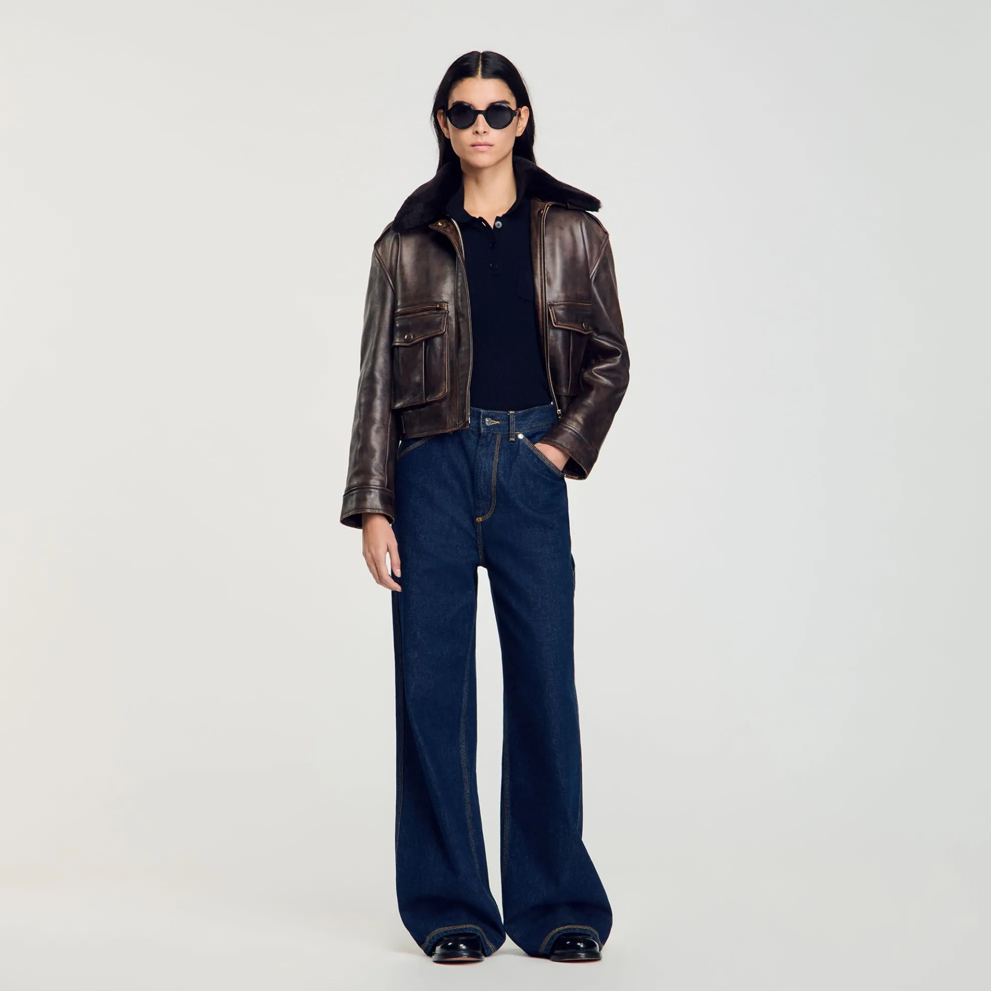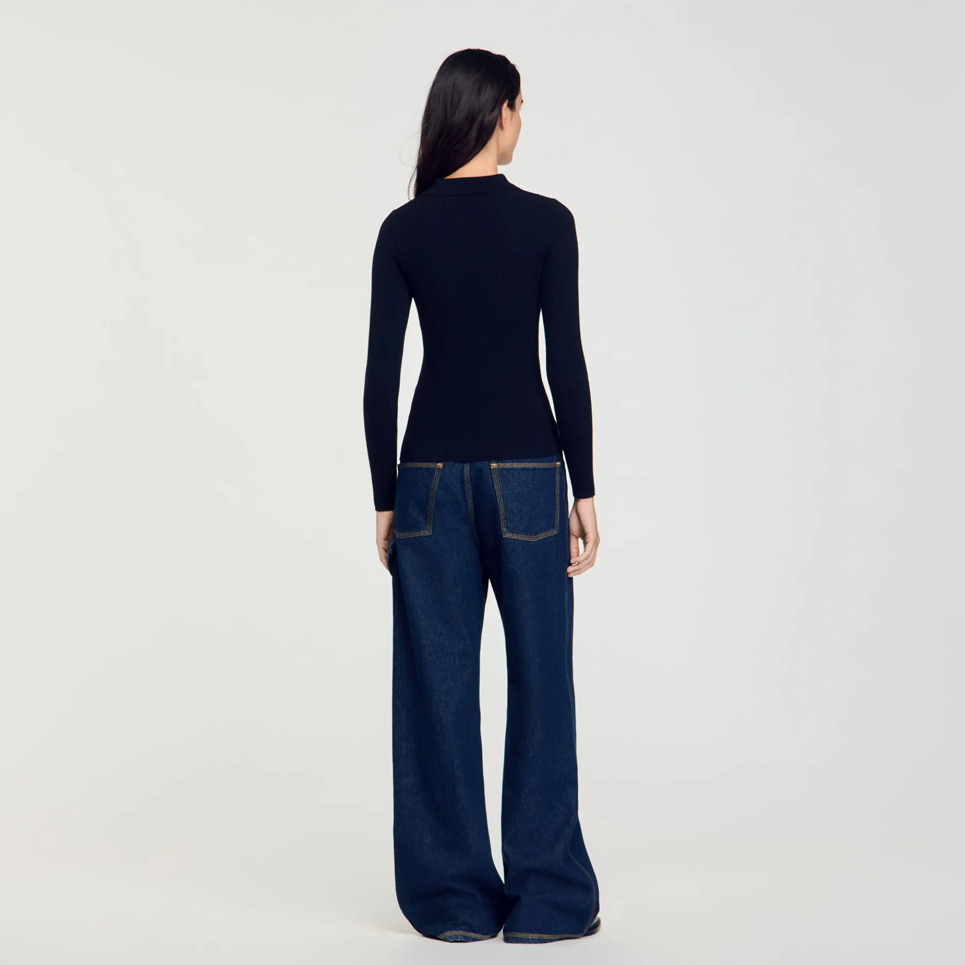 Geribde trui met gevlekt effect, button-down polokraag, lange mouwen en opgestikte zak op de borst.