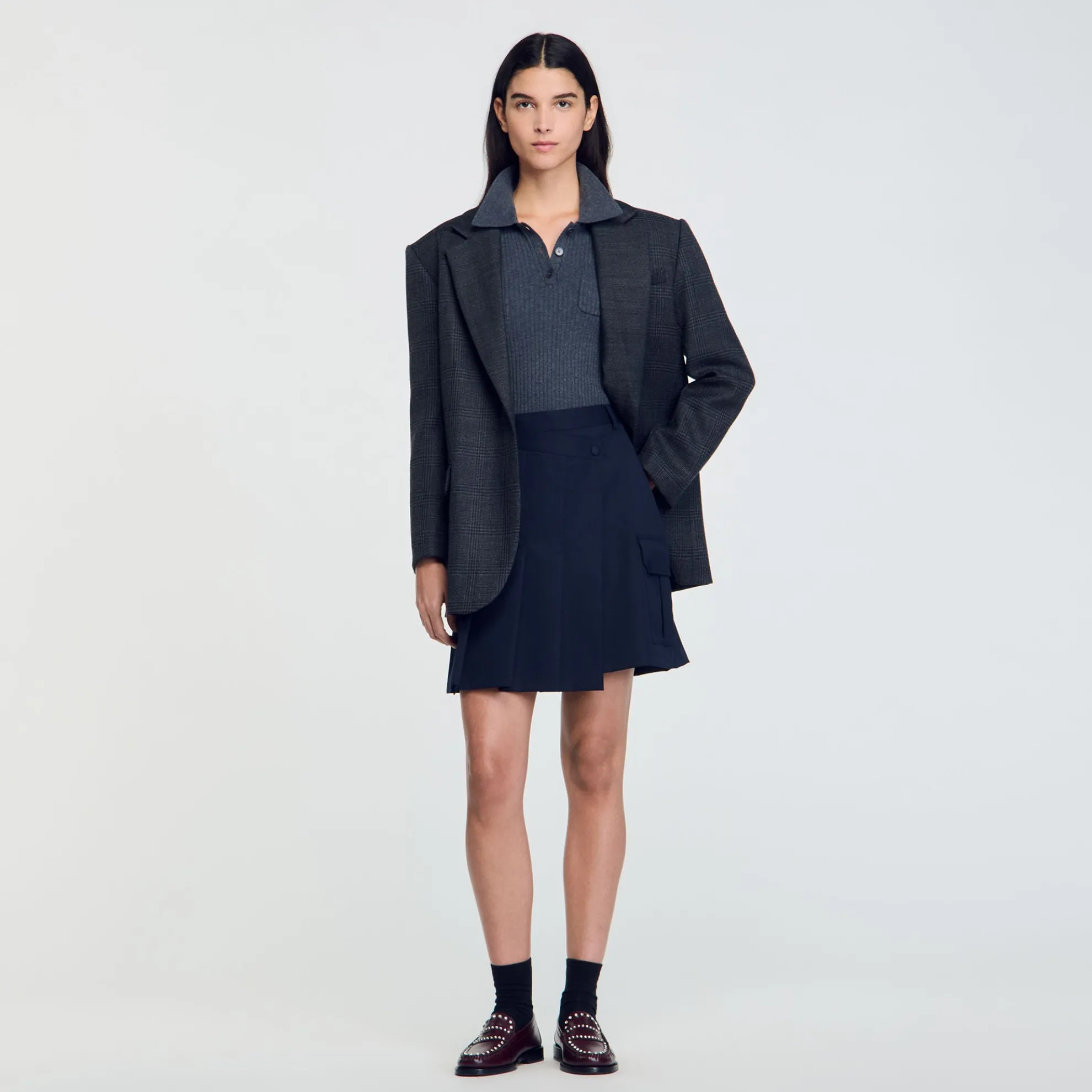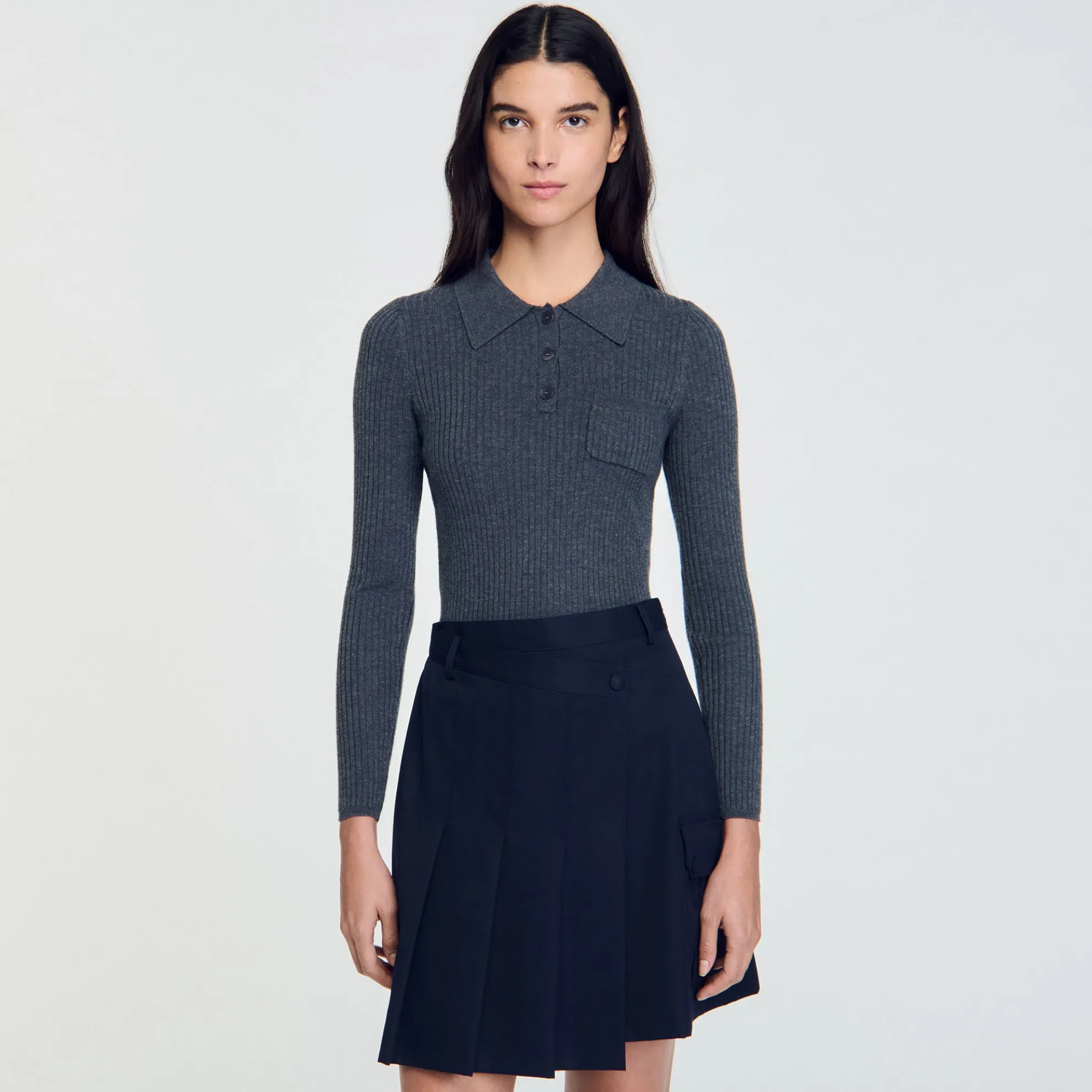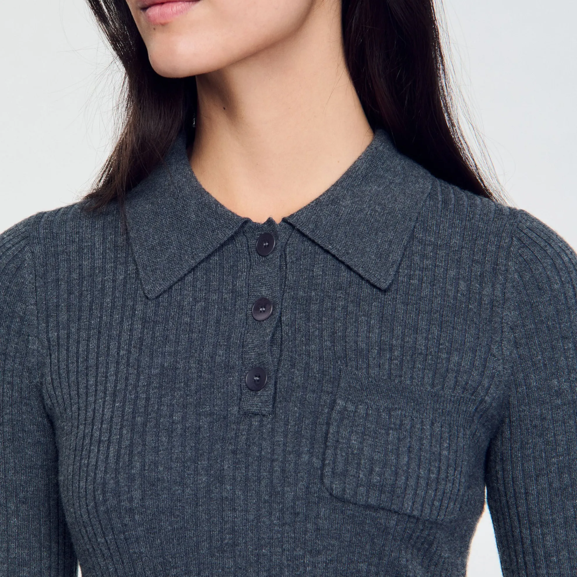 Geribde trui met gevlekt effect, button-down polokraag, lange mouwen en opgestikte zak op de borst.