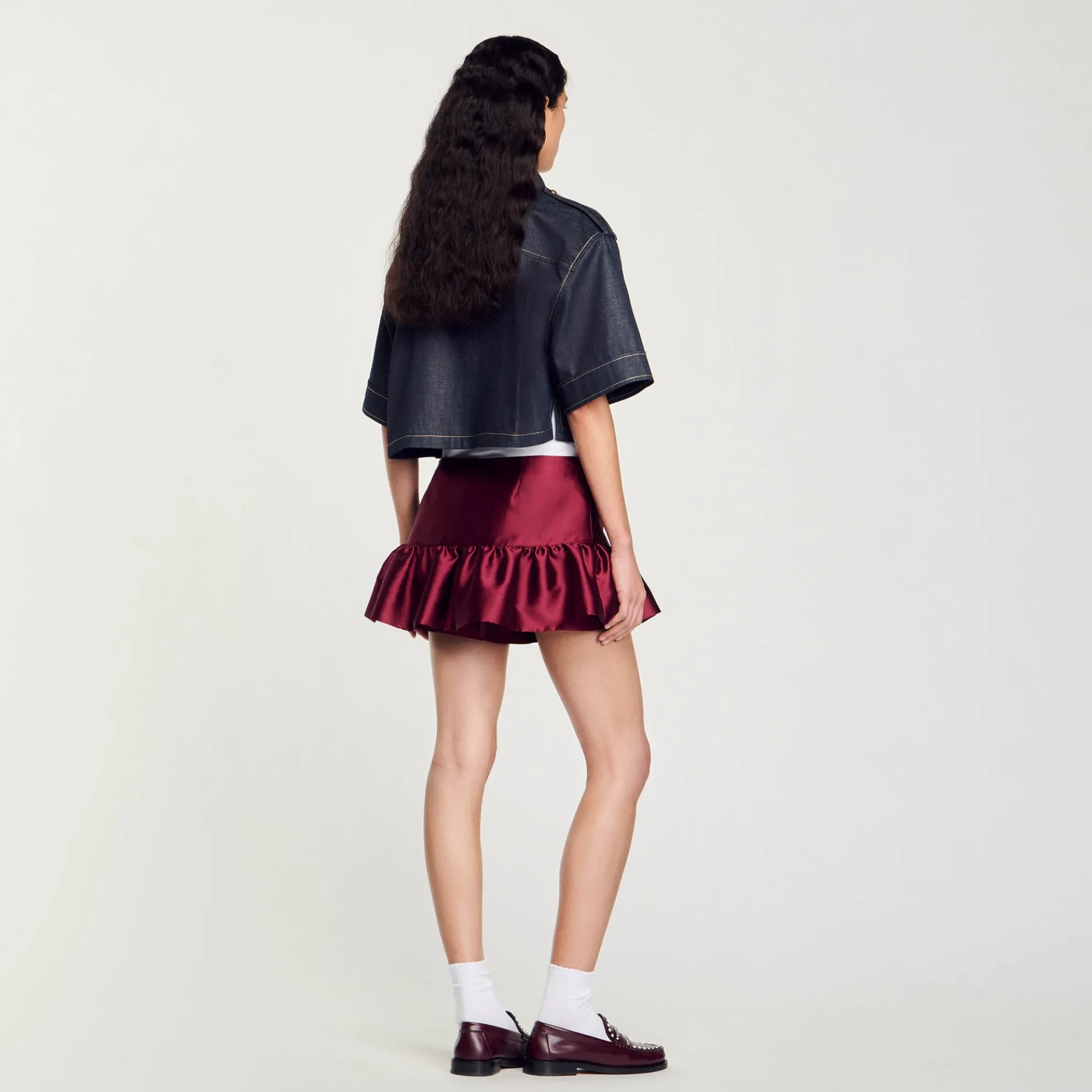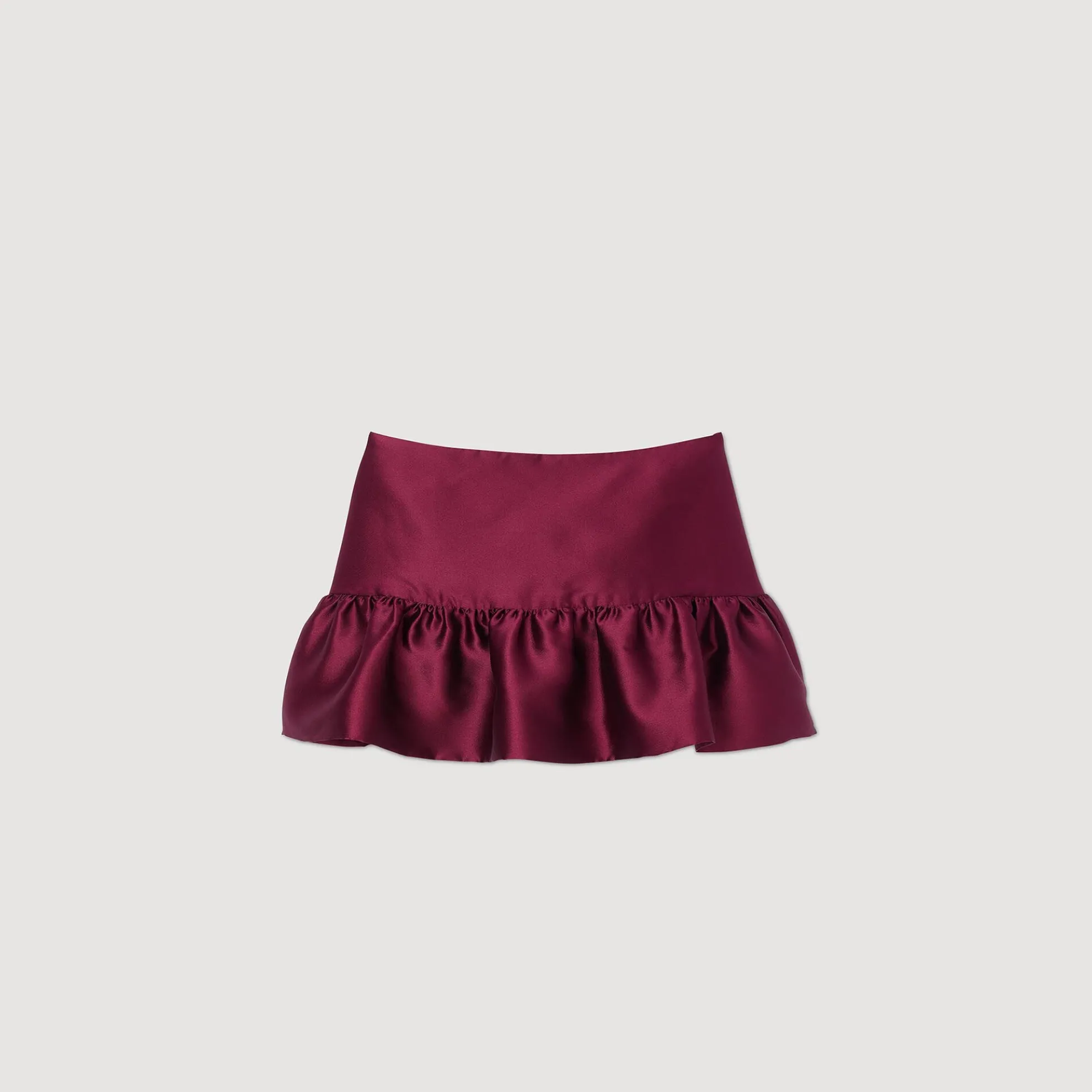 Mini short in stijl van een rok van zware satijnen stof, uitlopend en volumineus met een lage taille en ritssluiting.