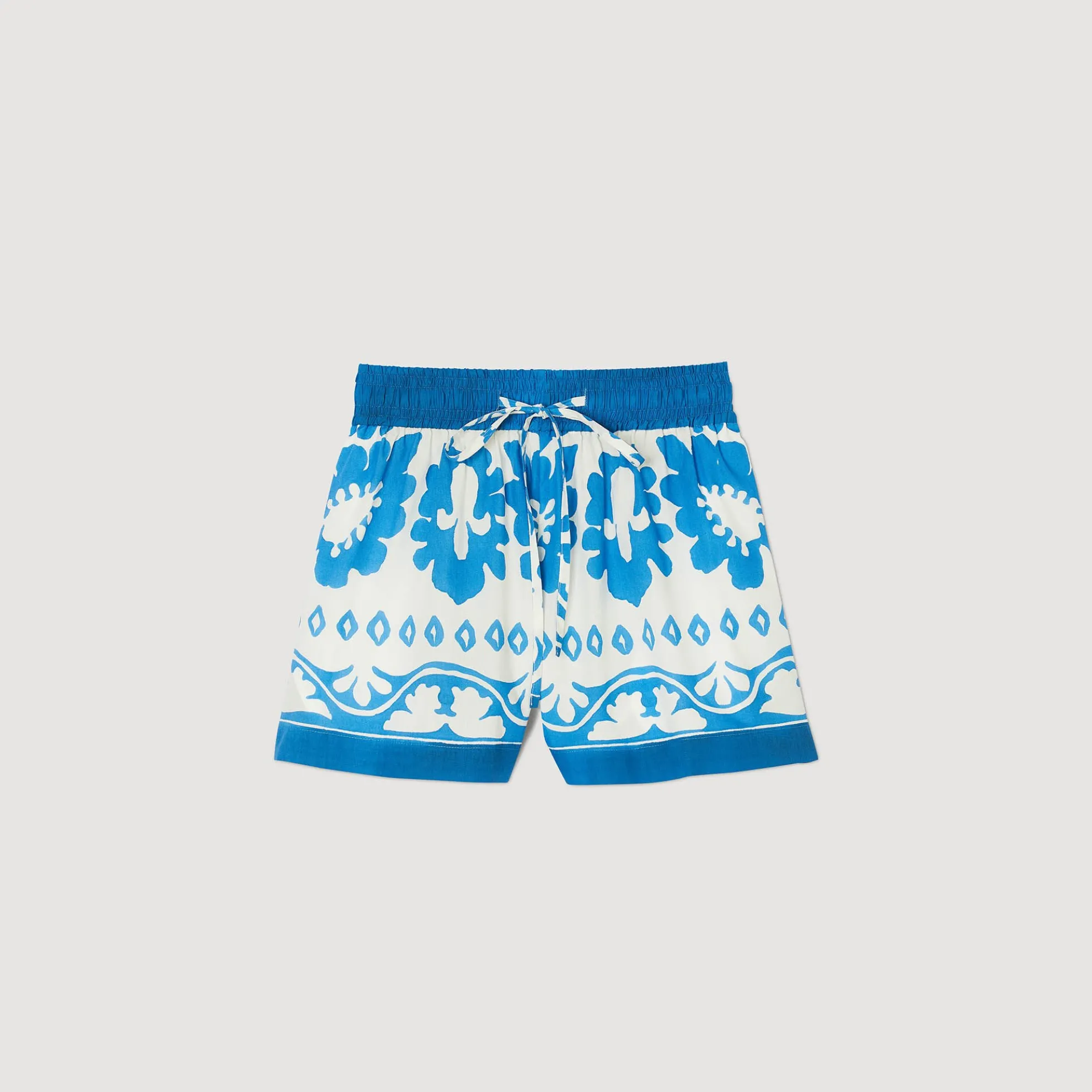 Wijdvallende short met bloemenprint, ceintuur met trekkoord in de taille en steekzakken.