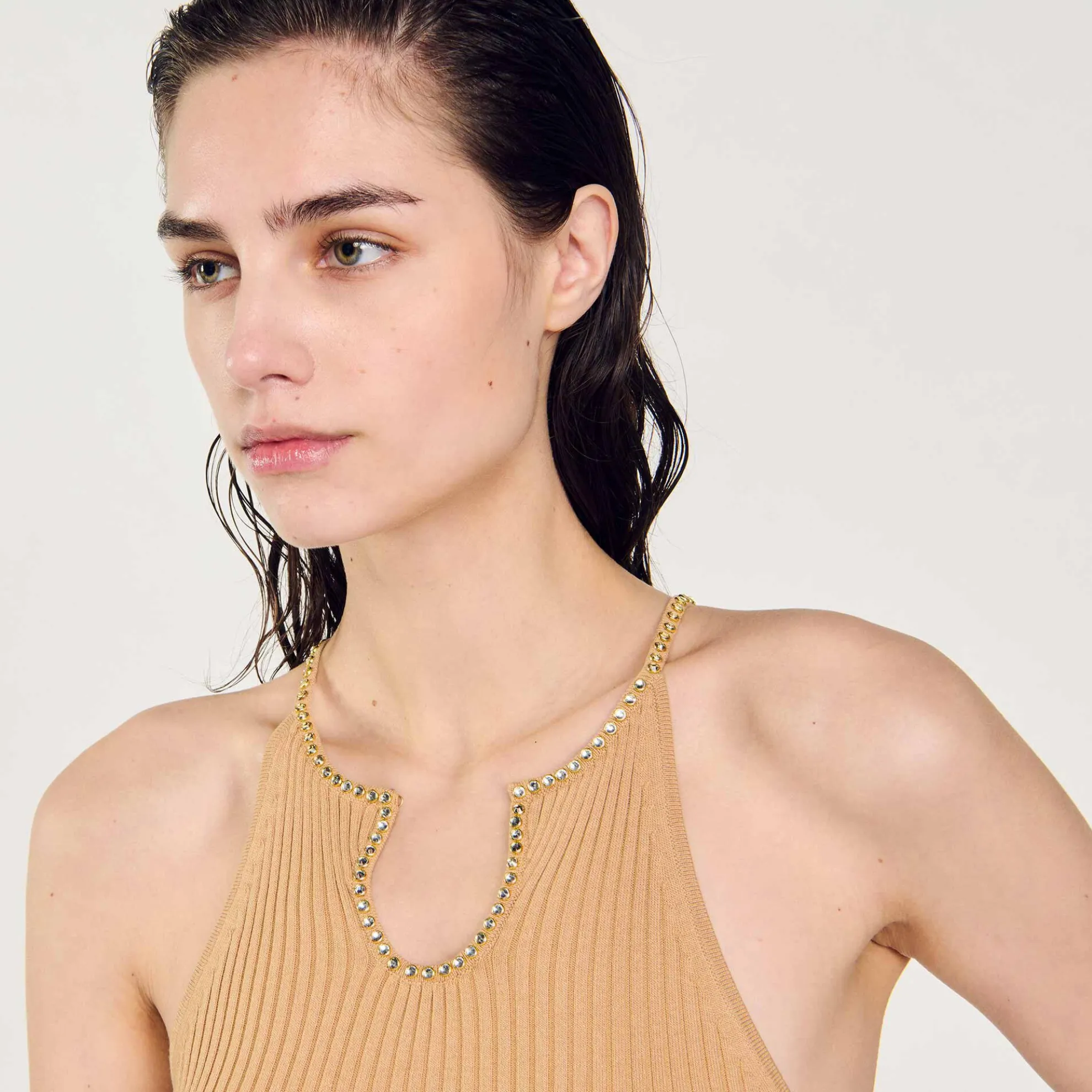 Mouwloos ribgebreid spencer vest met een kraag versierd met strassteentjes in druppelvorm.