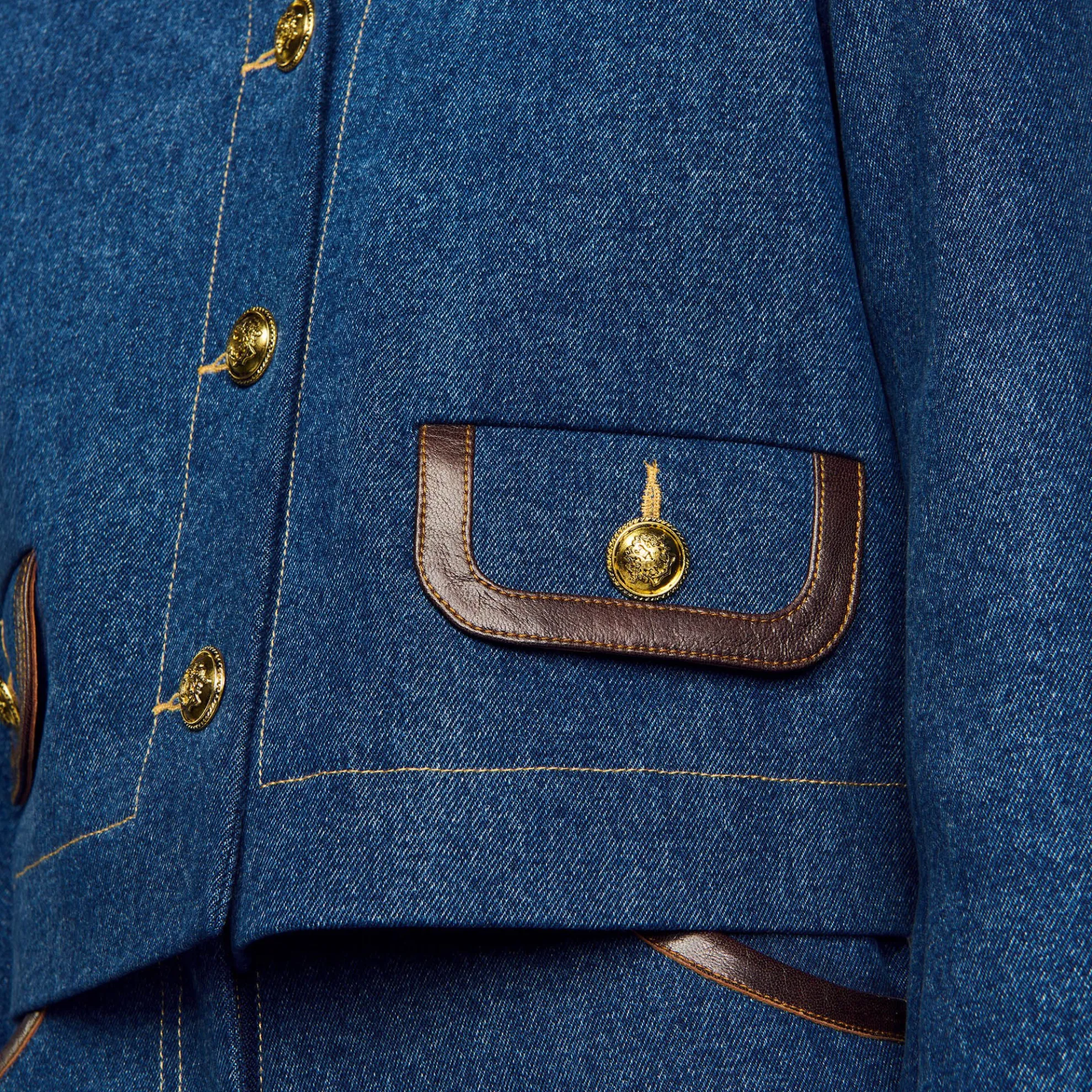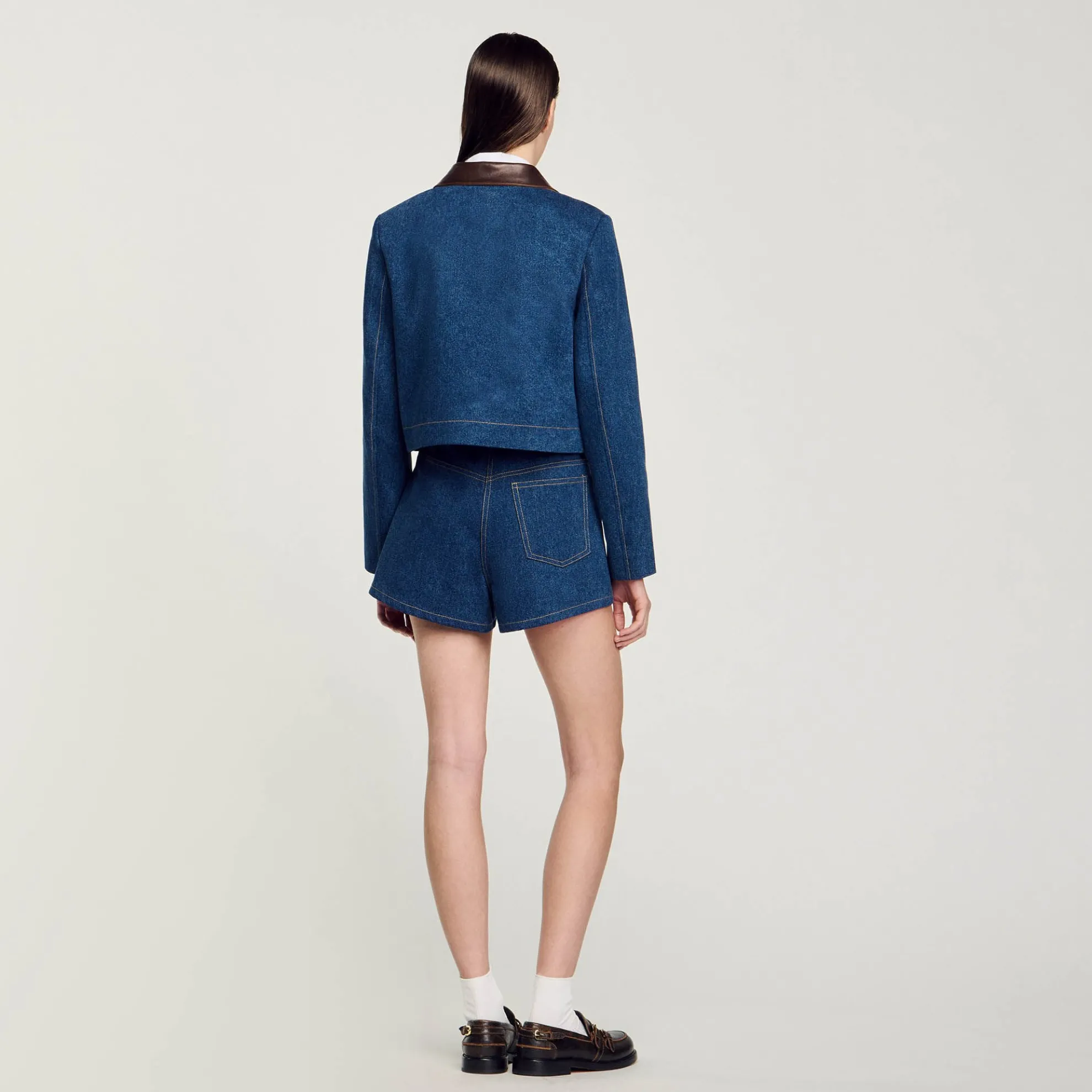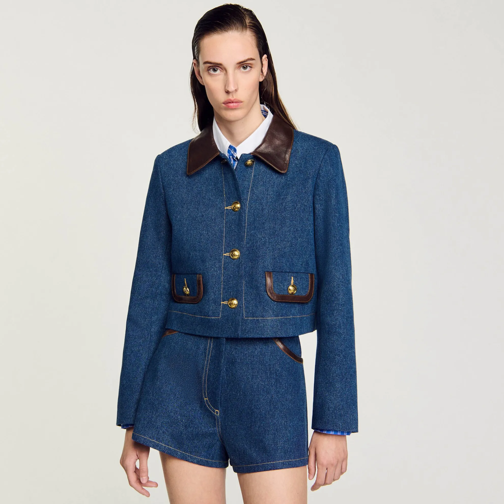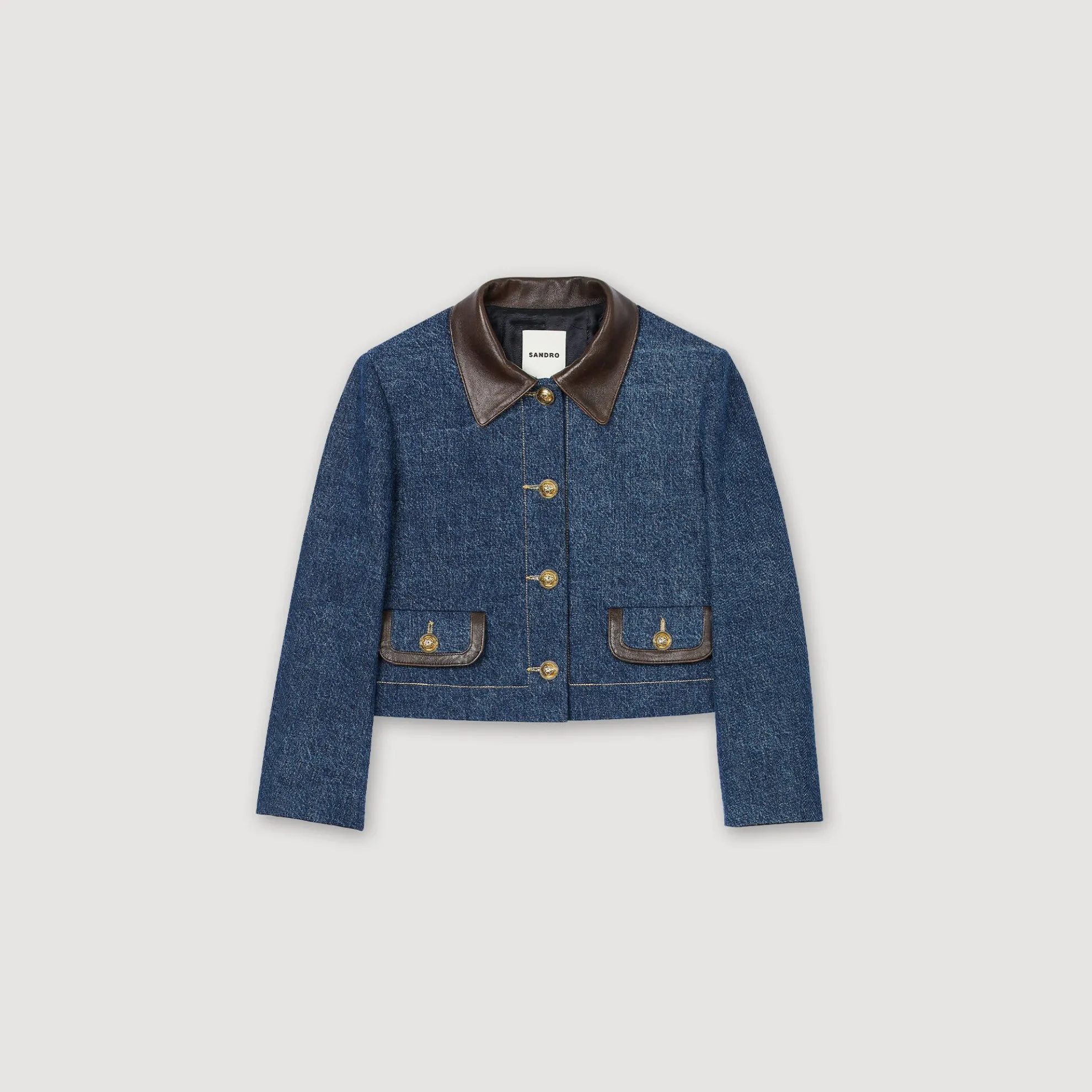 Kort spijkerjasje met rechte pasvorm versierd met contrasterende leren details, een overhemdkraag, klepzakken, lange mouwen en een knoopsluiting.