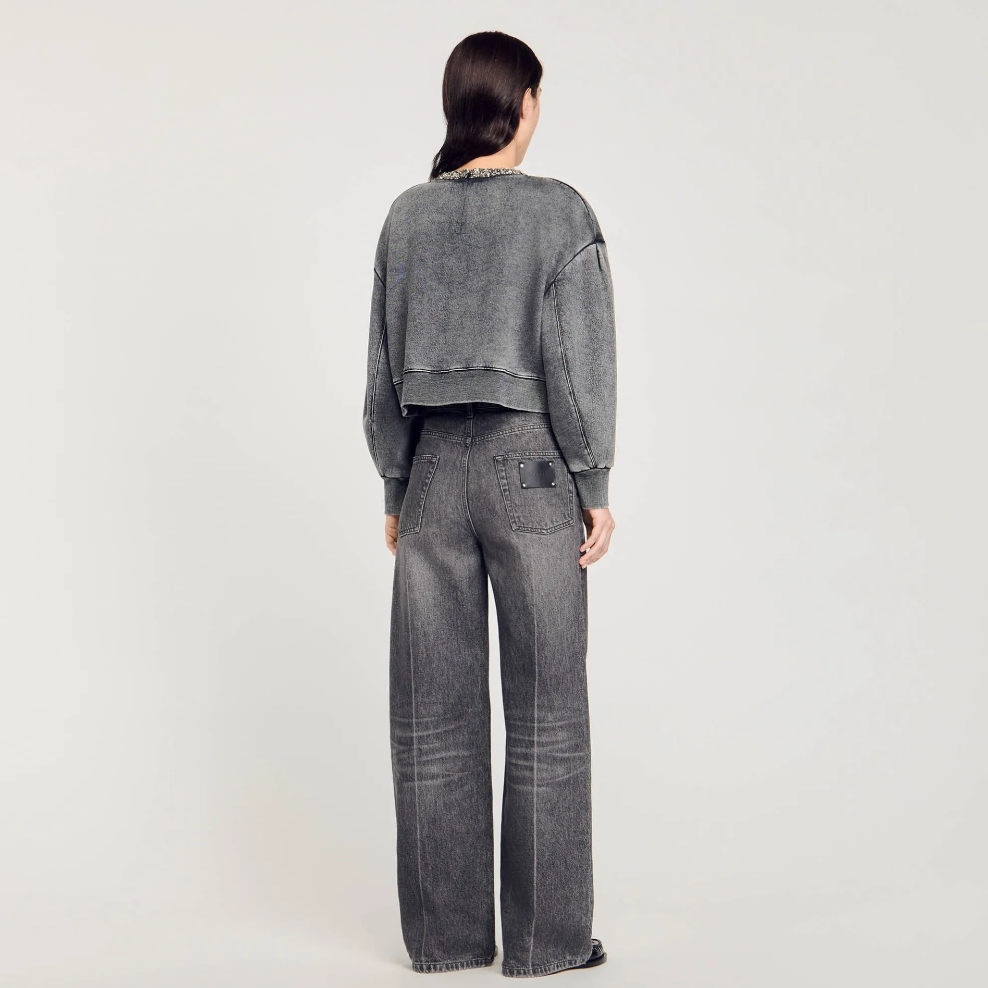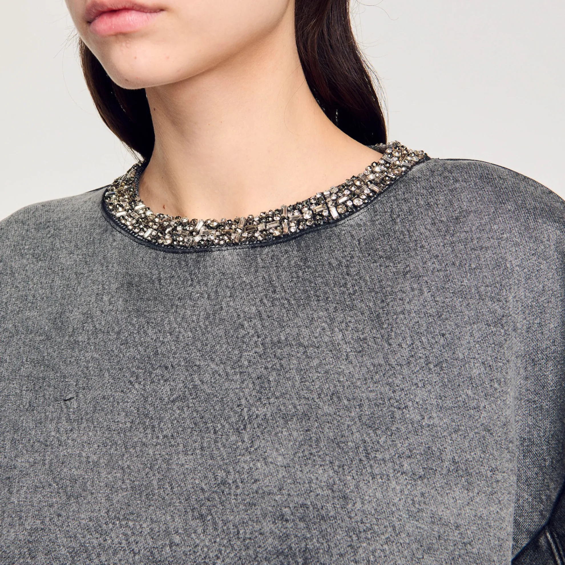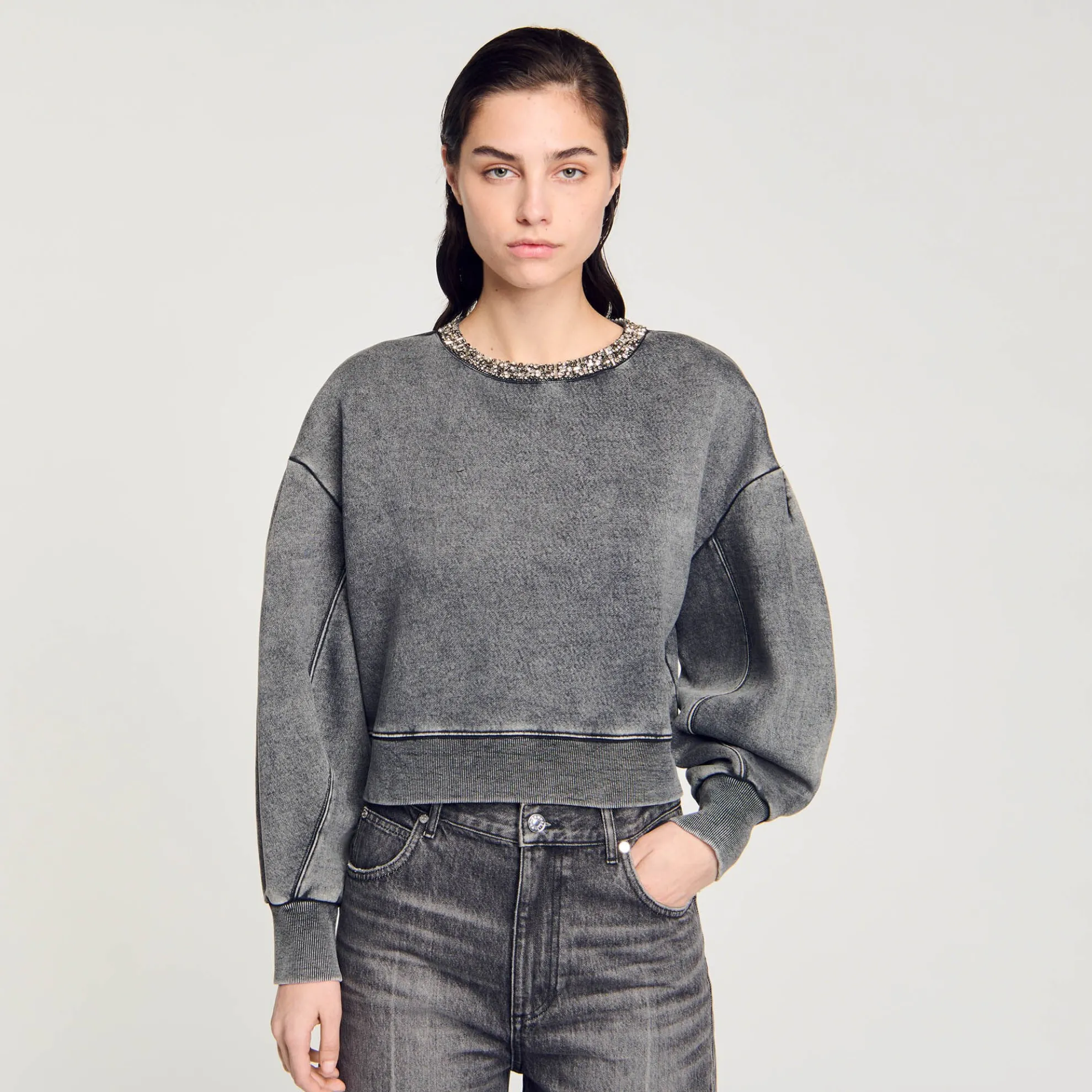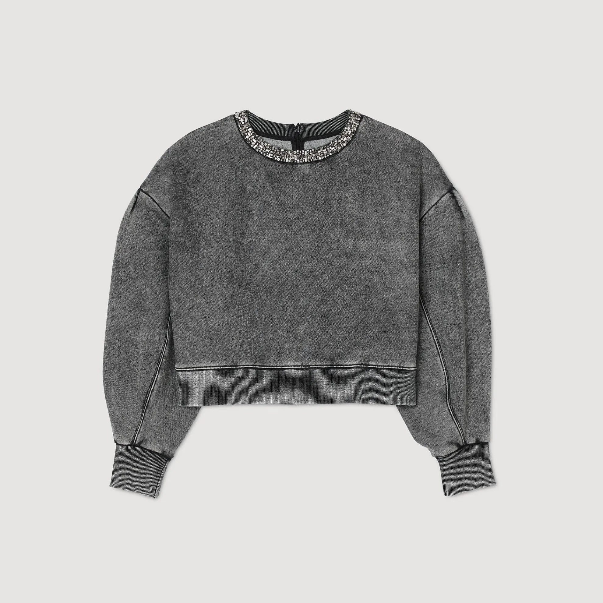 Korte, wijdvallende sweater van stone washed fleece met volumineuze lange mouwen en een ronde hals met stras.