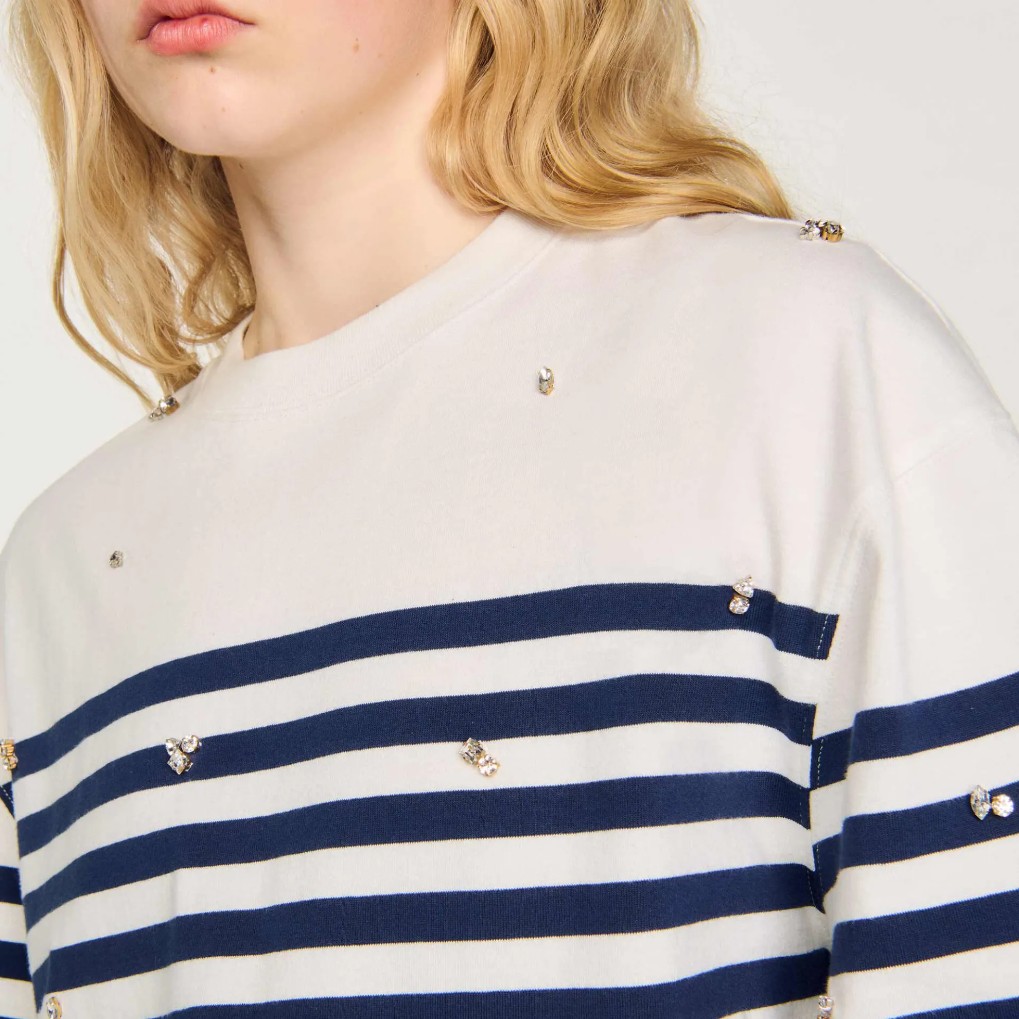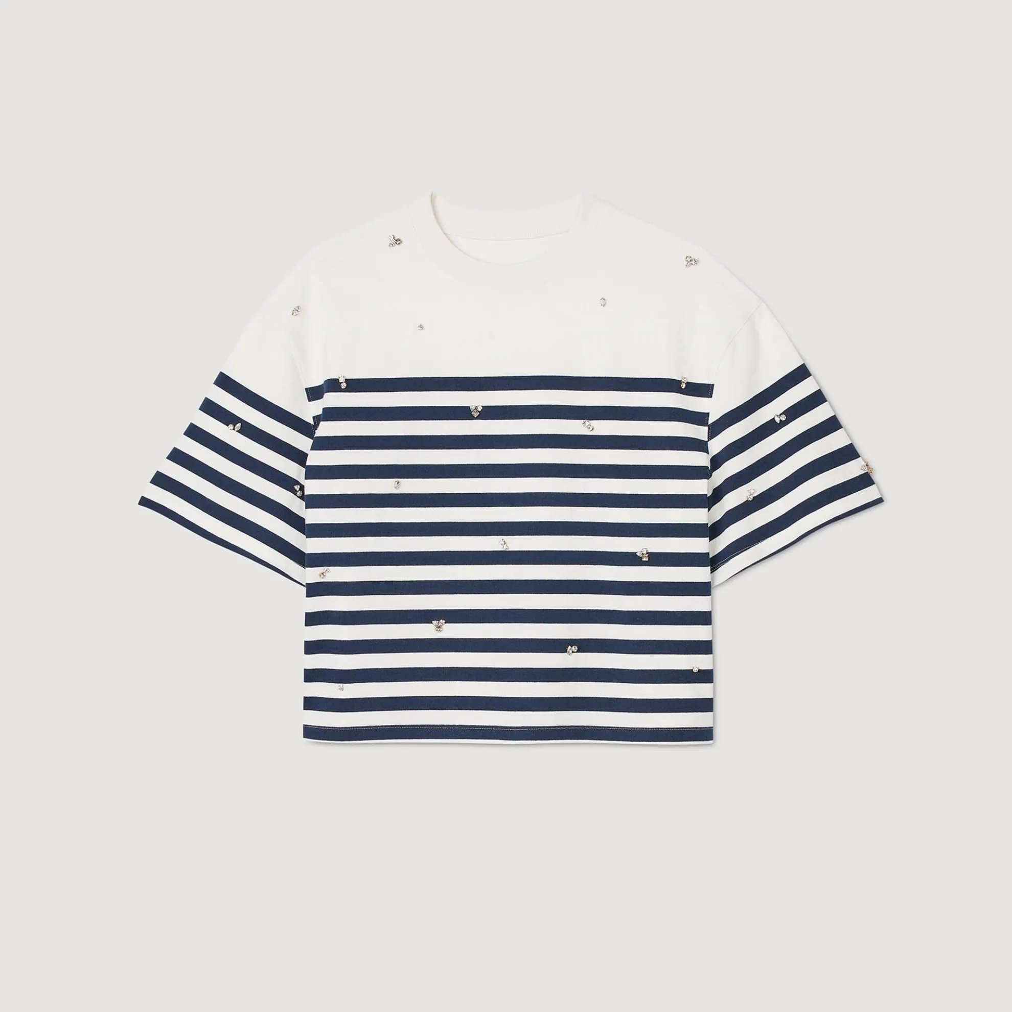 T-shirt in maritieme stijl met ronde hals, korte mouwen, contrasterende strepen en gezette geborduurde stras.