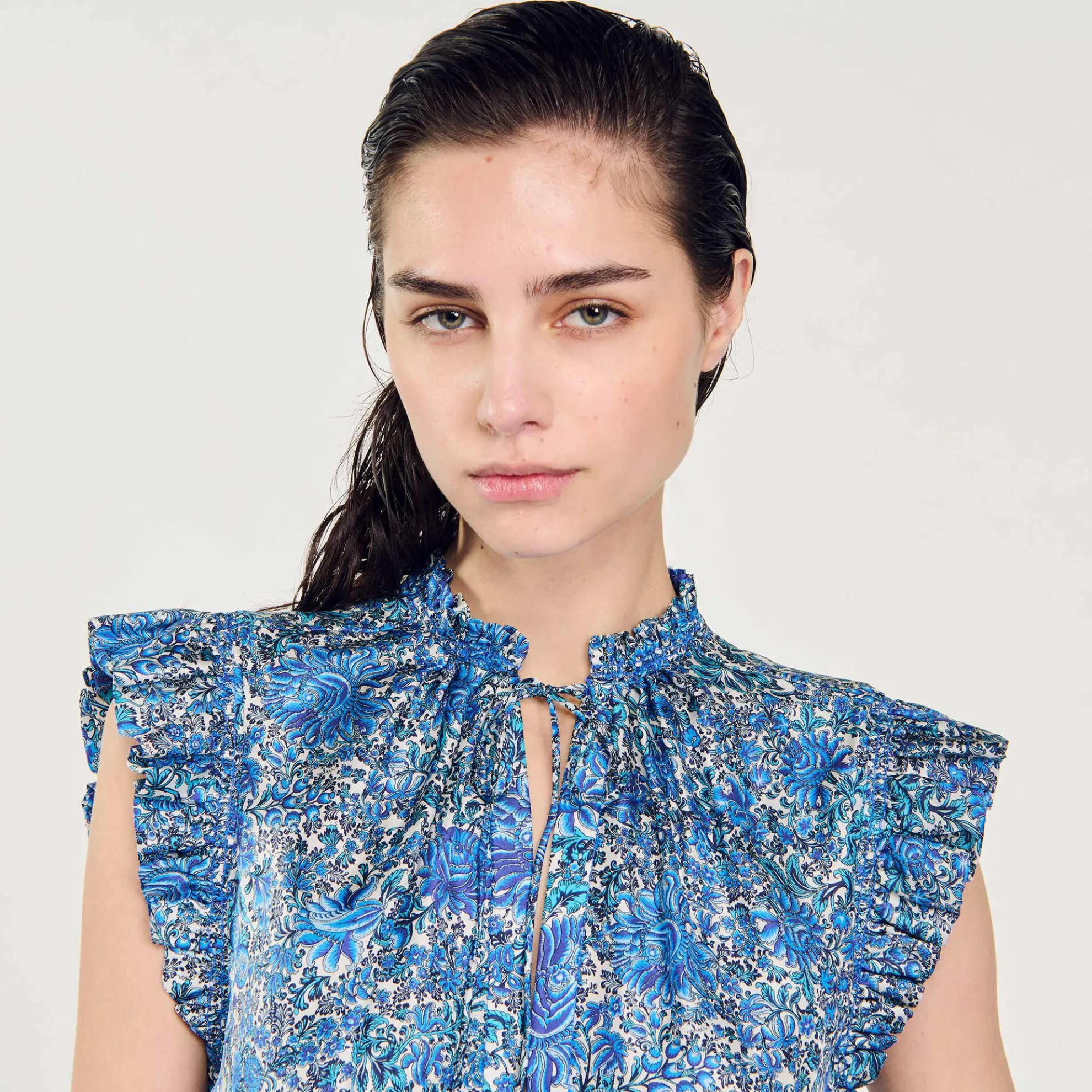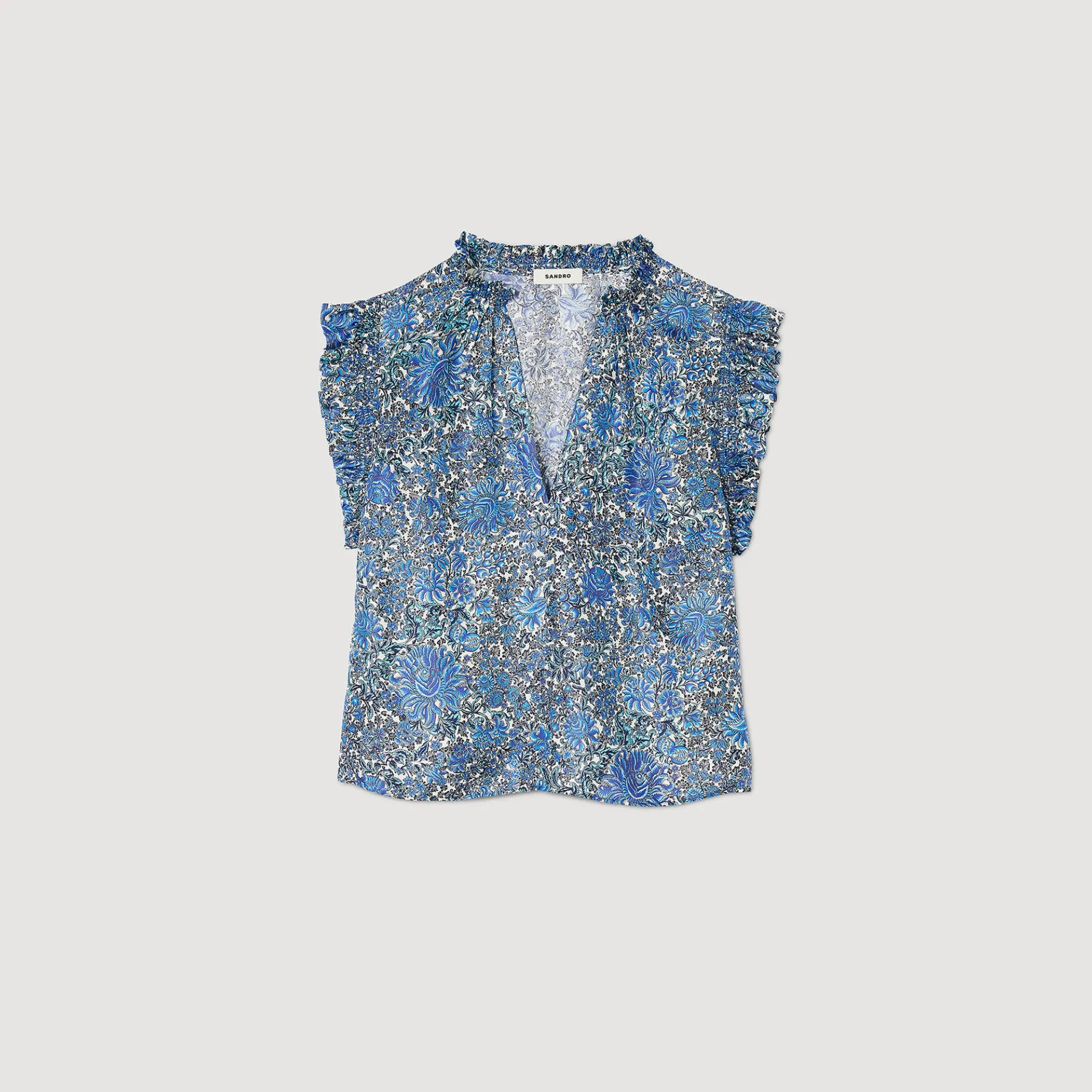Soepele top met bloemenprint, V-hals met banden en gesmokte mouwen.