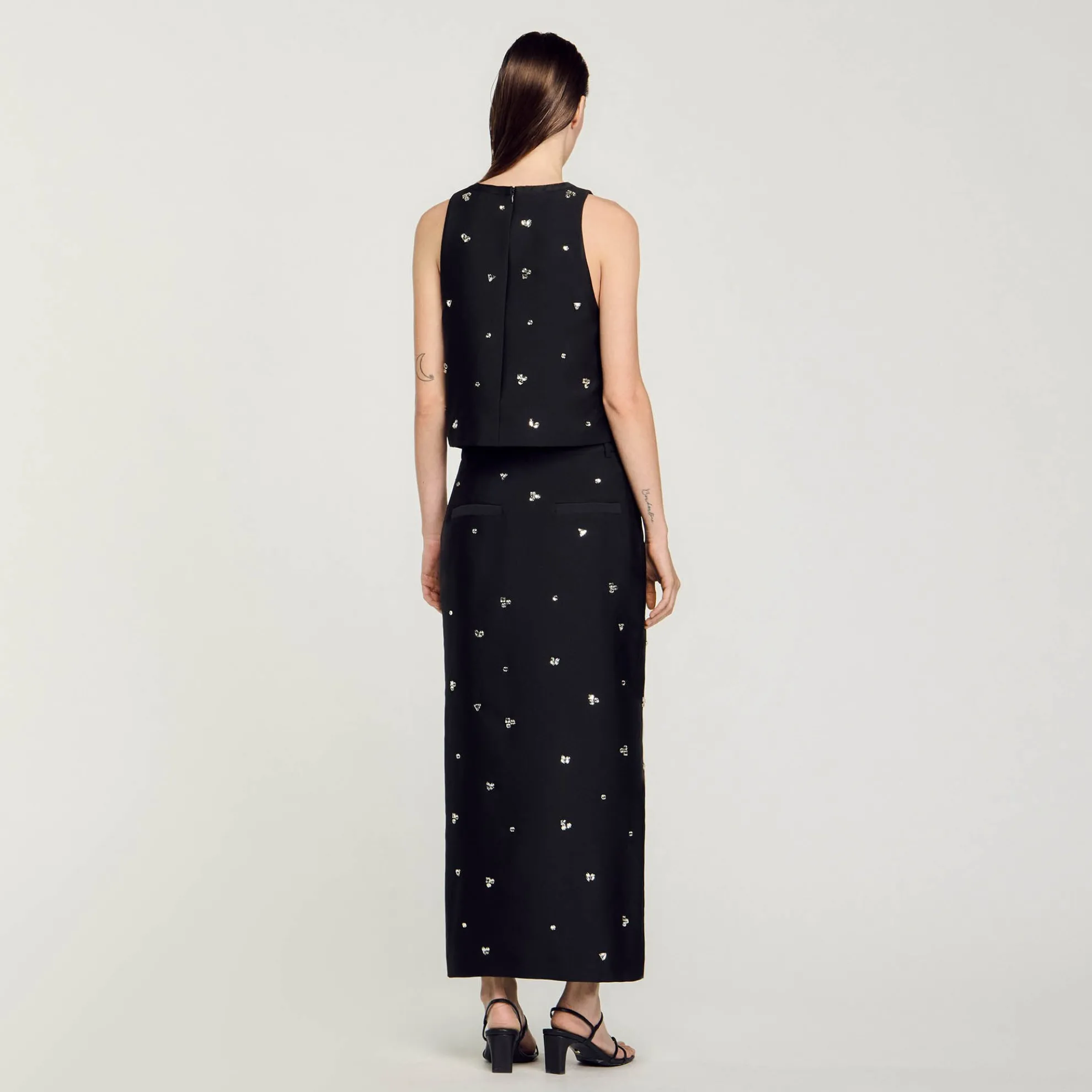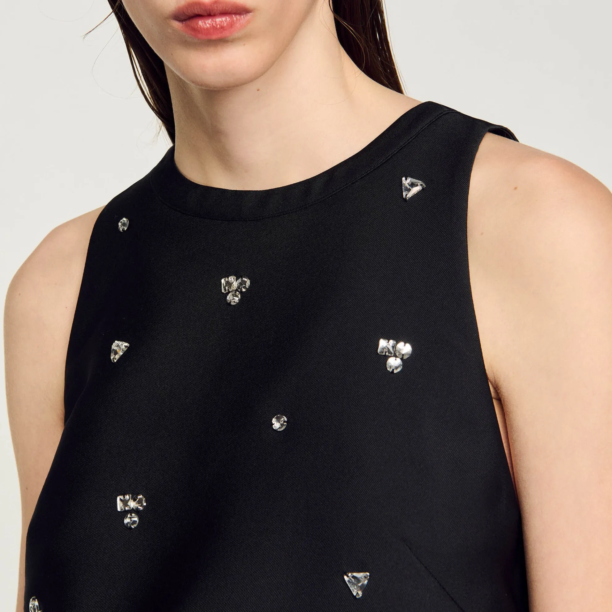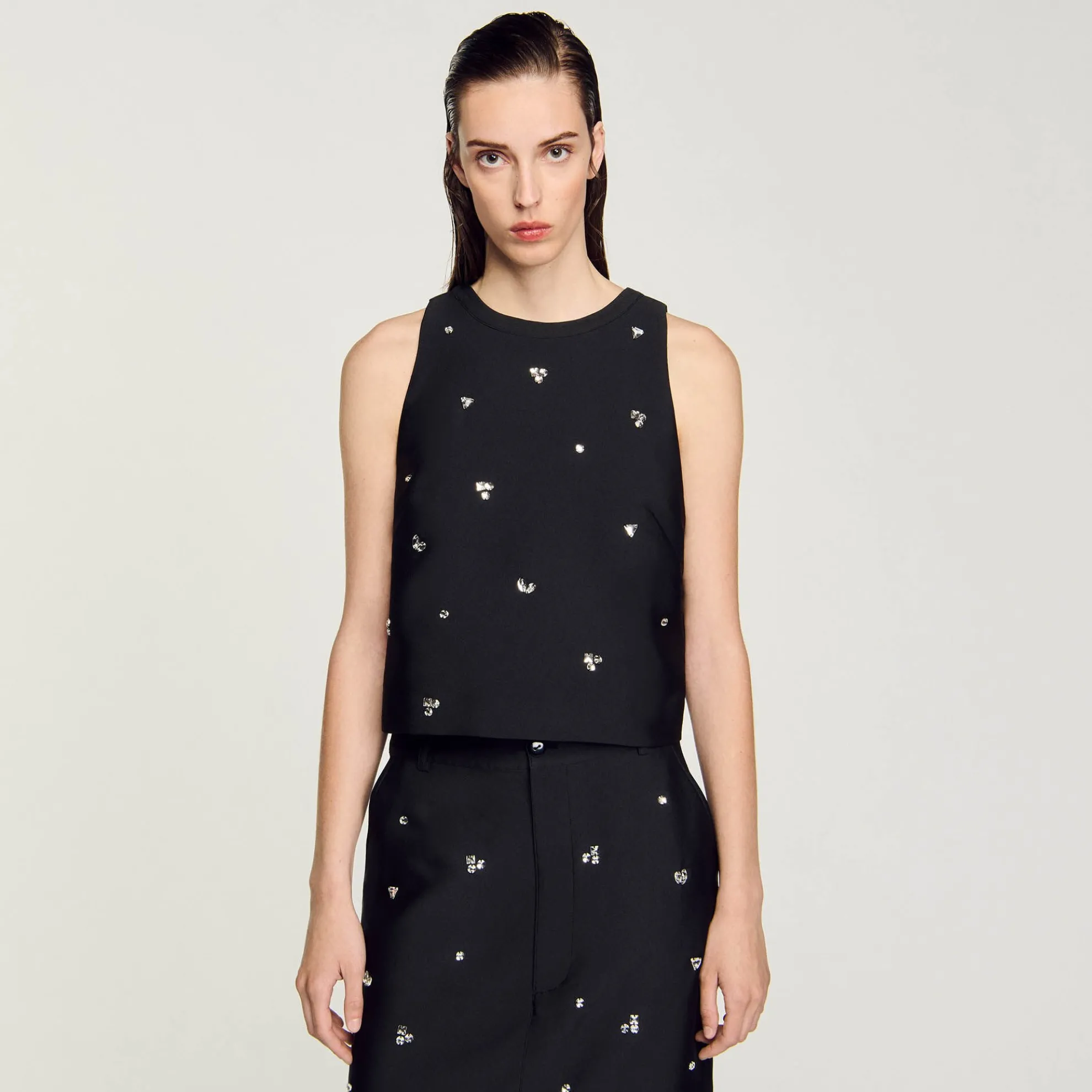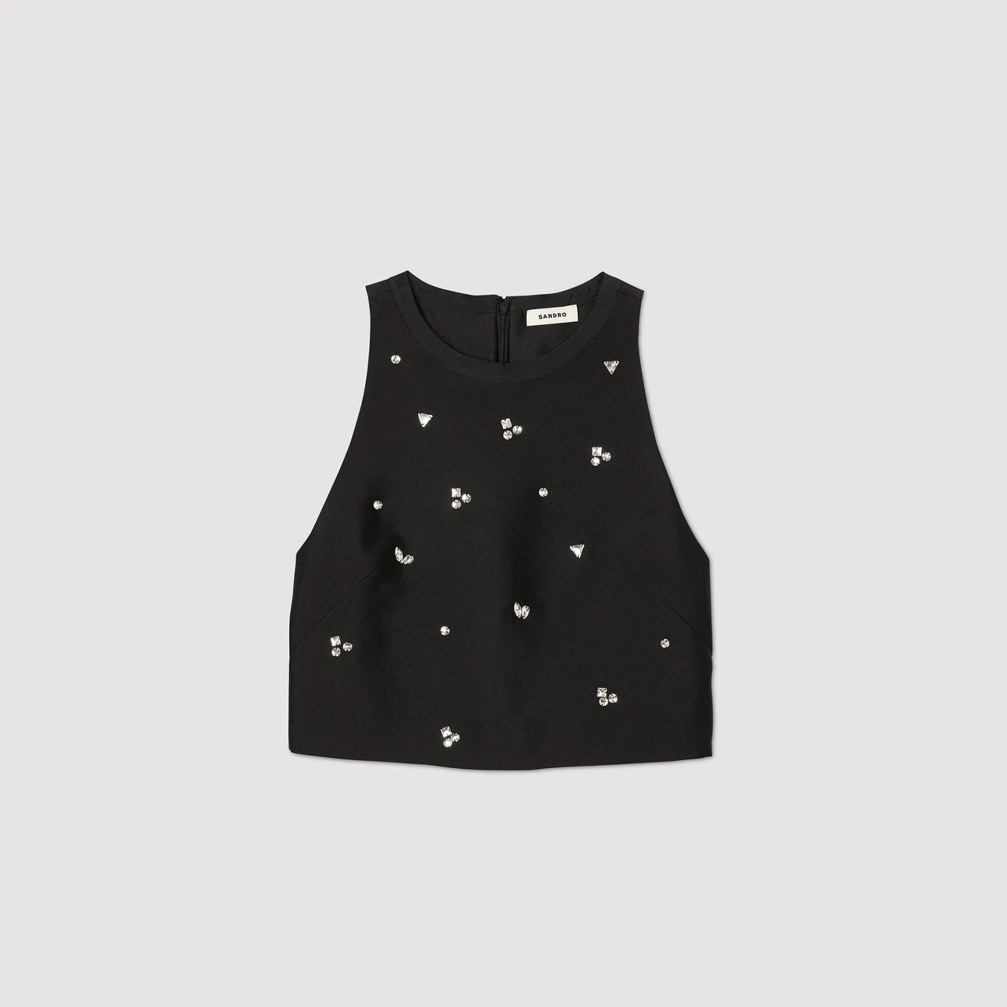 Mouwloze korte top van mix van zijde met ronde hals en all-over stras.