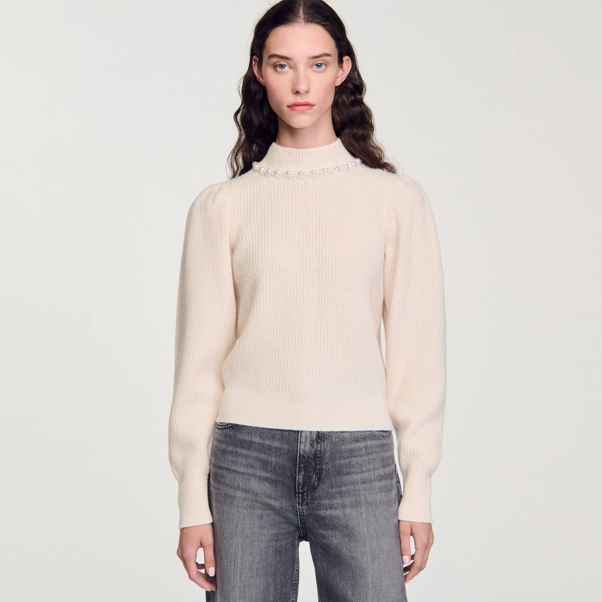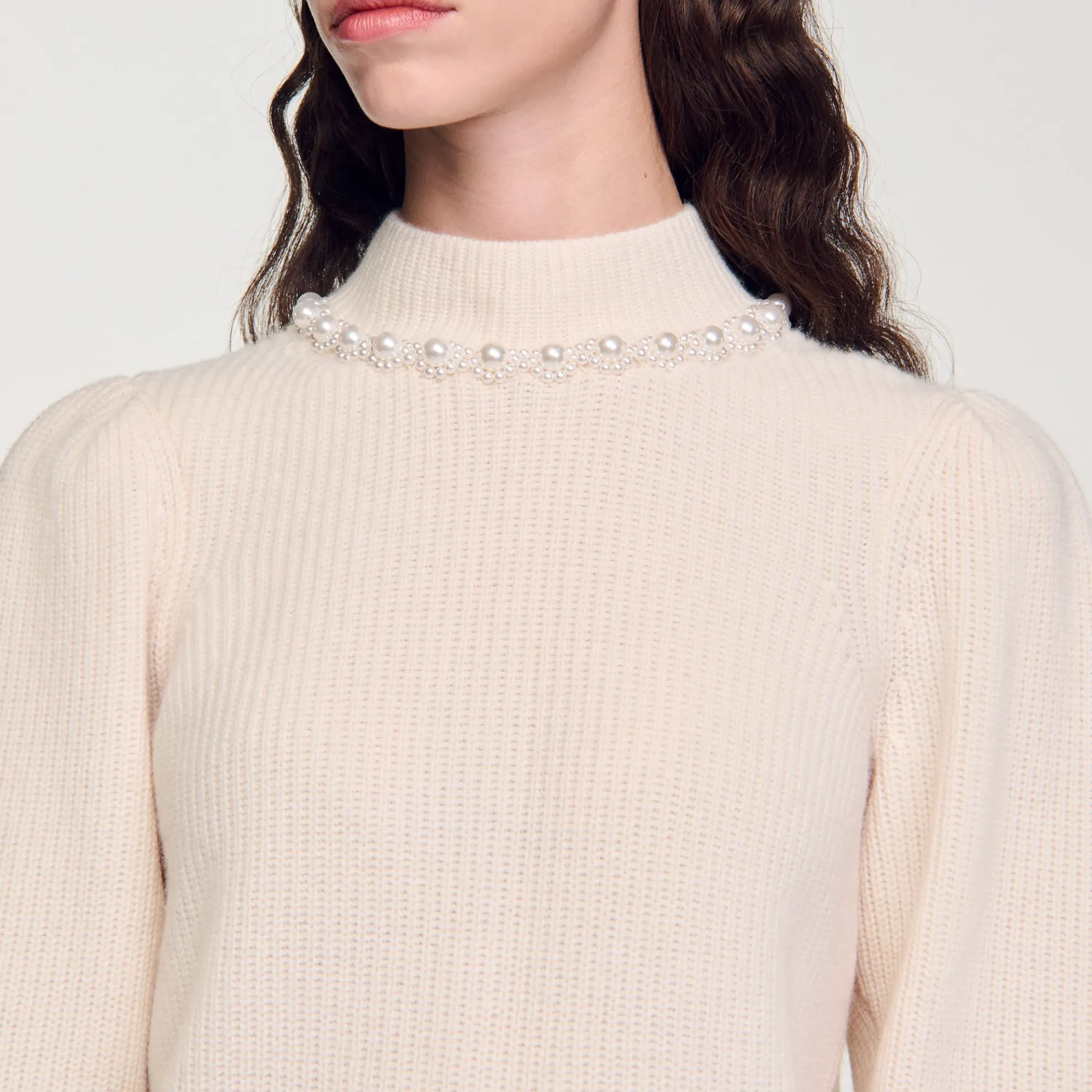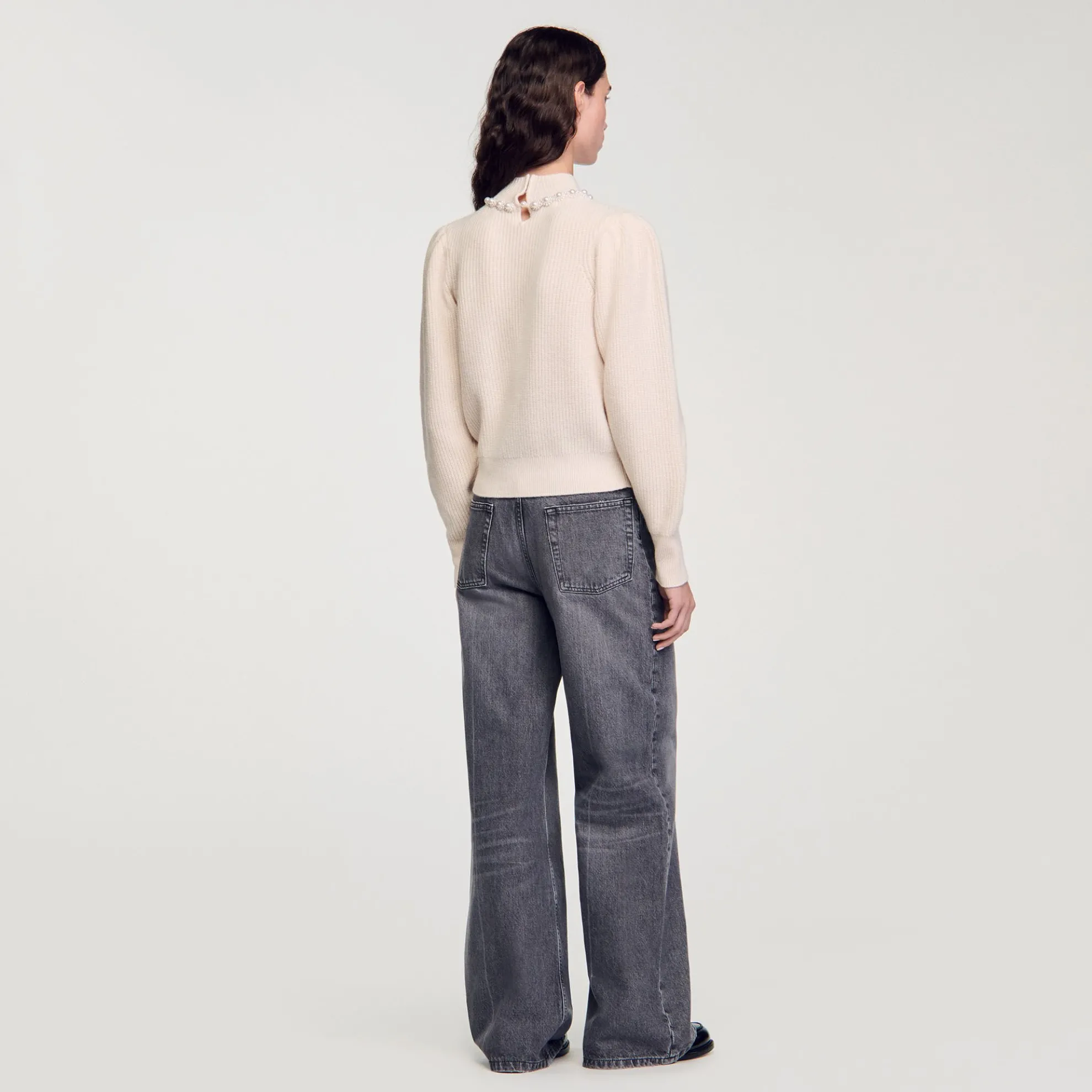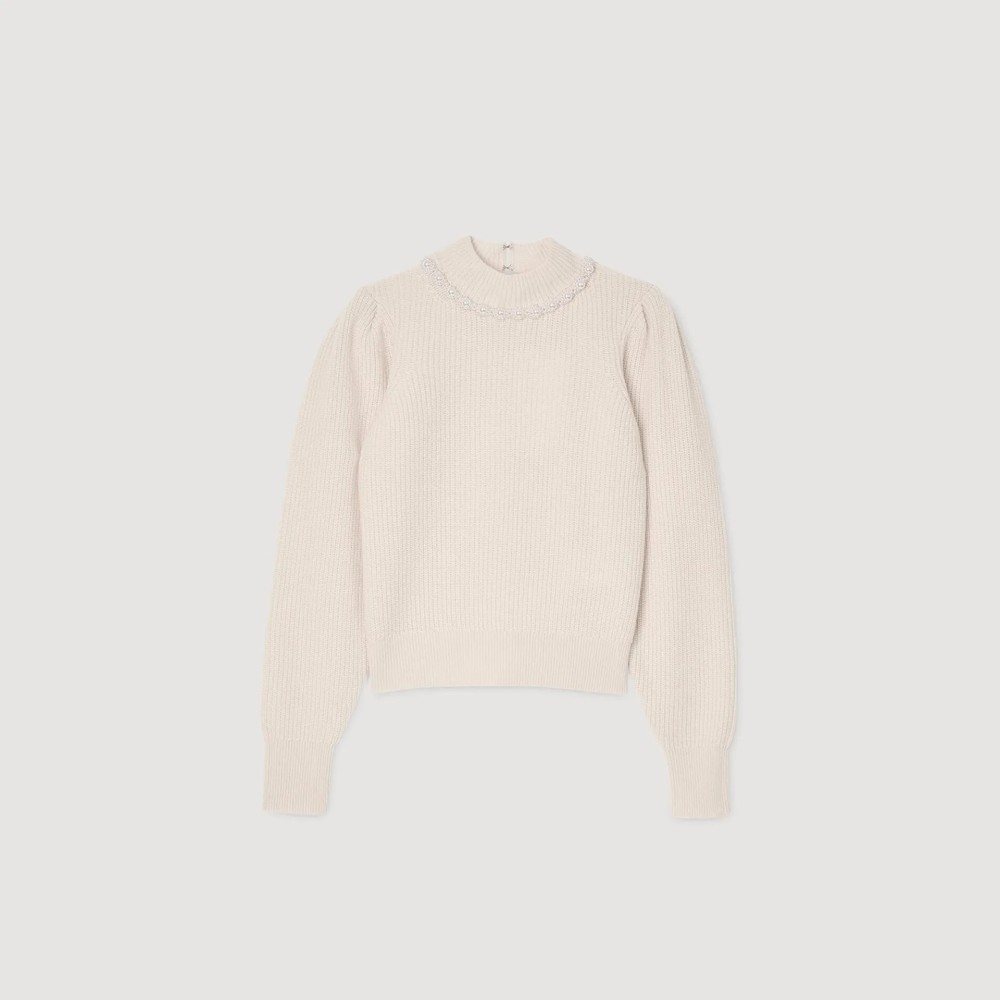Gebreide trui met wol en kasjmier voorzien van lange ruime mouwen, een hoge kraag versierd met contrasterende parels.