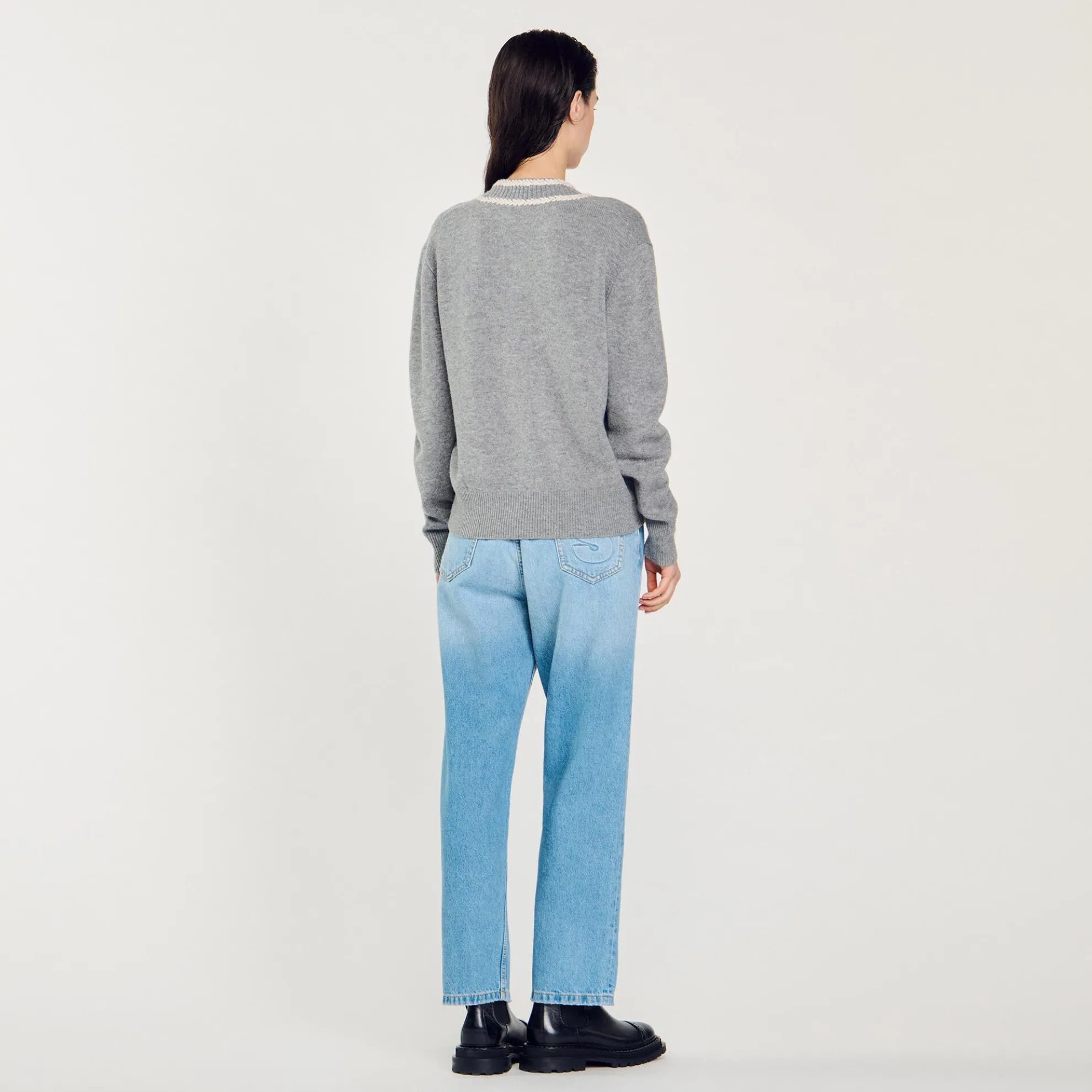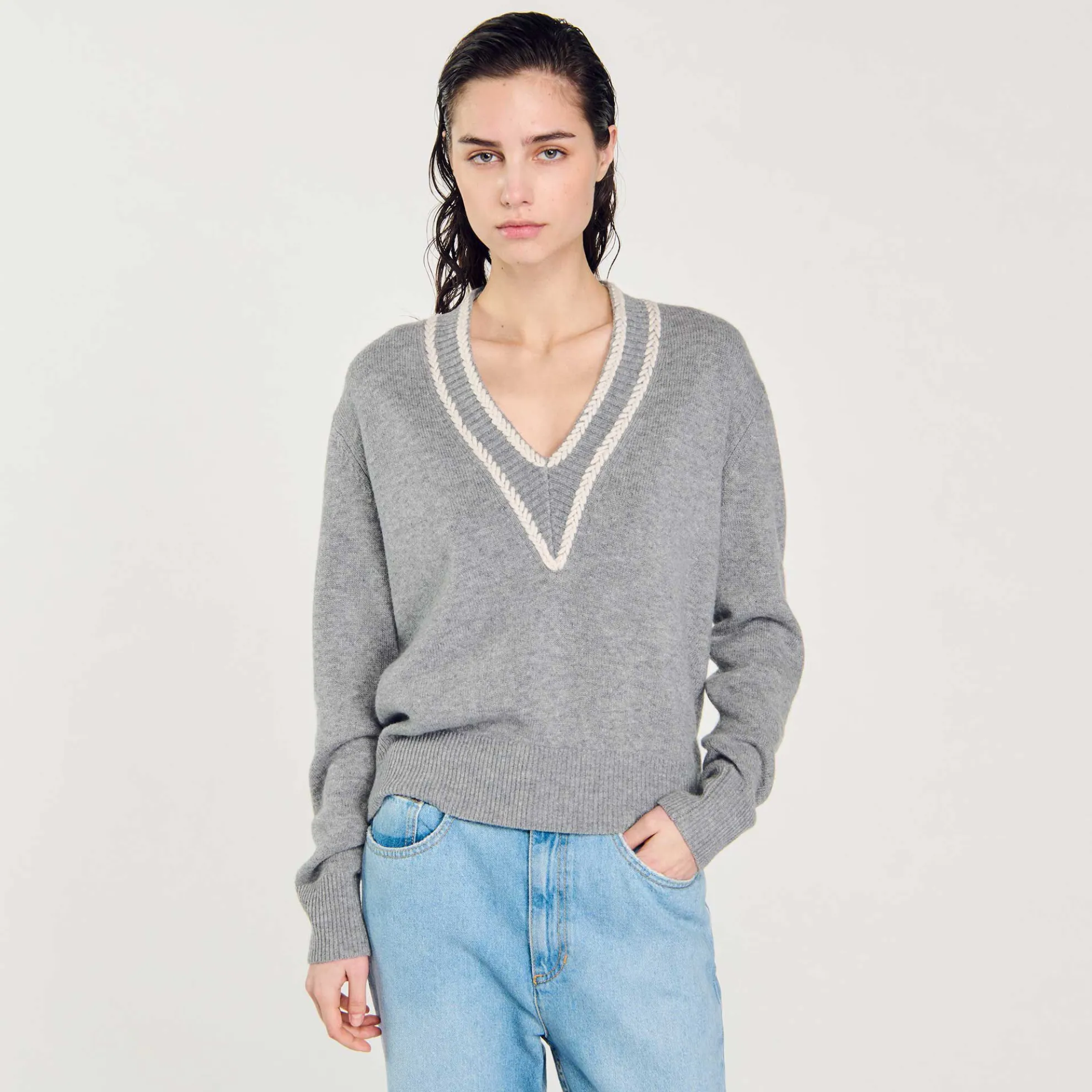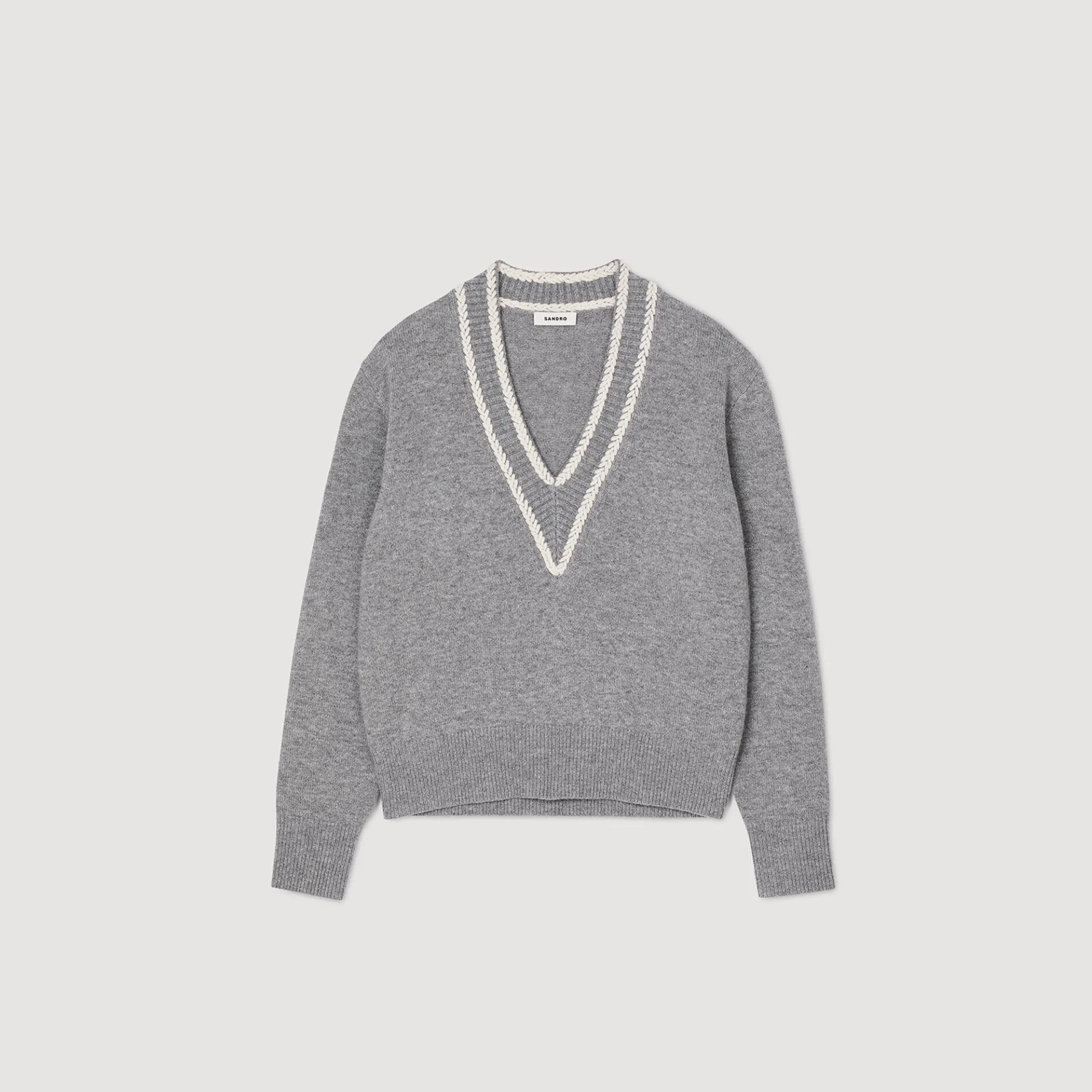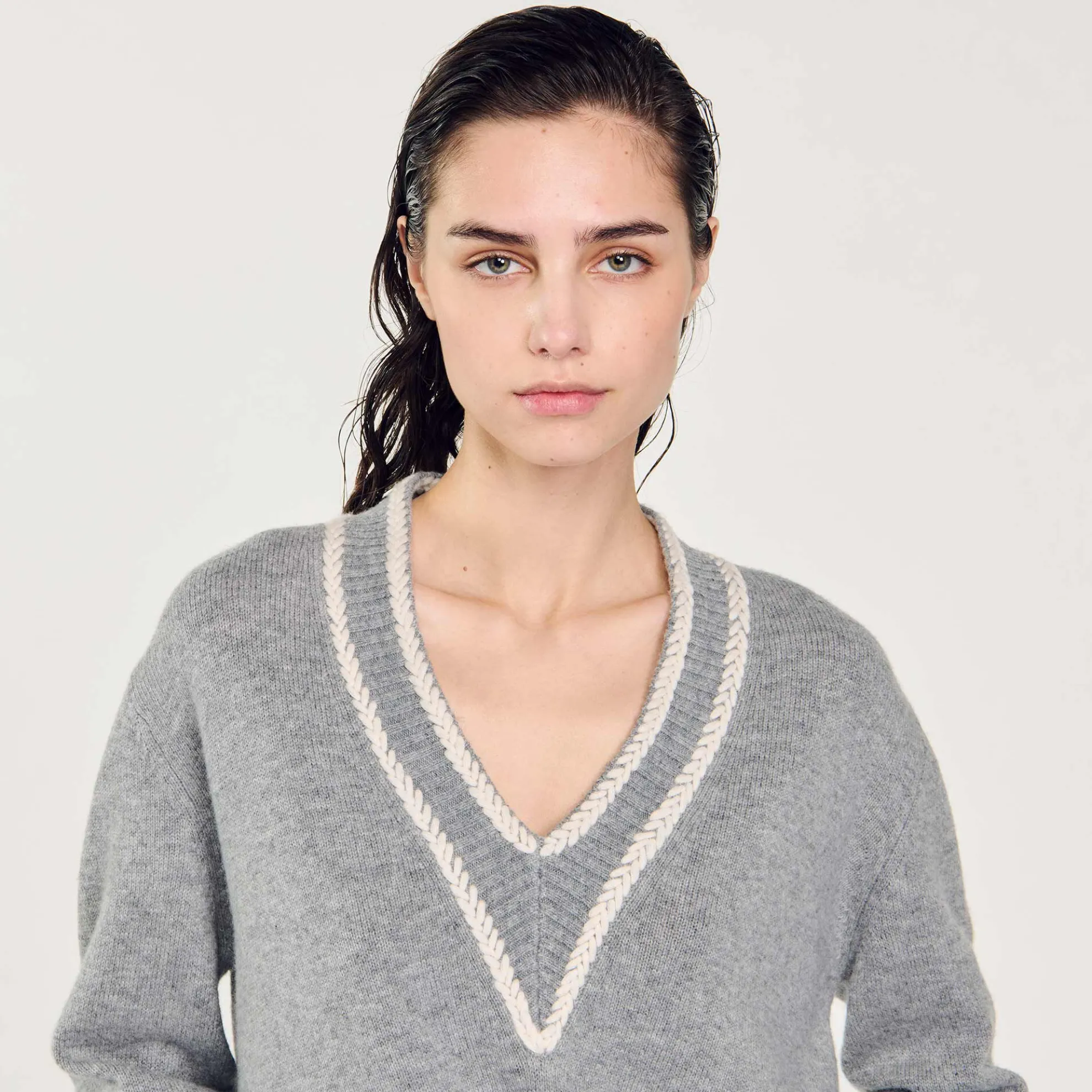 Trui van gebreide wol en kasjmier met diep uitgesneden V-hals, contrasterend gevlochten detail en lange mouwen.
