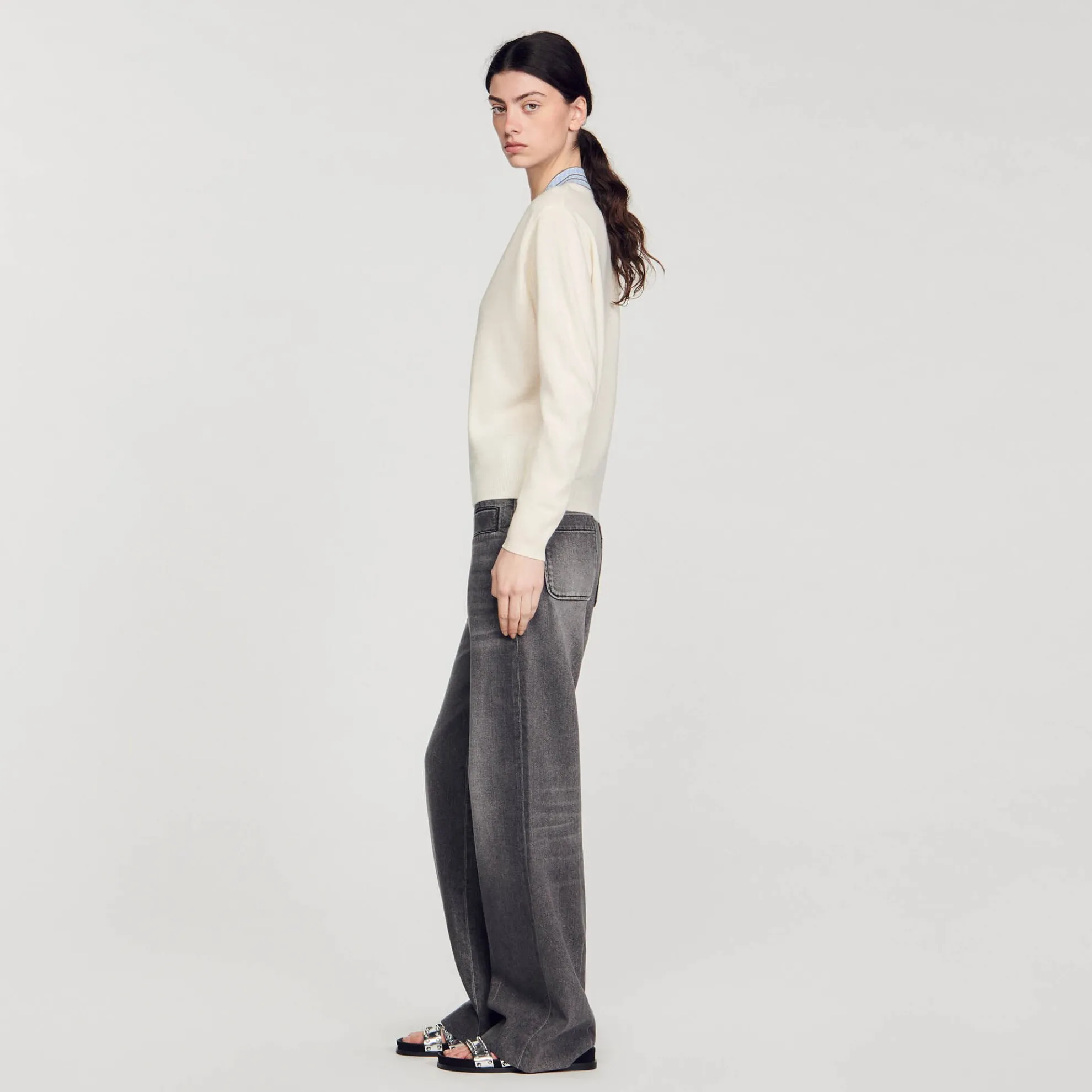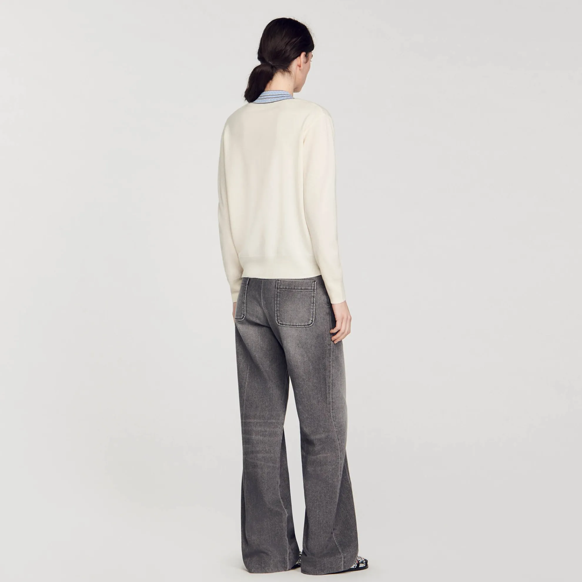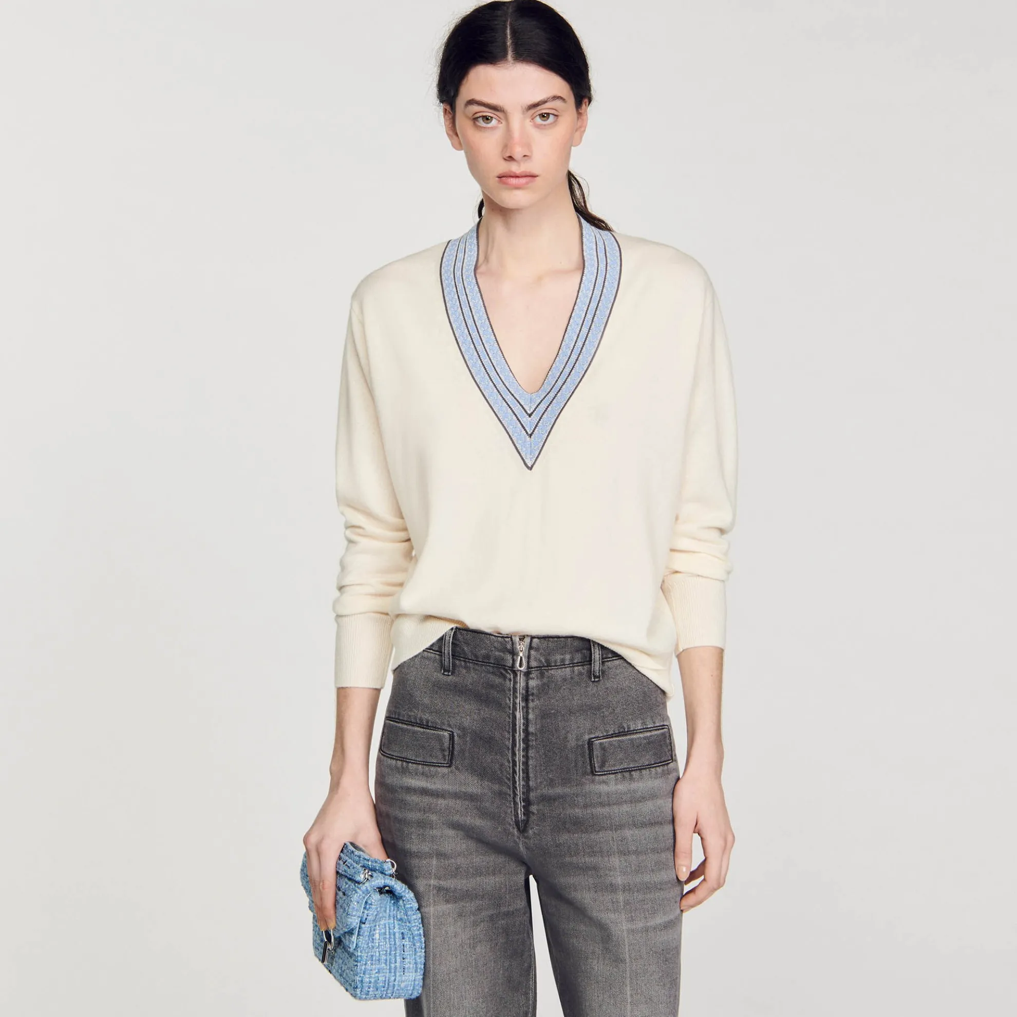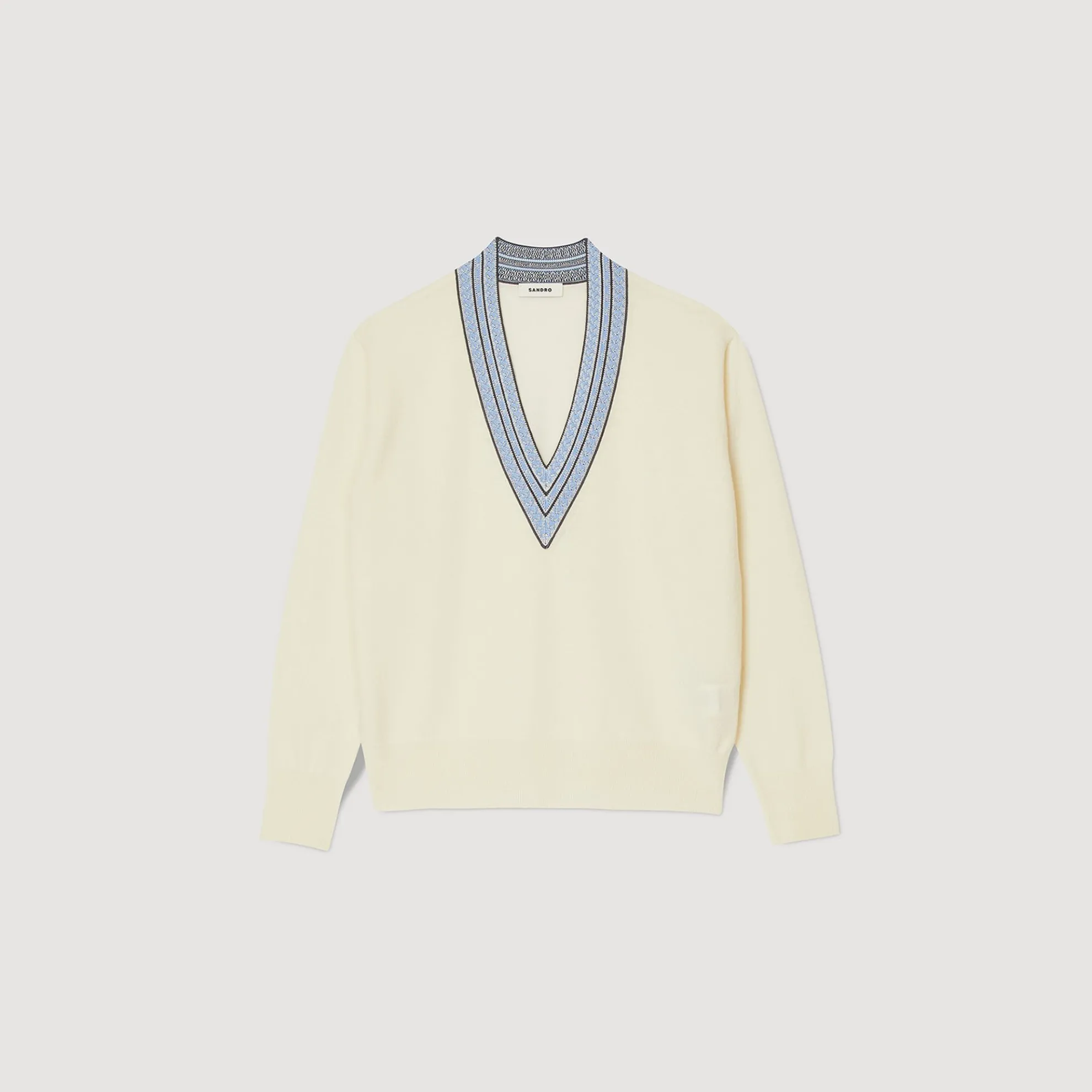 Soepelvallende trui van wol en kasjmier met lange mouwen en een V-hals met ribboorden met jacquard patroon op de halslijn.