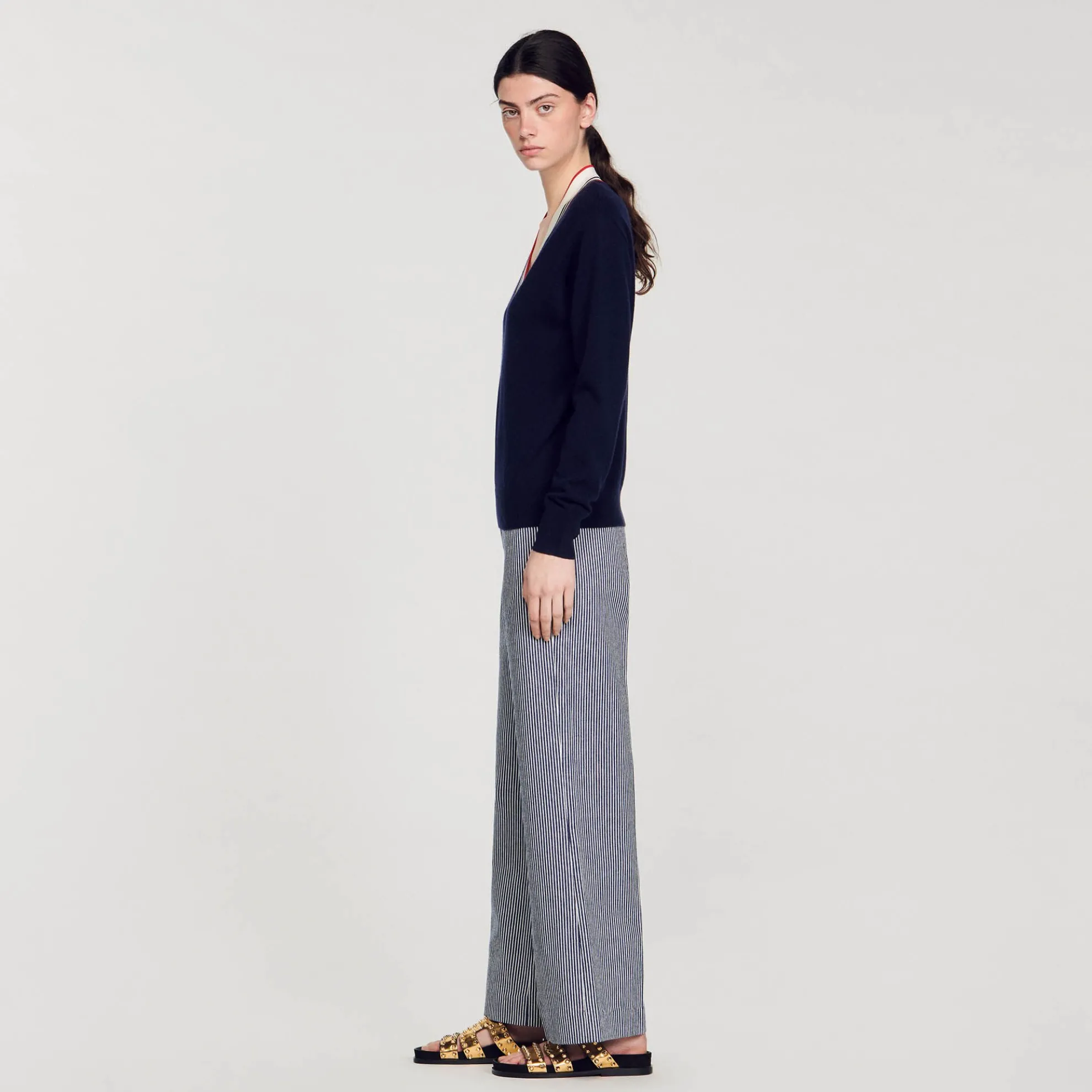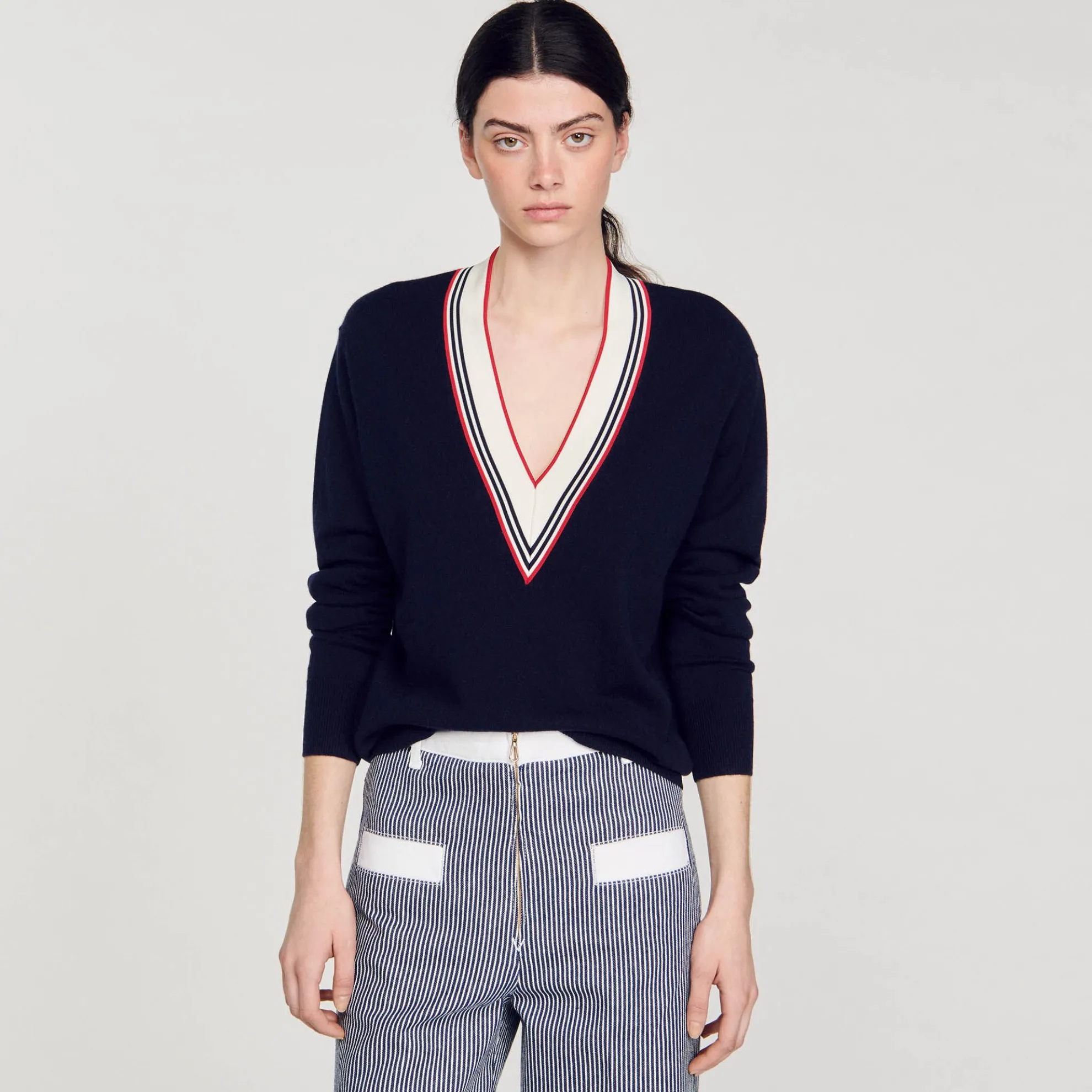 Trui van wol en kasjmier met gestreepte V-hals en lange mouwen versierd met strepen bij de halslijn.