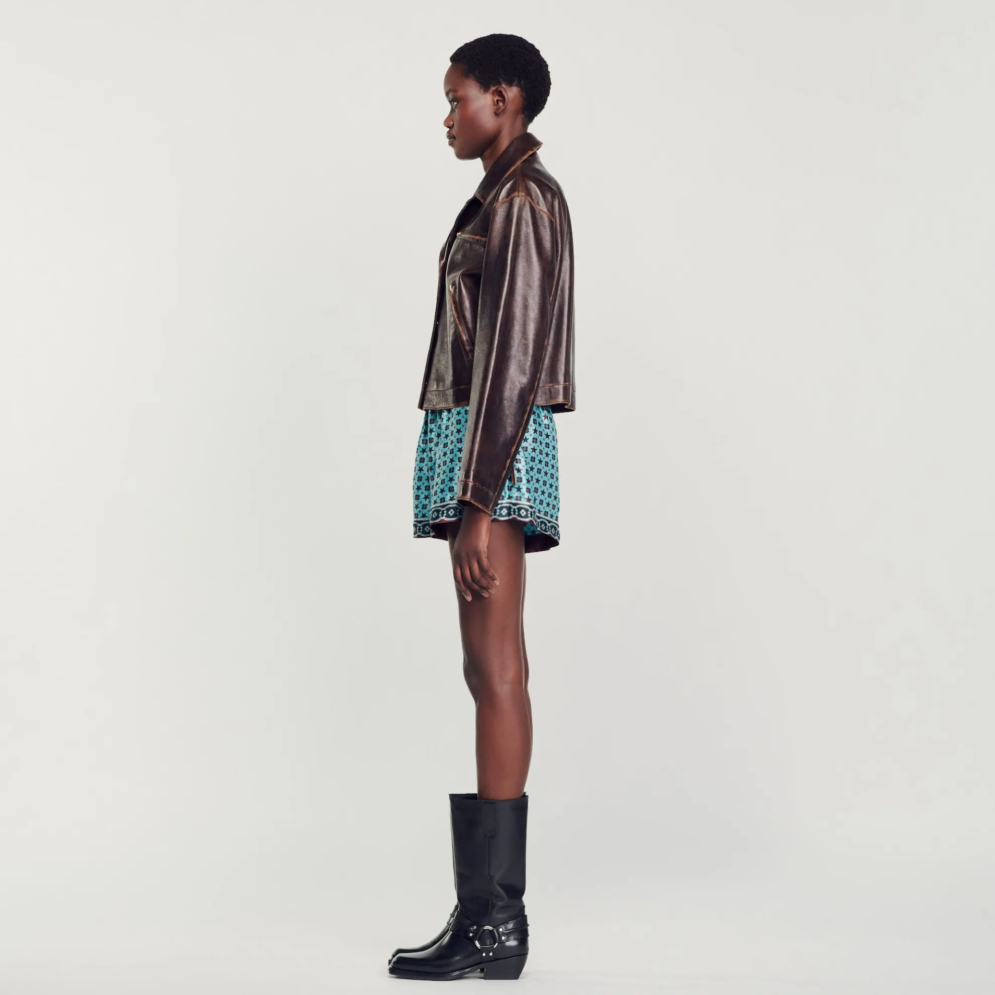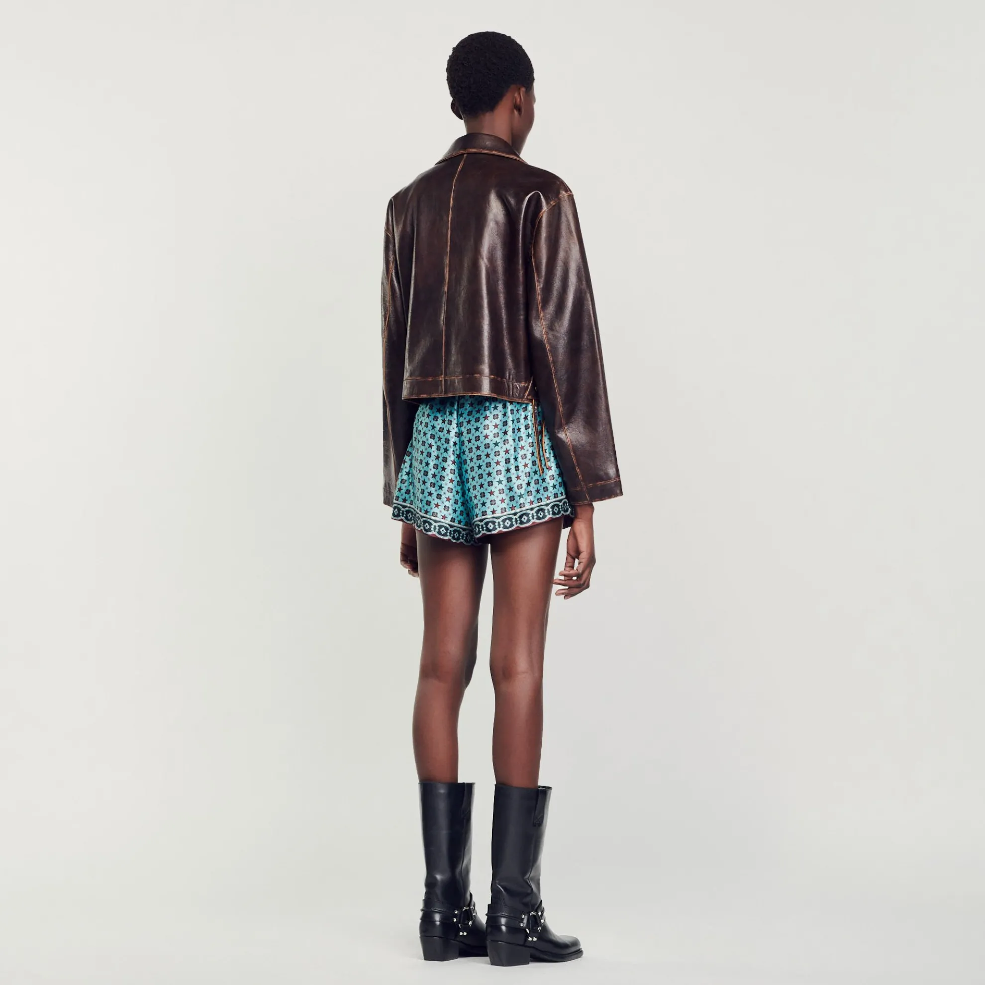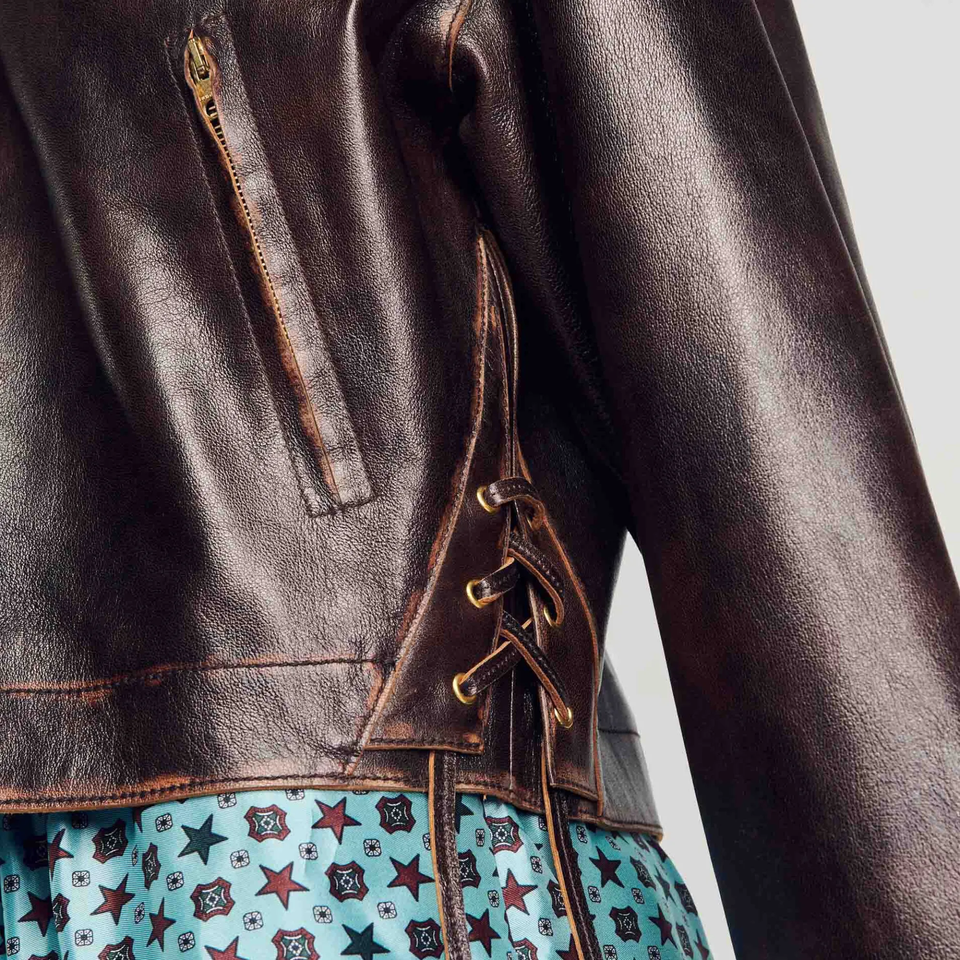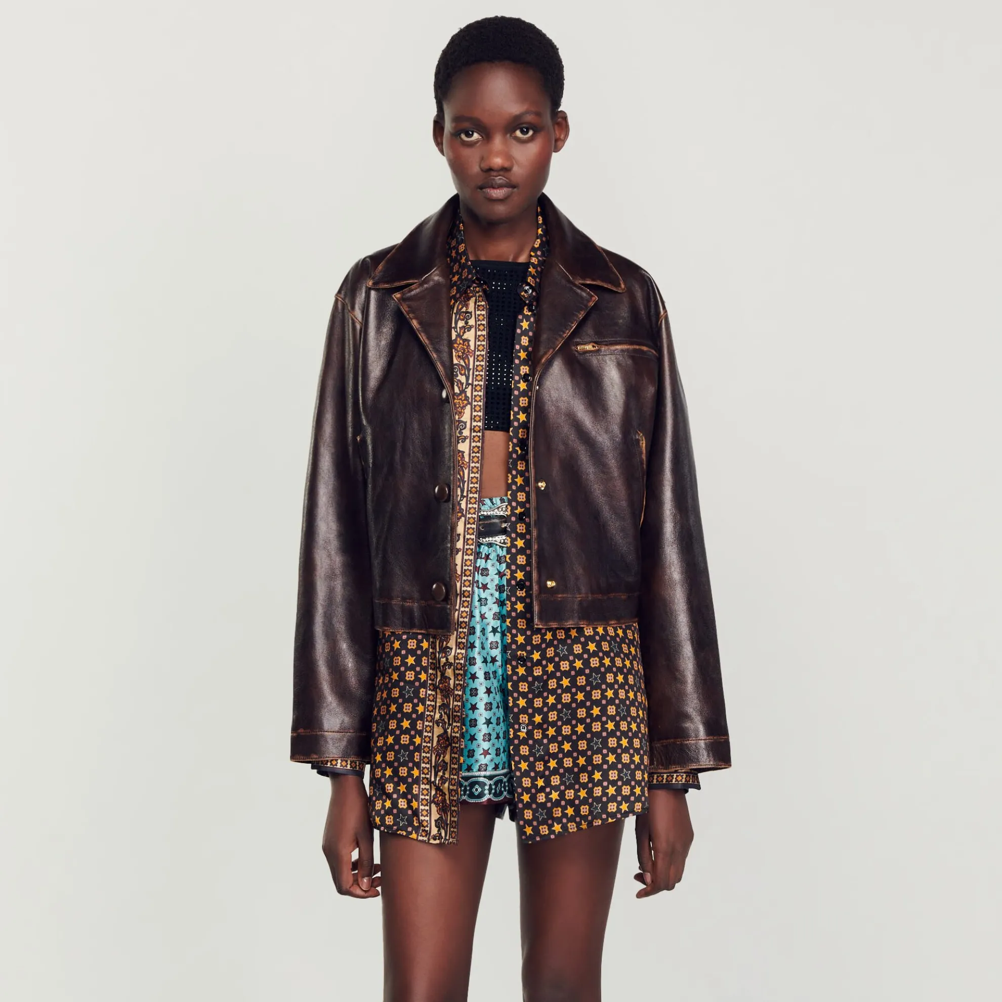 Jack in verouderd leer met vintage look, met lange mouwen, een brede kraag, een sluiting met drukknopen, zakken met rits en versierd met veterdetails aan de zijkanten.