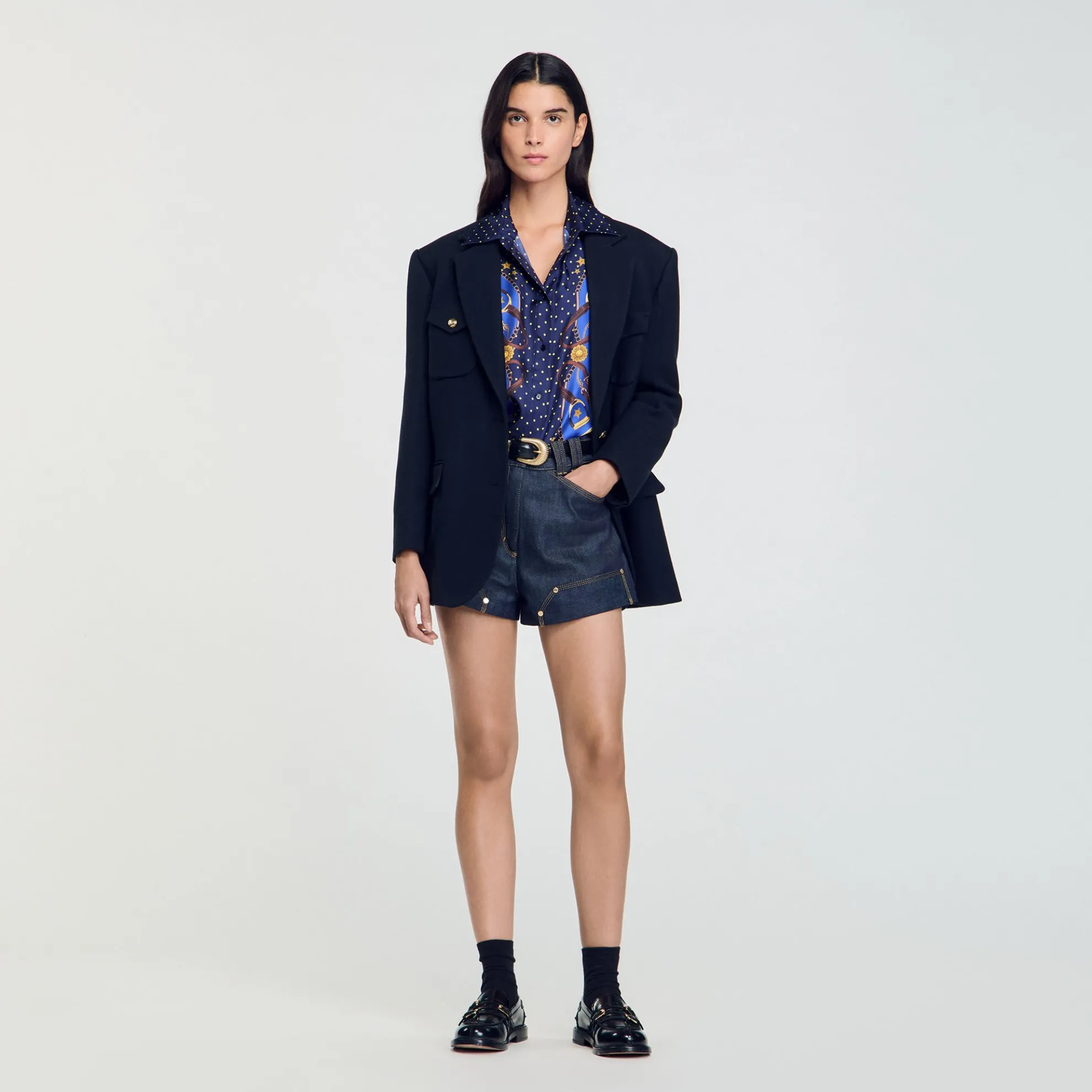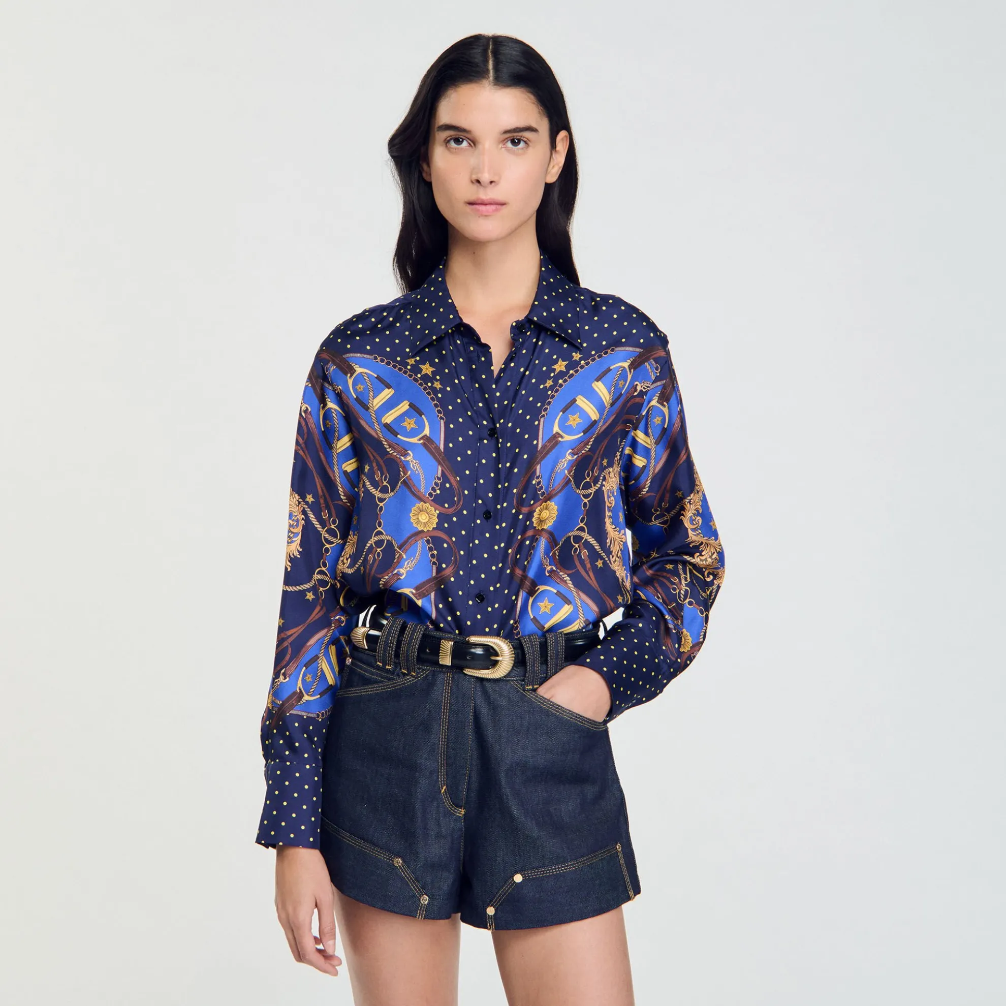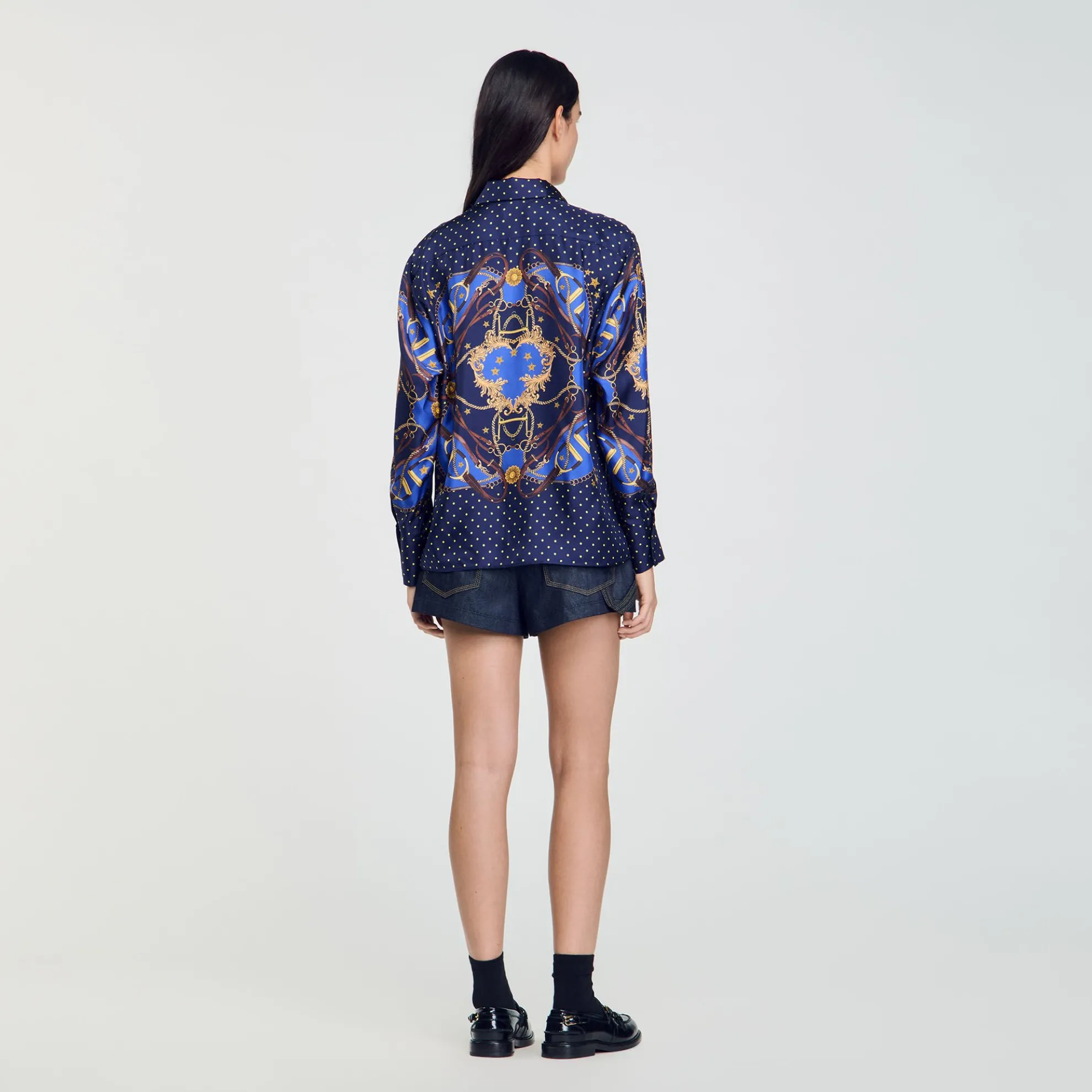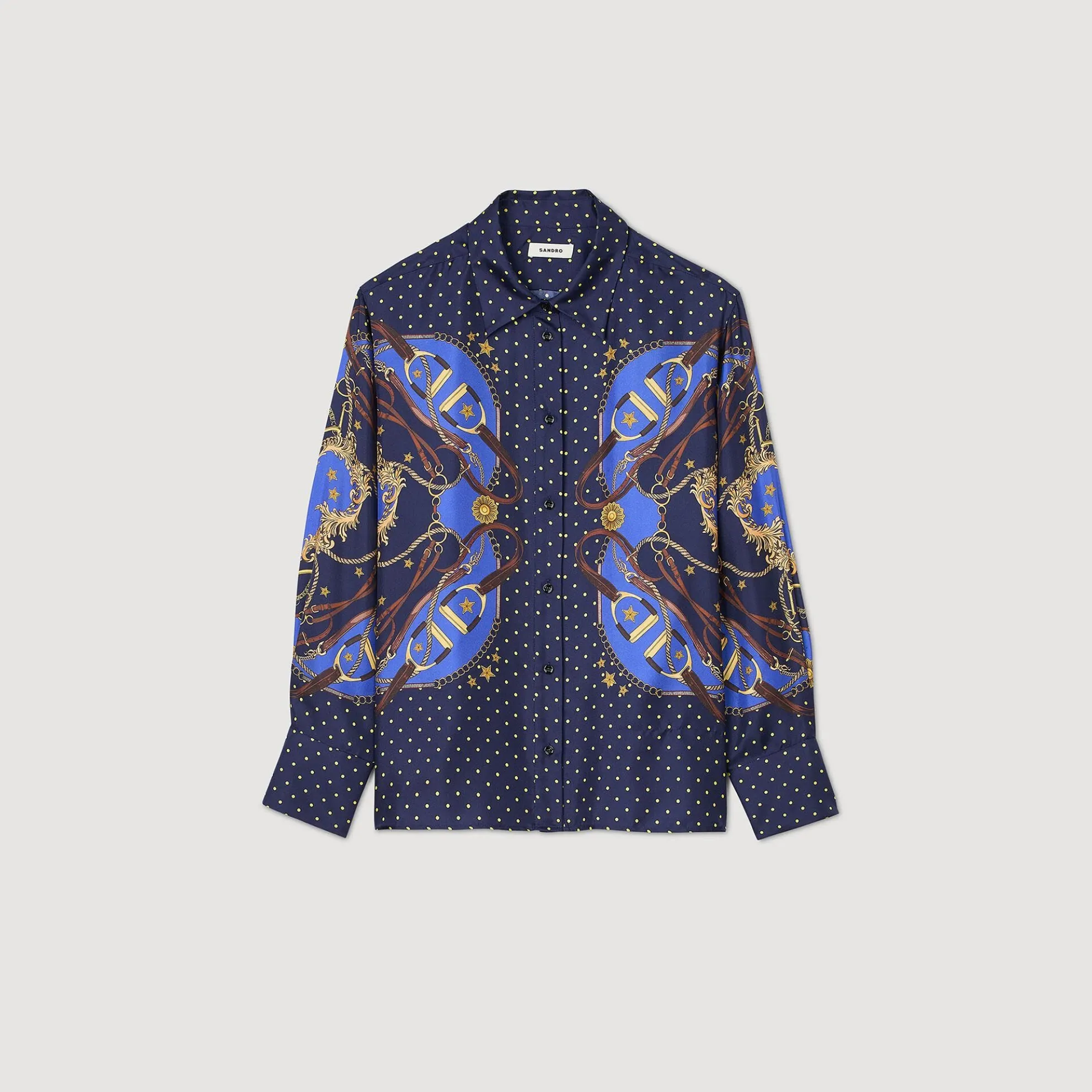Lange wijde zijden blouse met print, met overhemdkraag, lange mouwen met knoopmanchetten en een knoopsluiting.